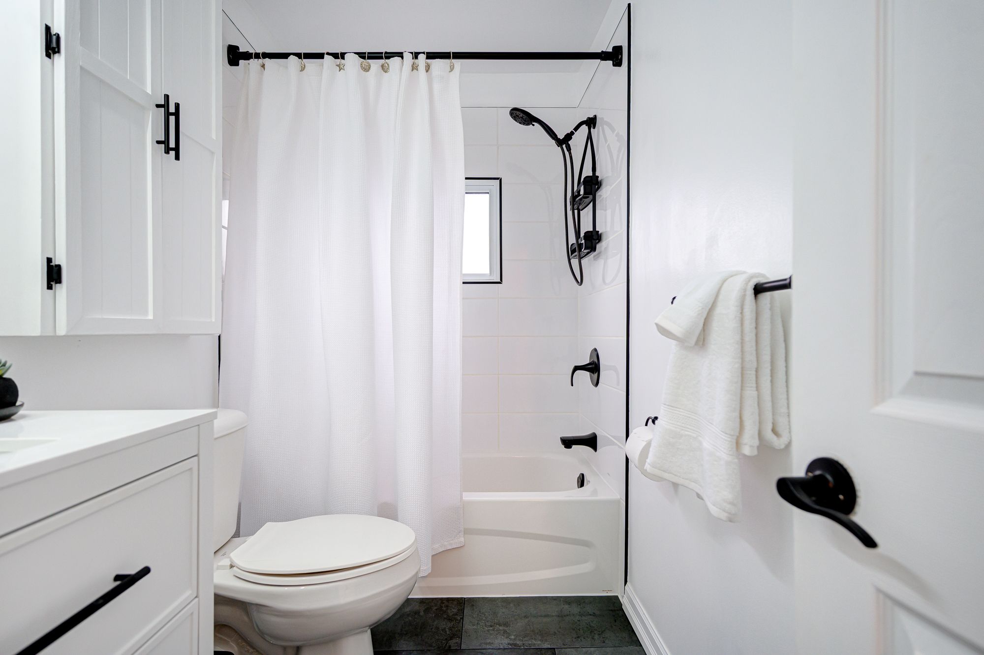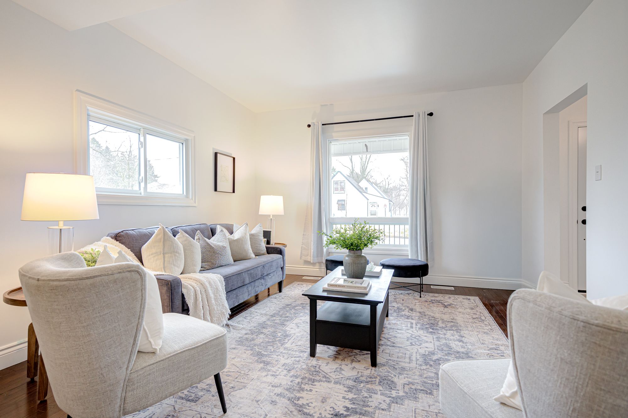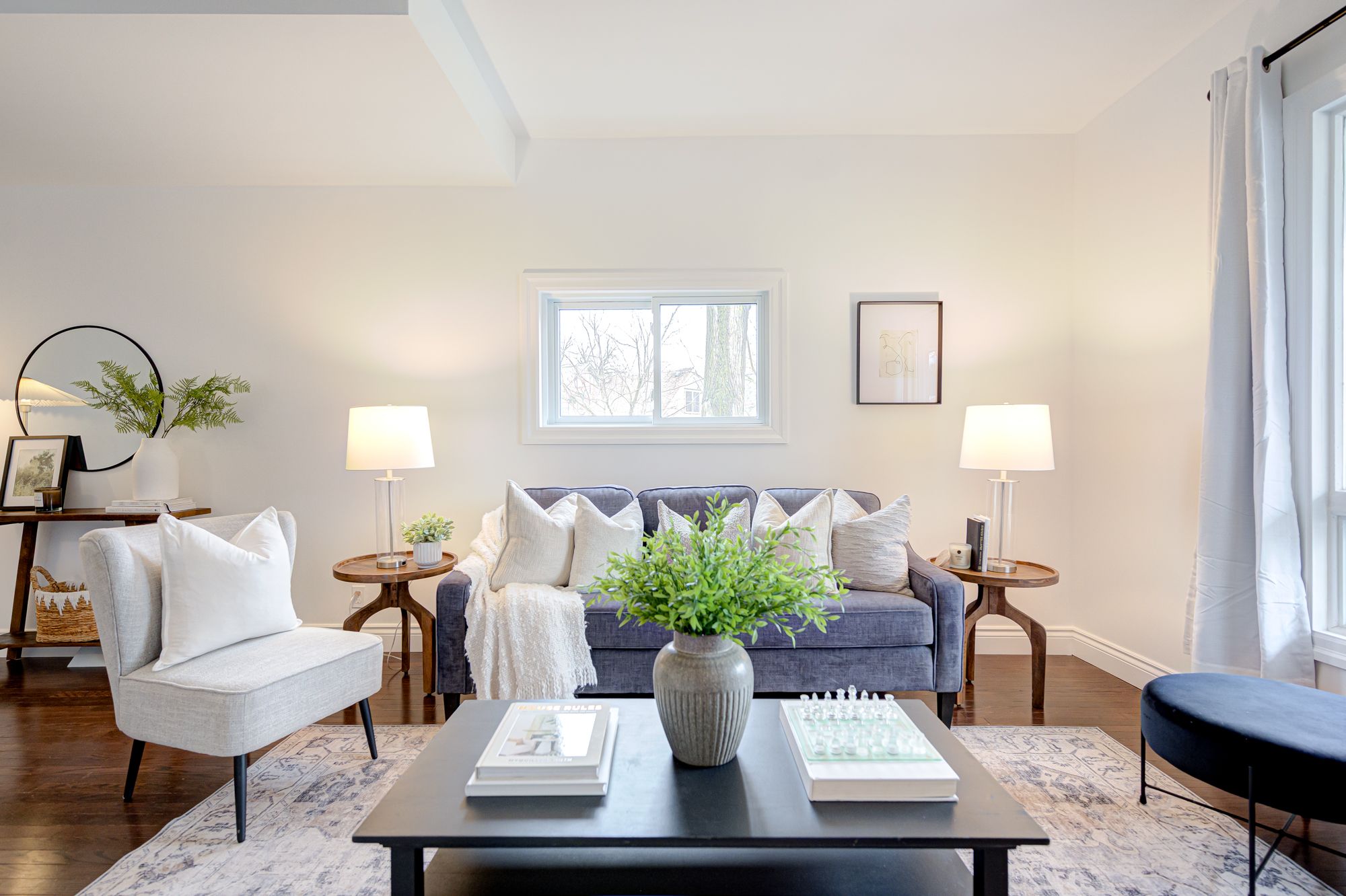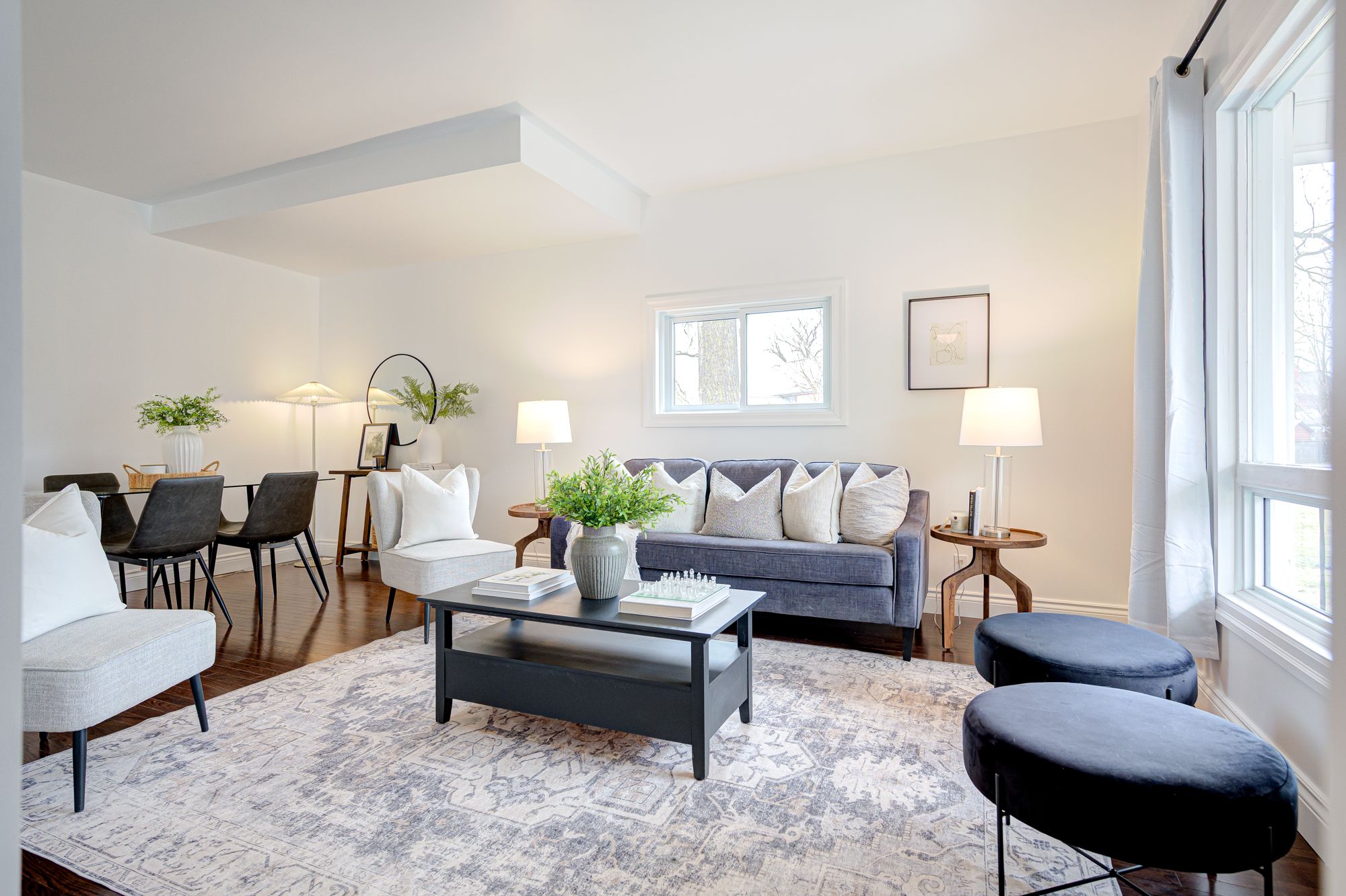 • Bright, airy living space with rich hardwood and luxury vinyl flooring.
