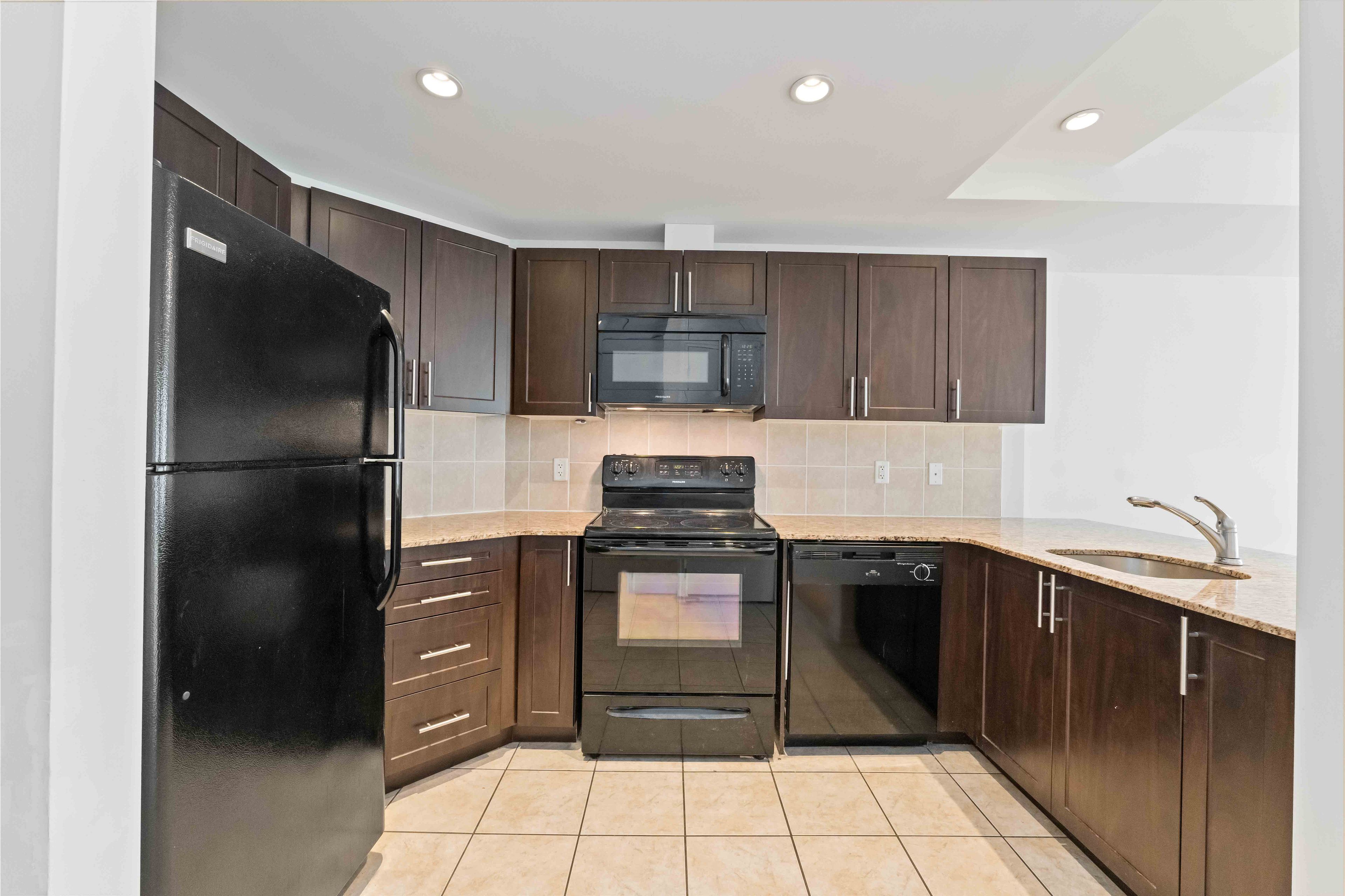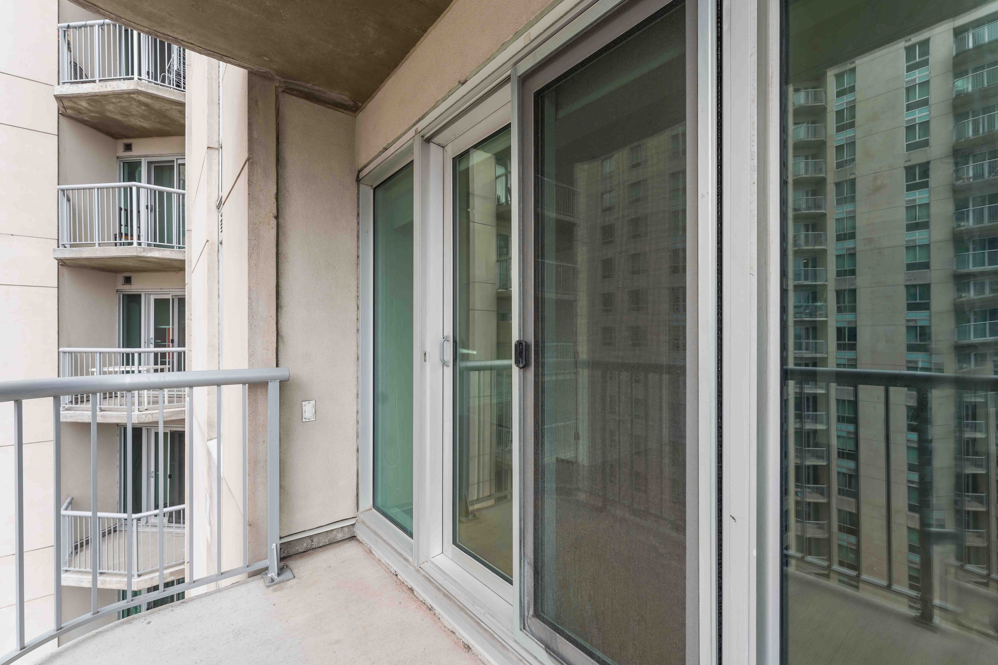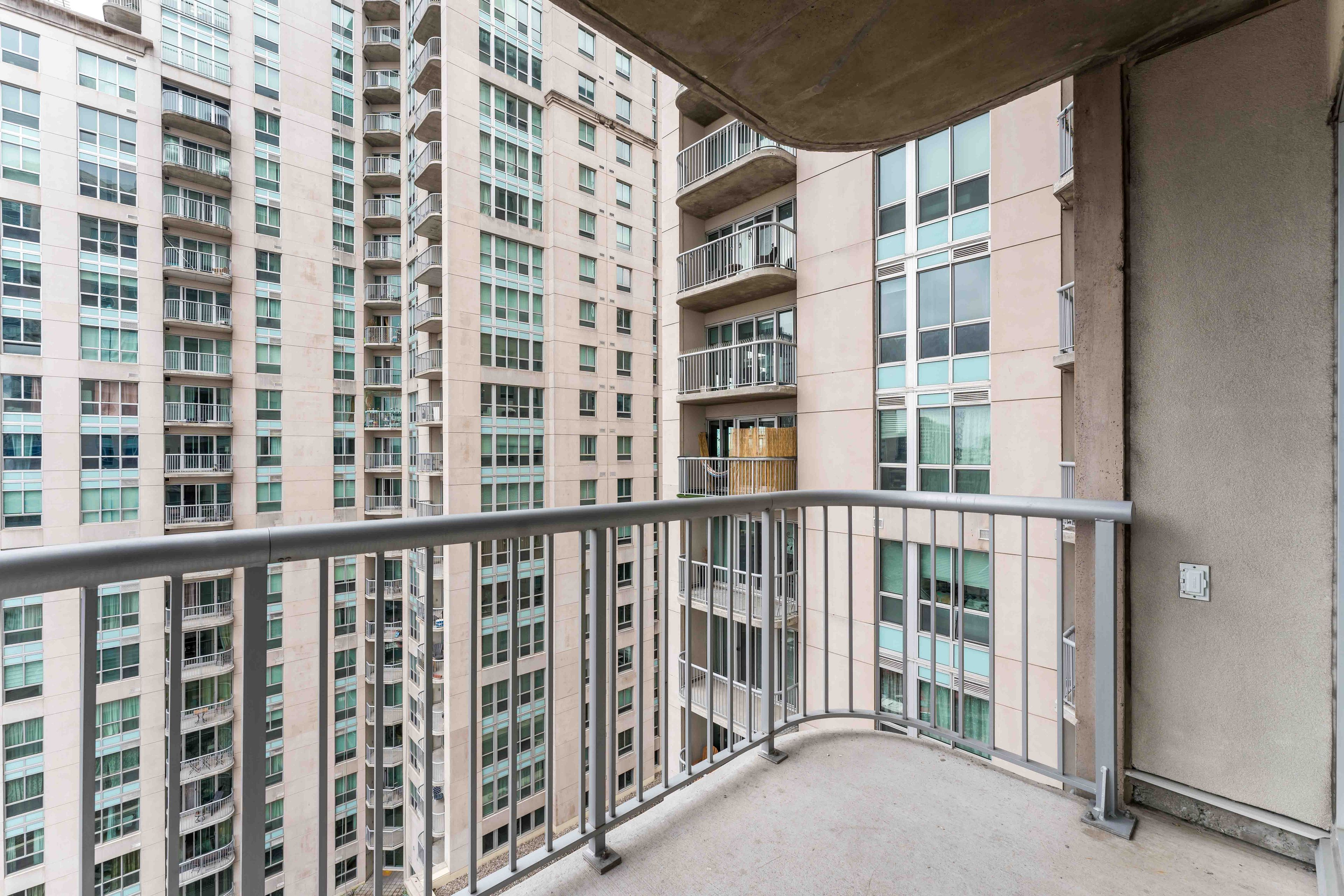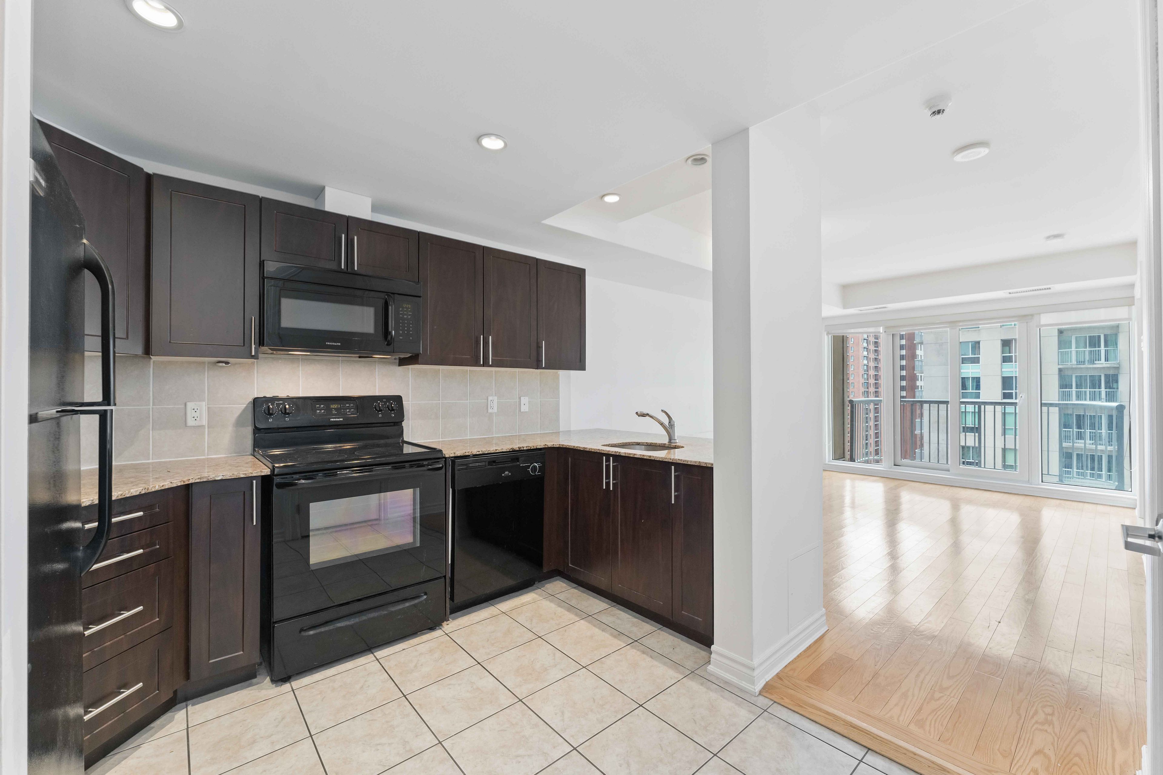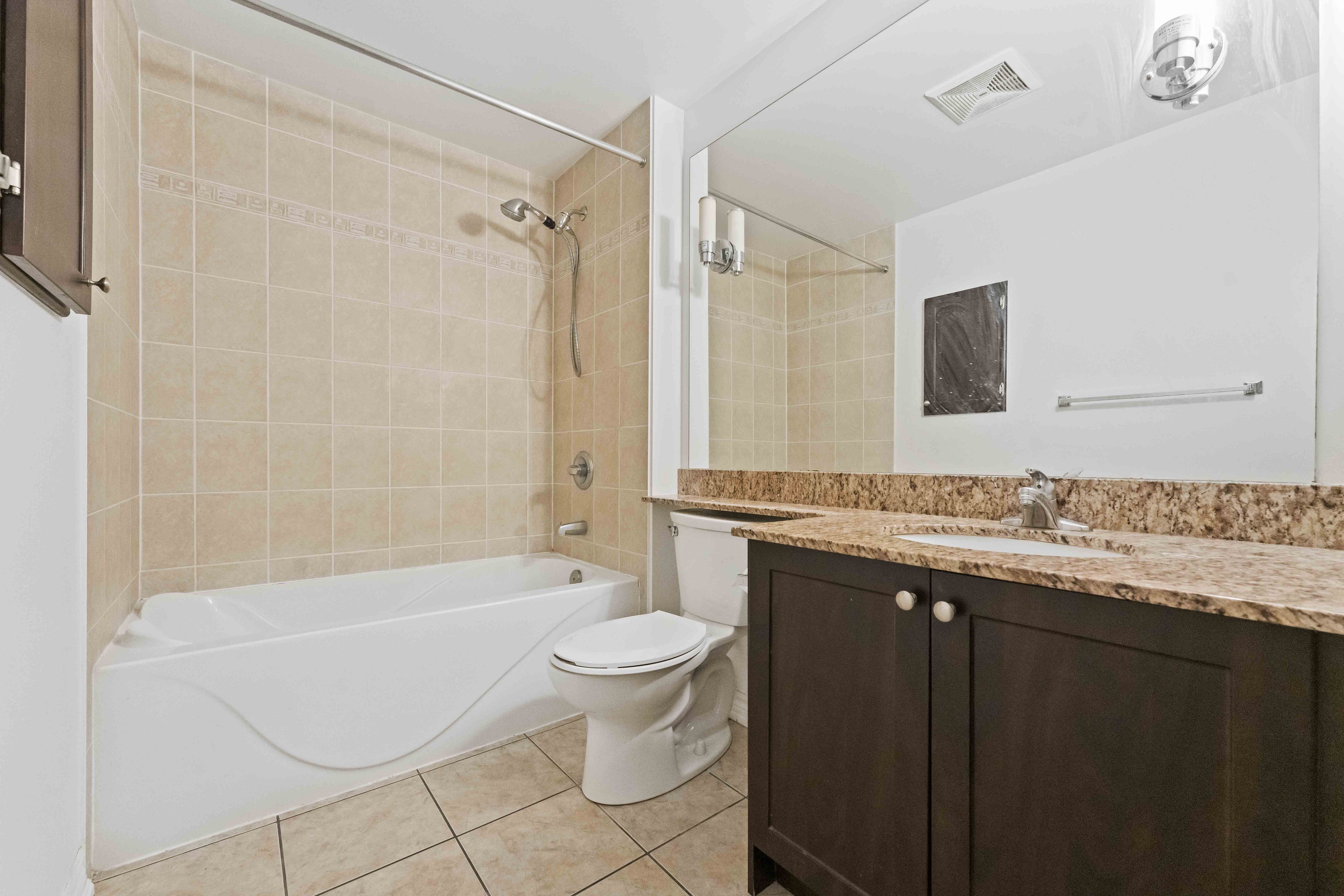 • Private balcony and modern granite countertops enhance living experience.