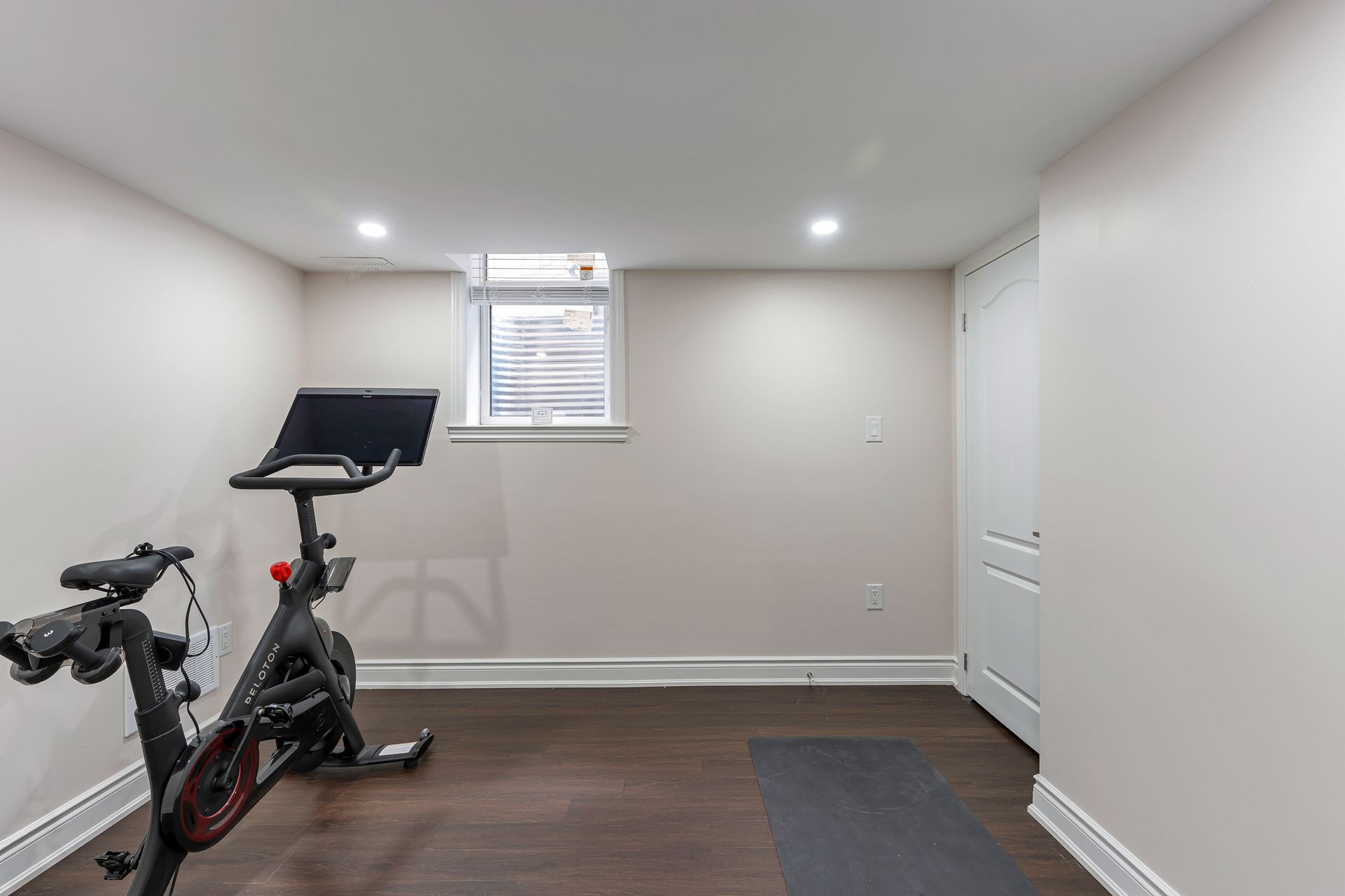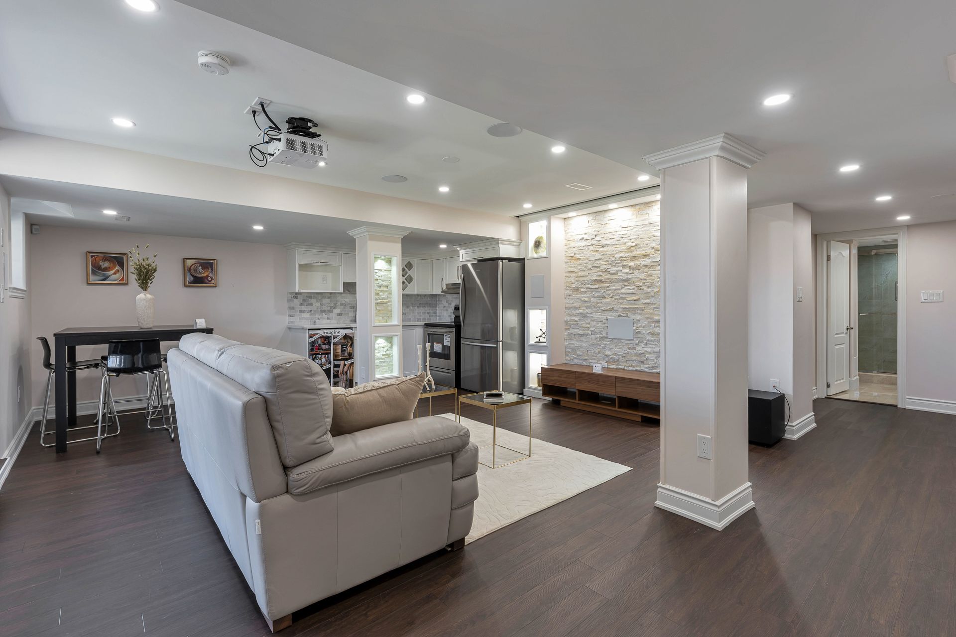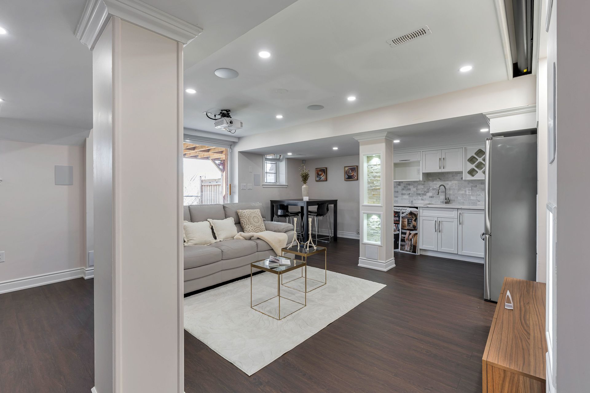• Versatile walkout basement configured as an entertainment zone with home theatre.