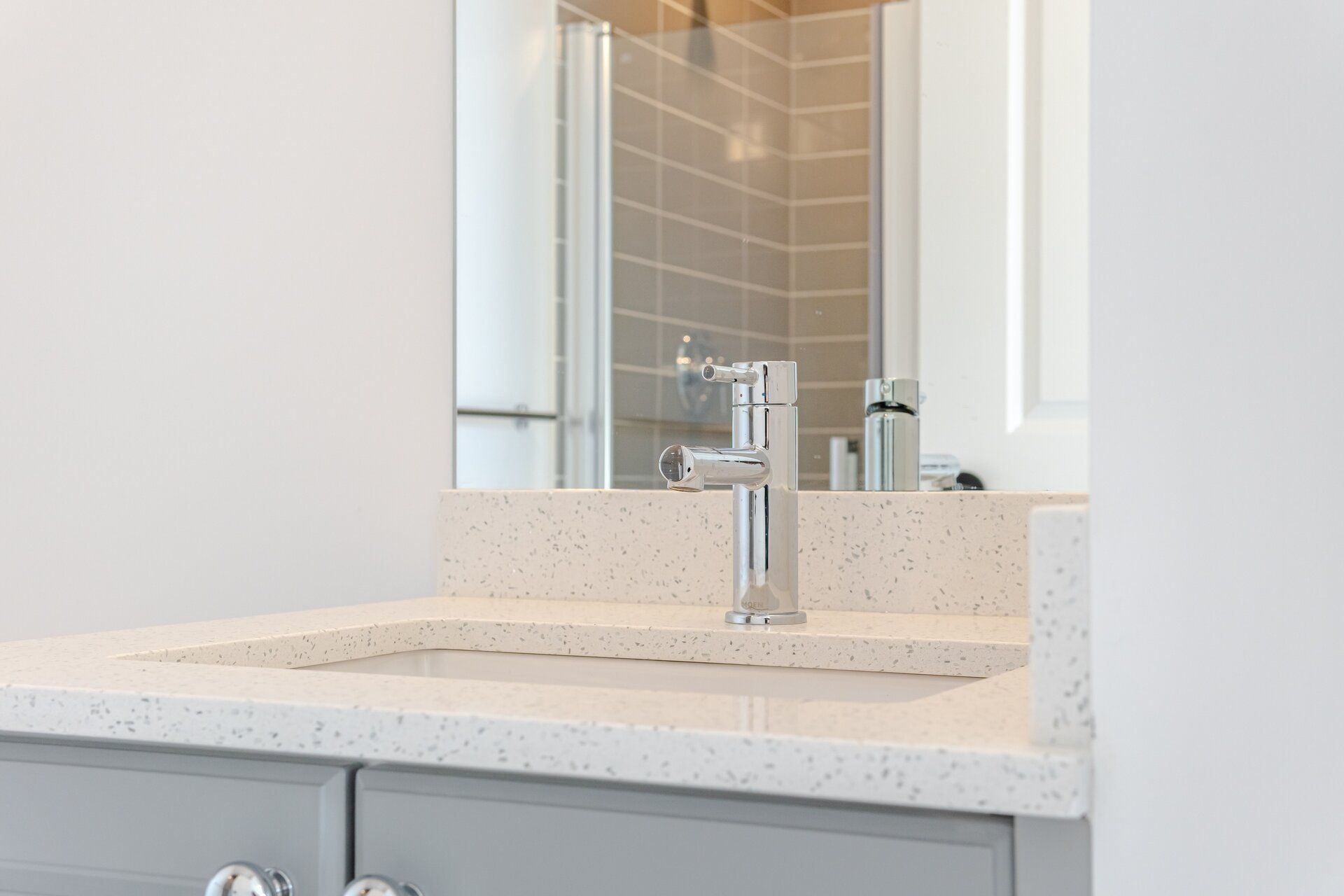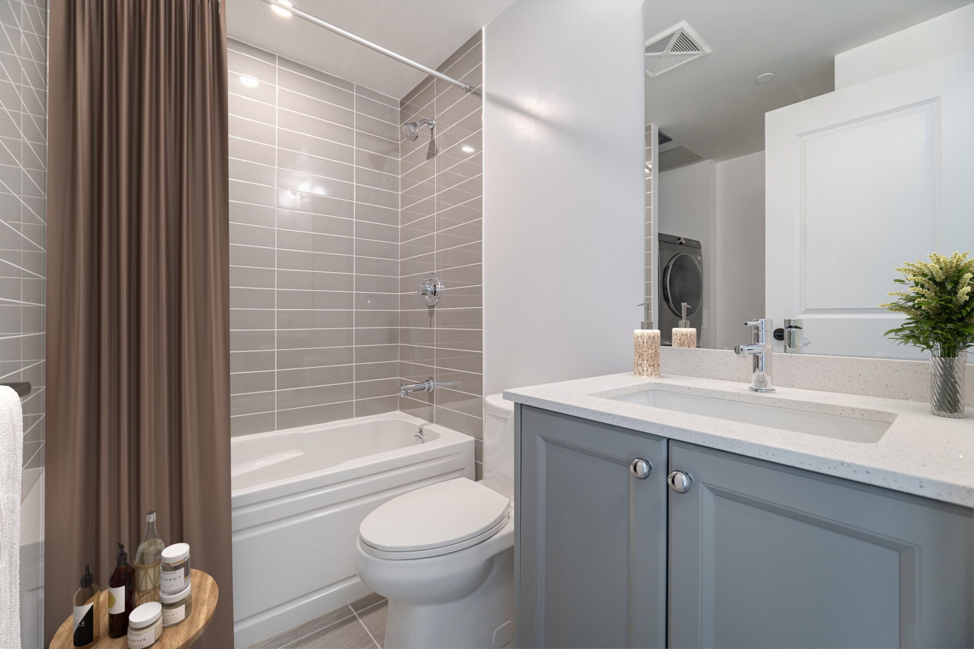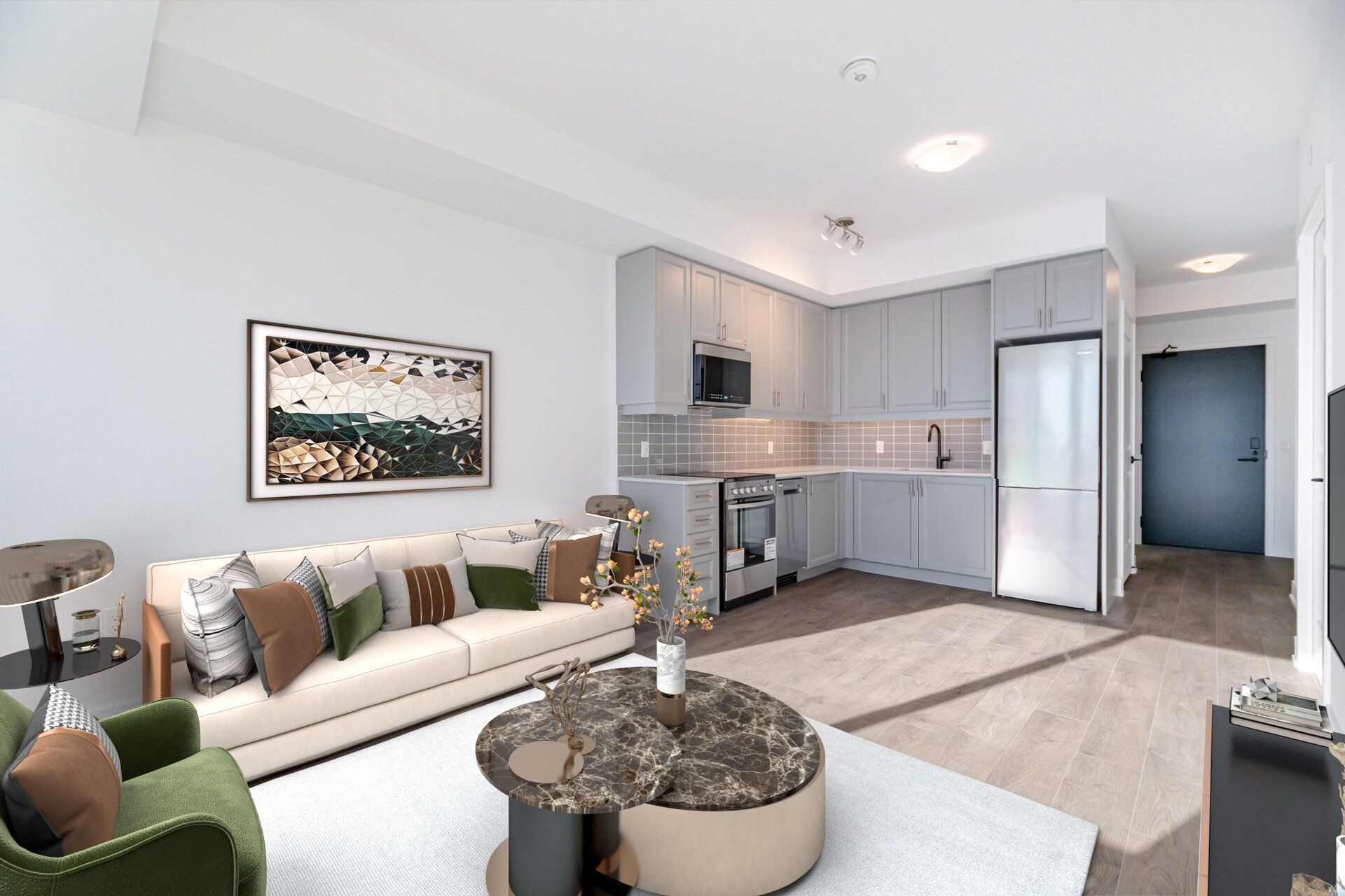 • Modern kitchen featuring quartz countertops and stainless steel appliances.