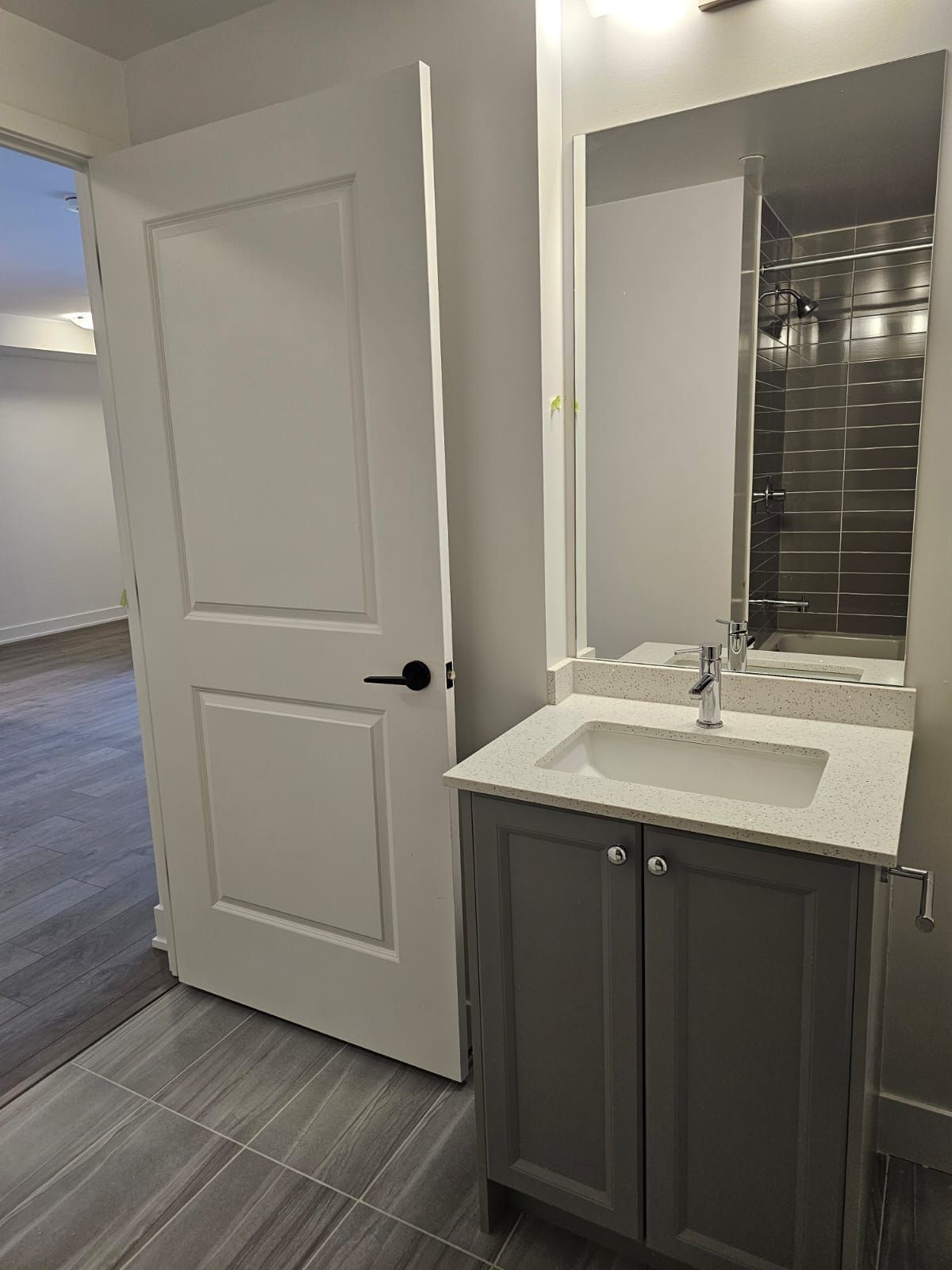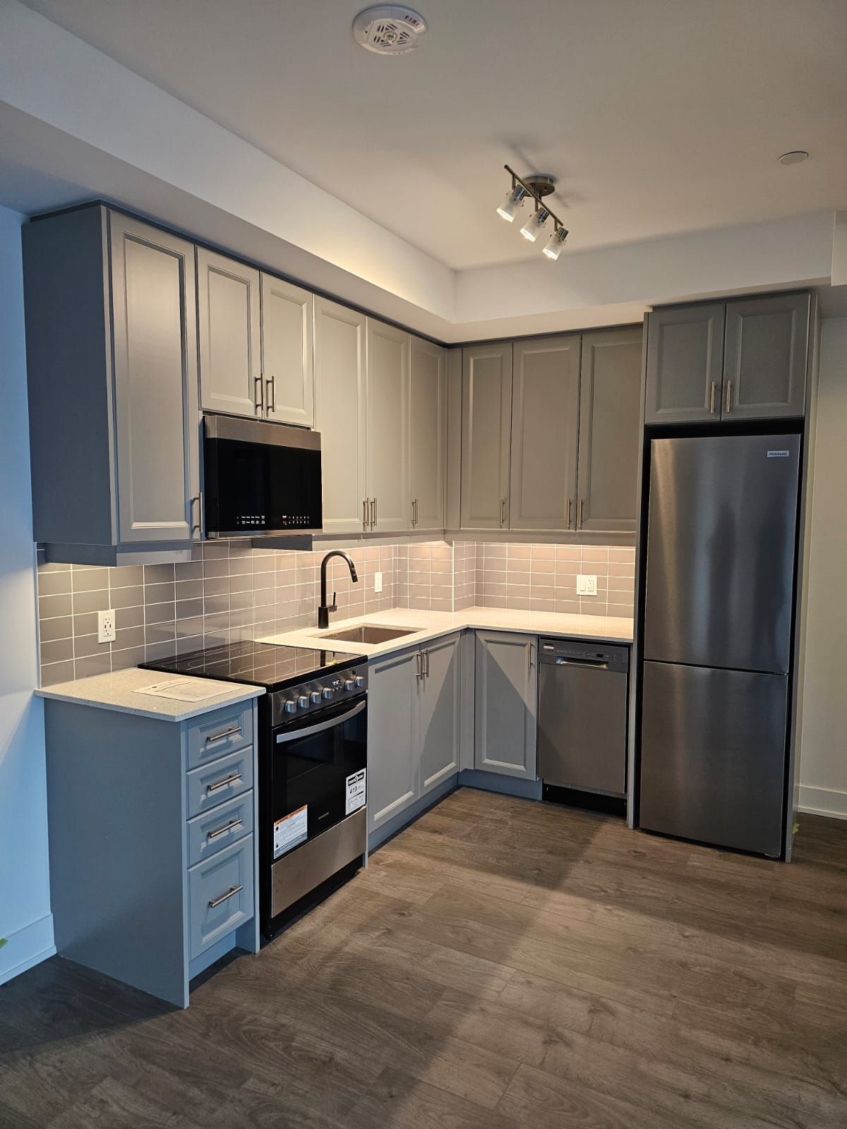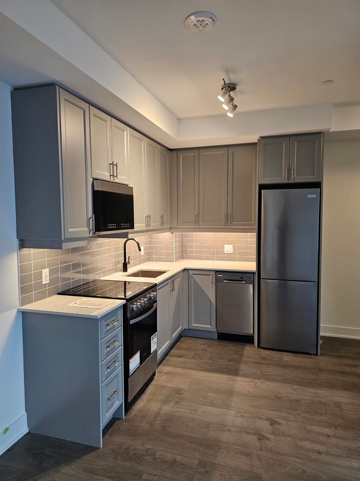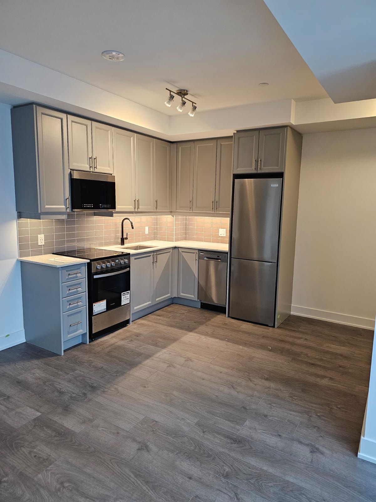 • Open concept kitchen features stainless steel appliances and quartz countertops.
