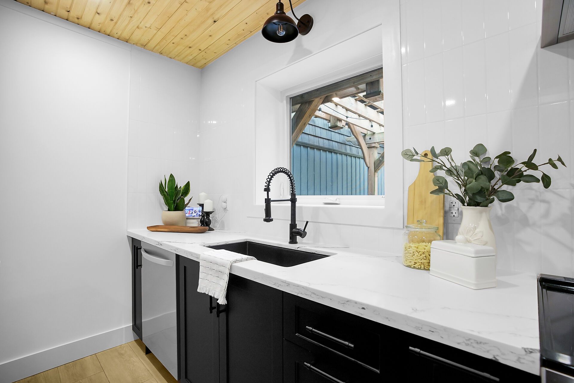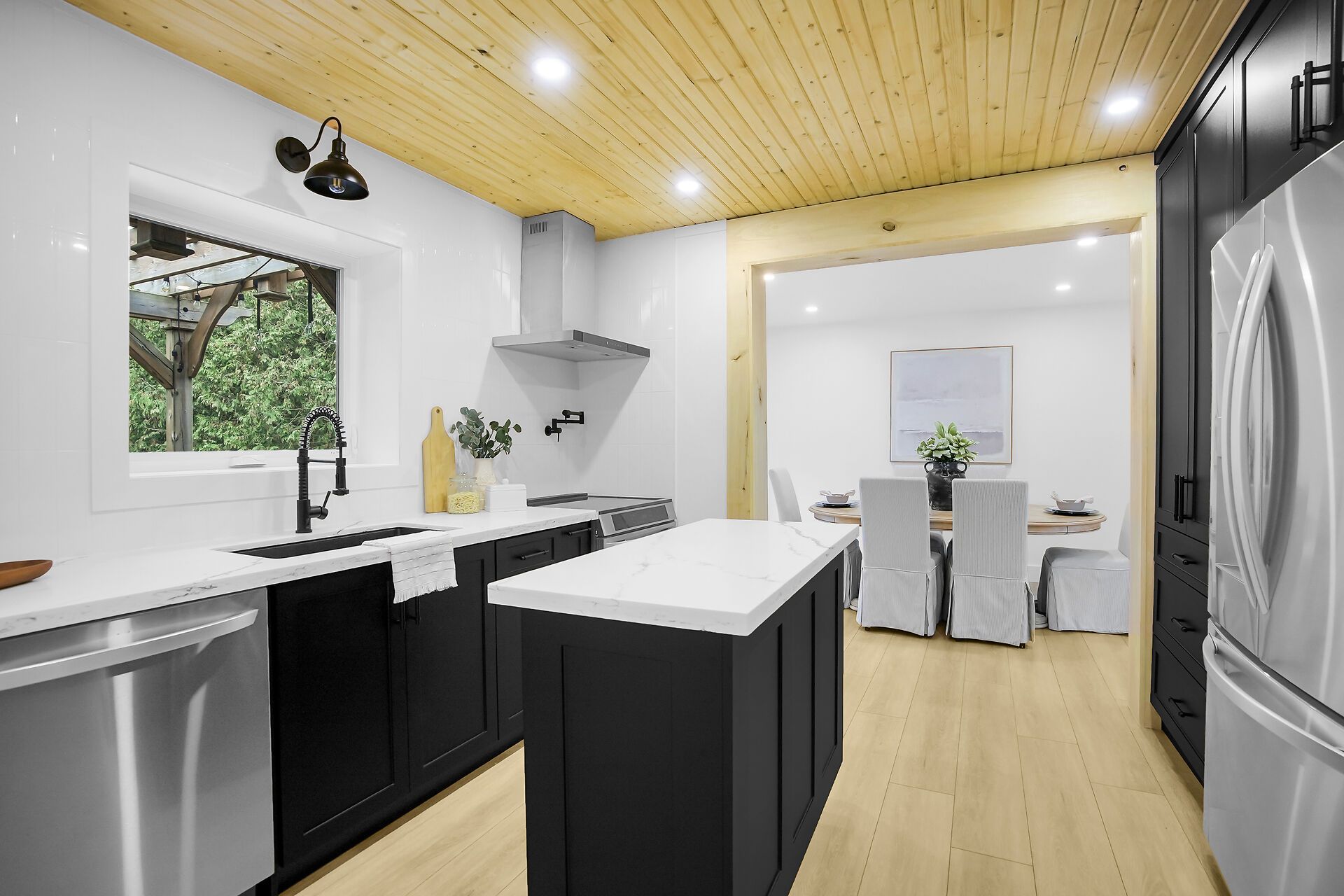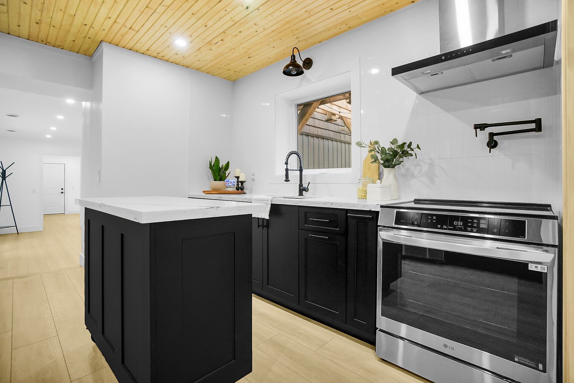 • Modern kitchen with warm wood accents, perfect for cooking and entertaining.