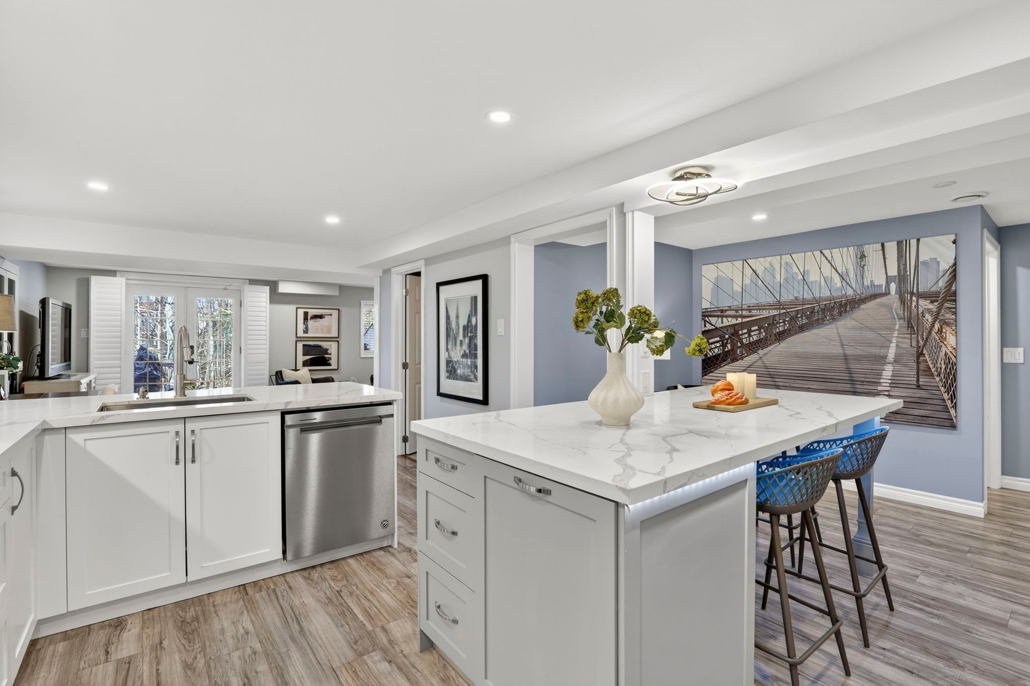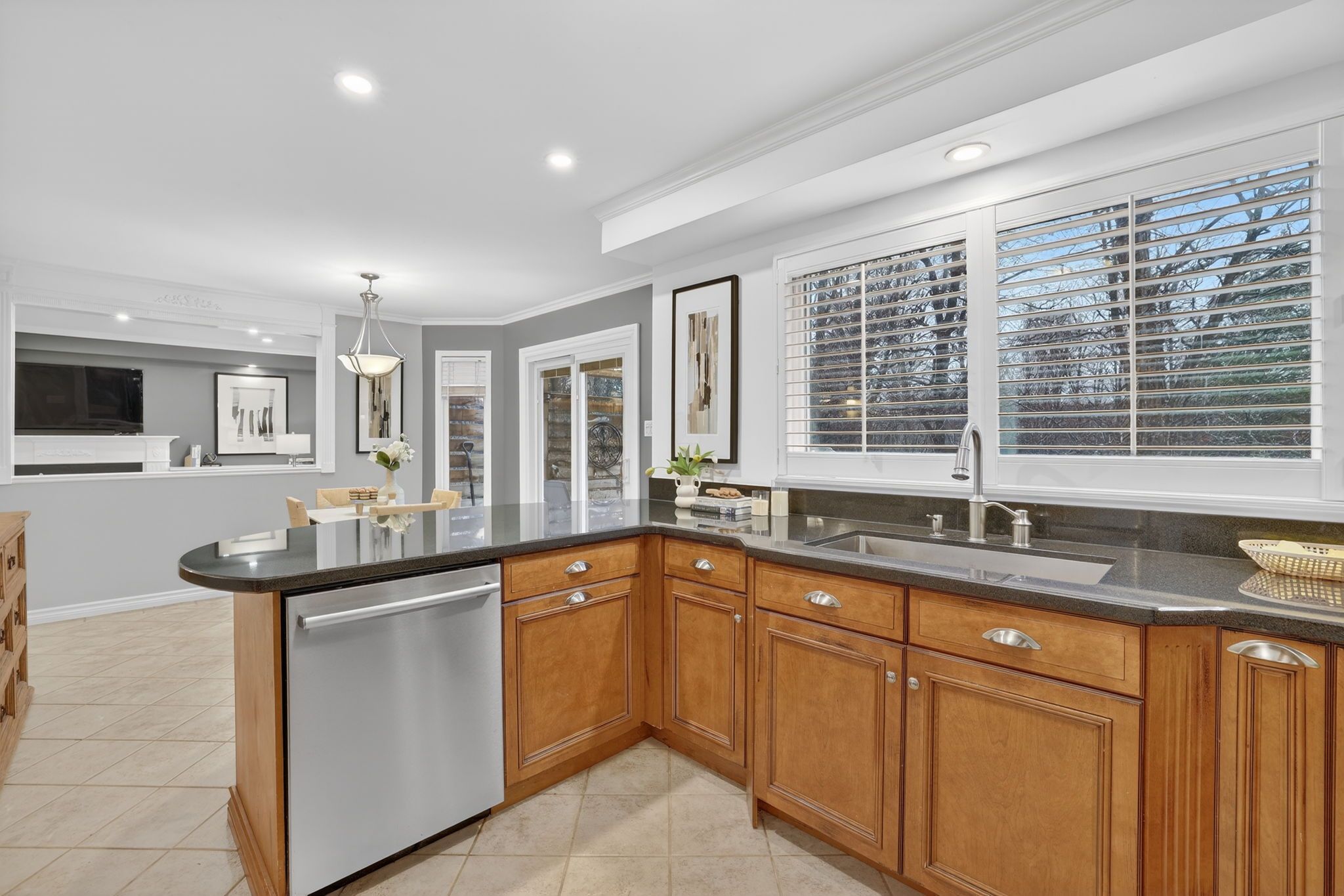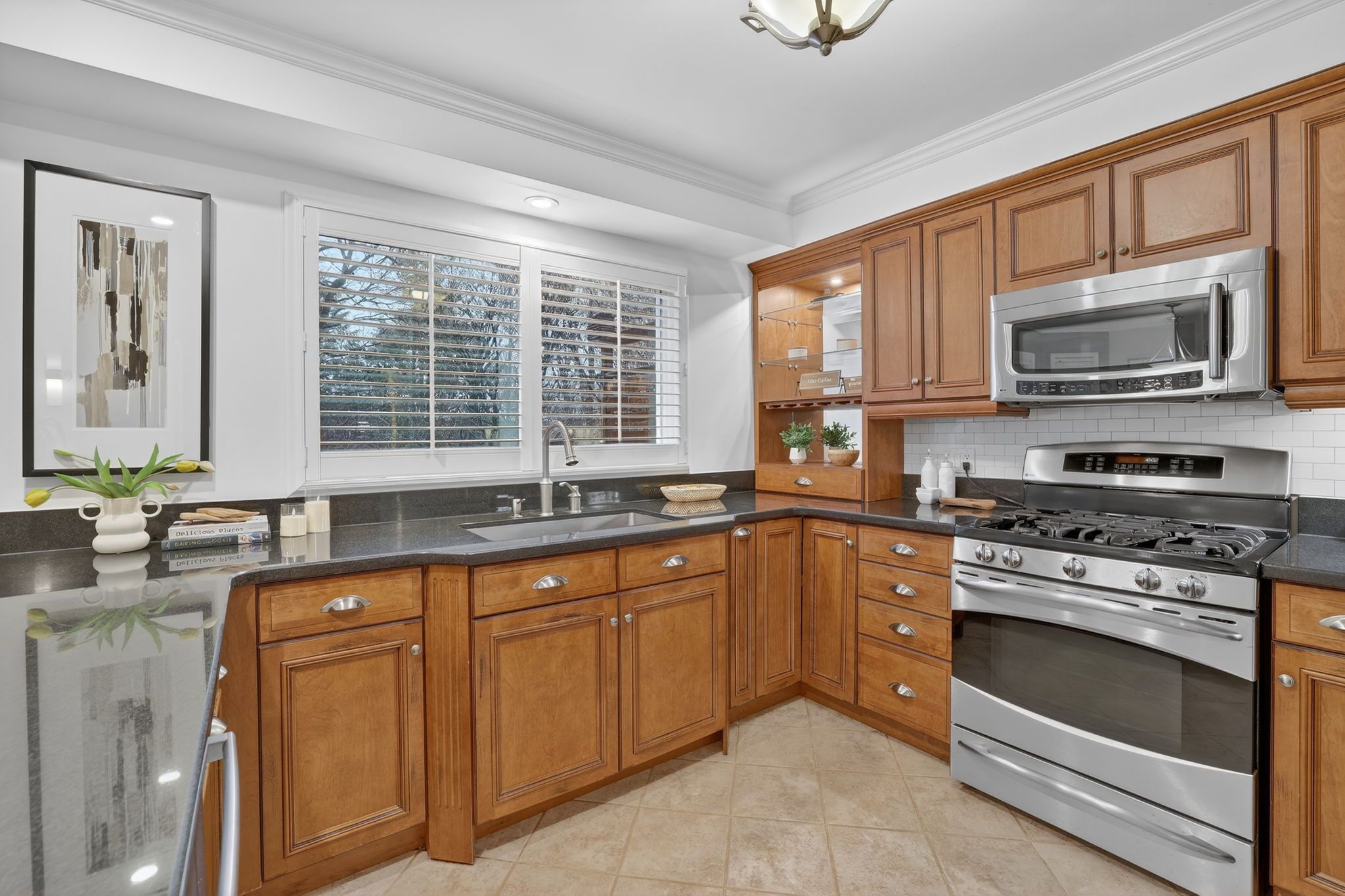 • Bright kitchen with stainless steel appliances and granite countertops.