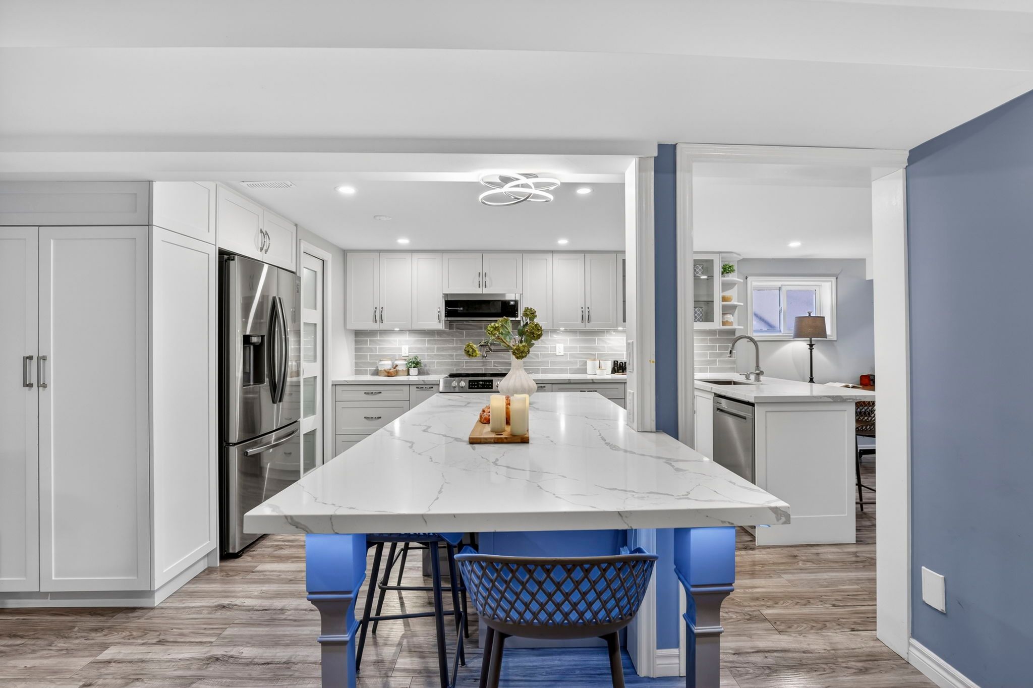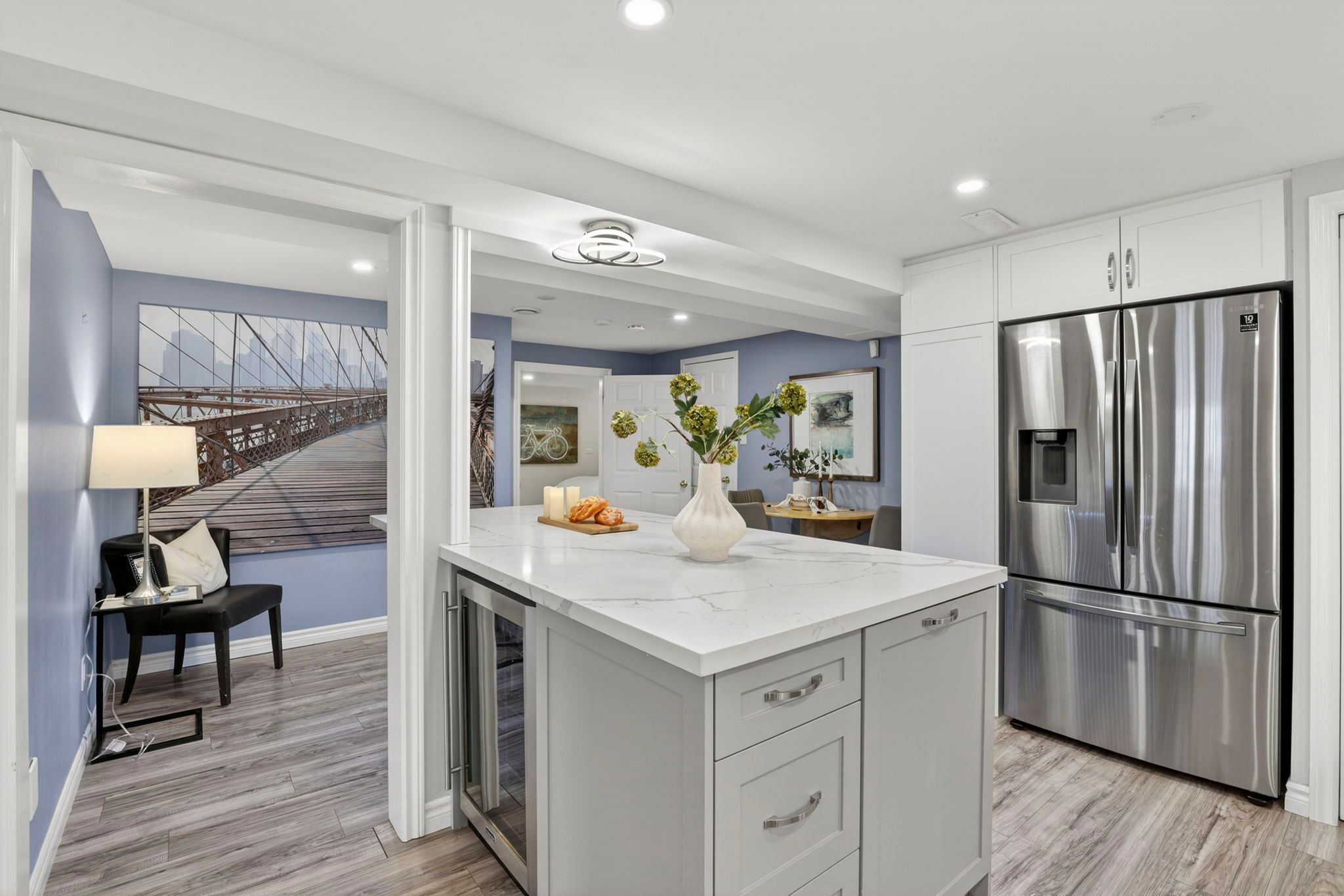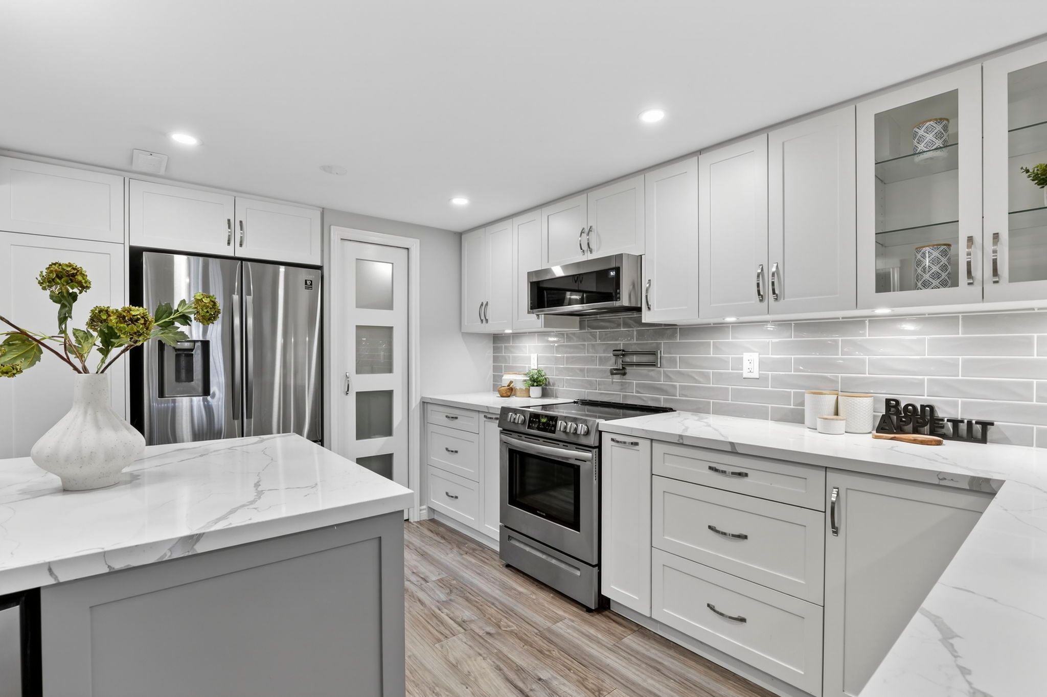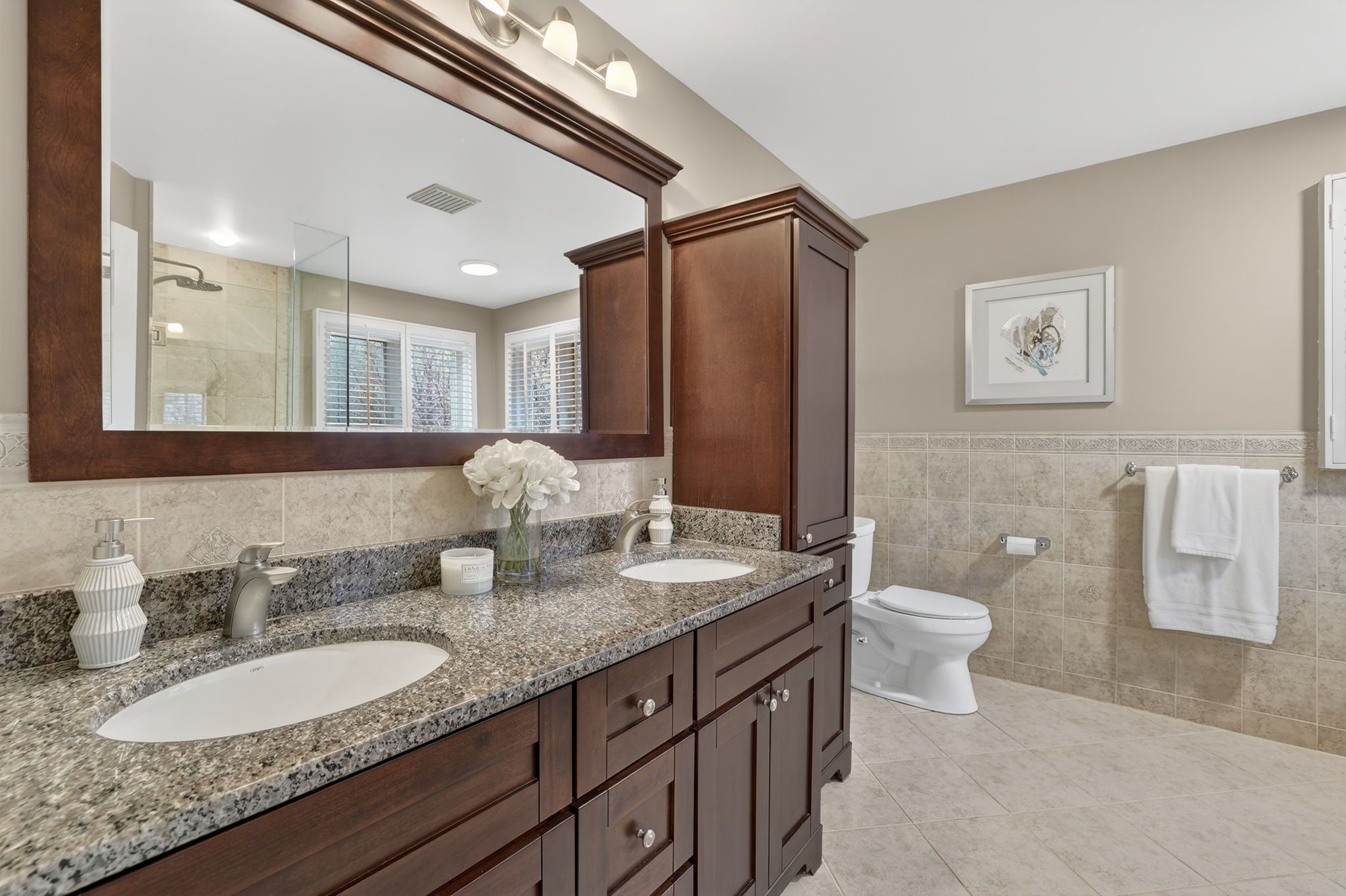 • Bright kitchen with stainless steel appliances and granite countertops.