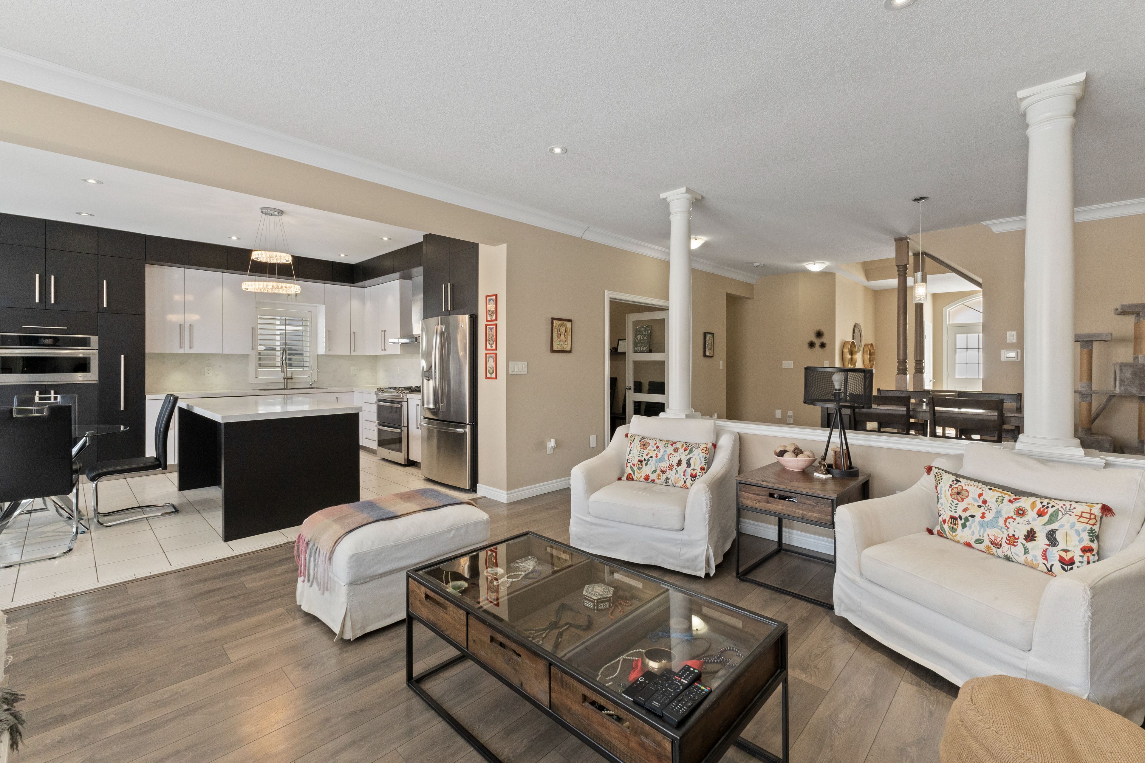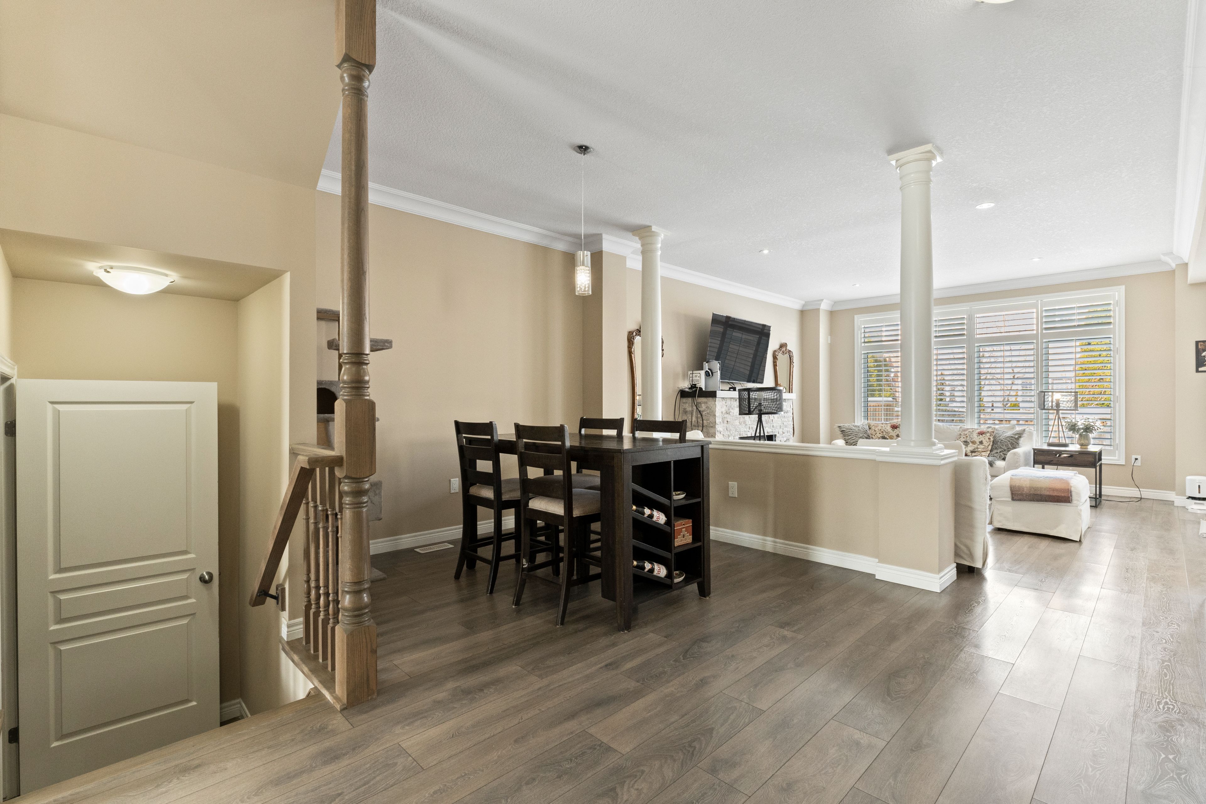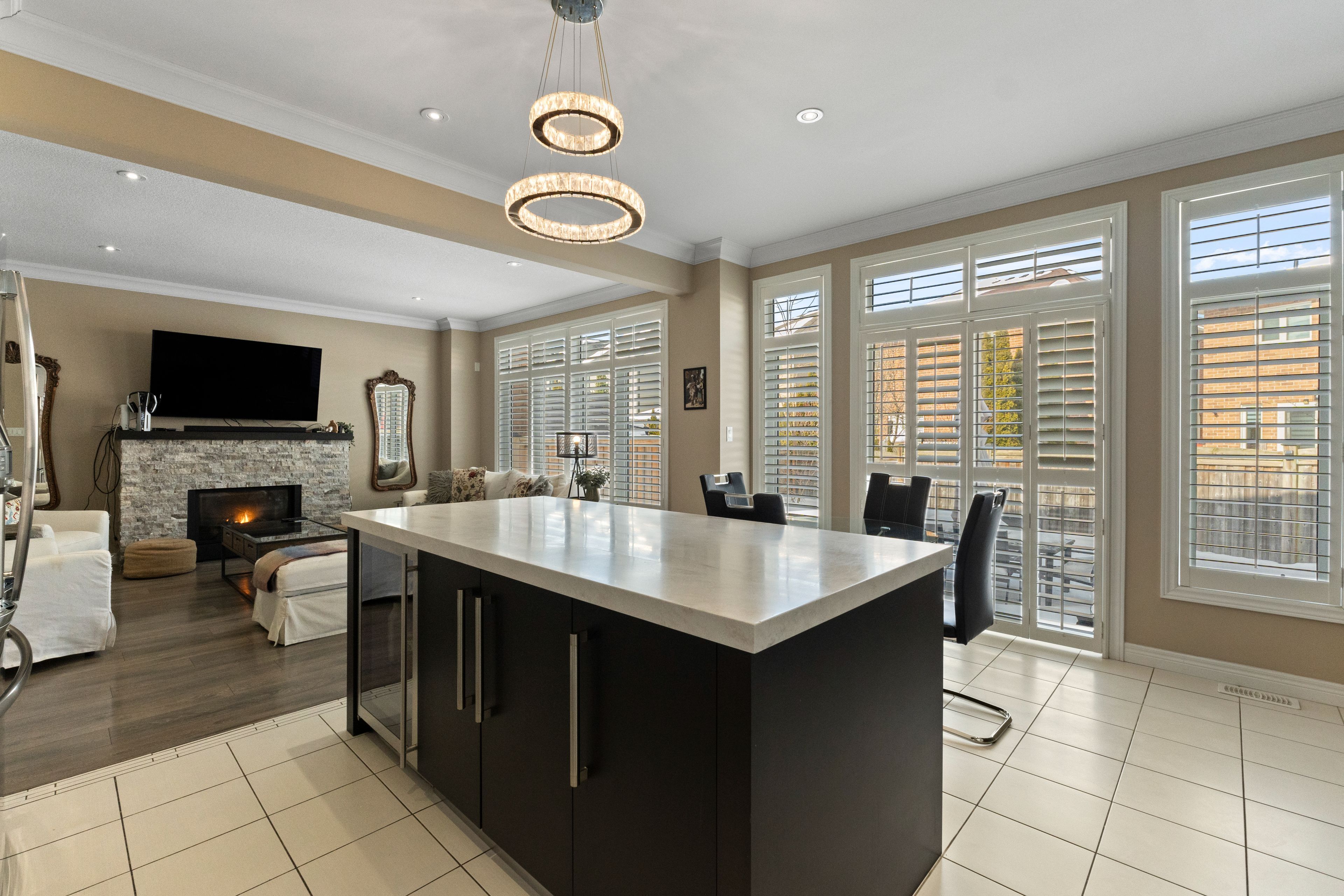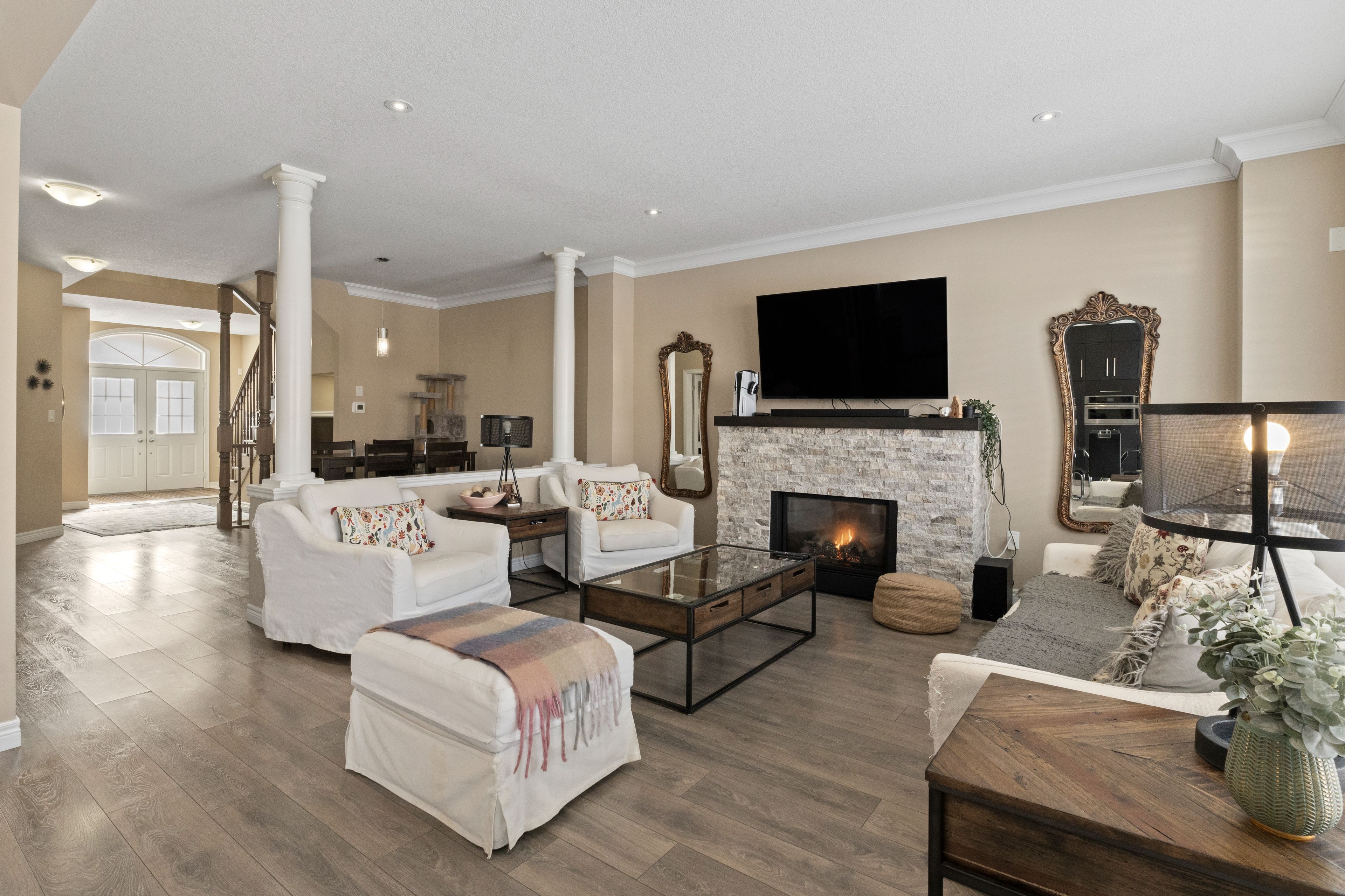 Spectacular 2,642 sq. Ft. Landmart-built home on a premium lot! Welcome to this beautifully upgraded home showcasing exceptional craftsmanship and thoughtful design throughout. Featuring a full stucco exterior with additional rear windows, this residence offers both striking curb appeal and an abundance of natural light. The interior boasts 9-ft california ceilings, 4" trim, crown moulding, oversized tiles, led lighting throughout, and california shutters installed in 2016. The custom kitchen is a true showpiece, high-gloss laminate cabinetry, a custom pantry in the dinette area, solid-surface (corian) countertops, and a full-height backsplash. Premium appliances include built-in jenn air microwave and conventional oven, jenn air range hood, ge profile double-oven gas range, ge french door refrigerator, wine cooler, and a large centre island perfect for entertaining. Just move in! The spacious family room features a stunning custom stone fireplace, while the main floor also offers a private office/den and a functional mudroom. A full oak staircase leads to the upper level, where double doors open to the luxurious primary retreat complete with a vaulted ceiling and walk-in closet. The spa-inspired ensuite includes a jetted tub with tiled deck, glass-enclosed shower, and granite countertop. A large open loft provides additional living space, and the convenient bedroom-level laundry room includes extra cabinetry and countertop workspace for everyday functionality. Additional highlights include 200-amp electrical service, finished garage with heater, central vacuum, and gas bbq rough-in in the backyard. A truly exceptional home offering comfort, style, and quality upgrades throughout!
