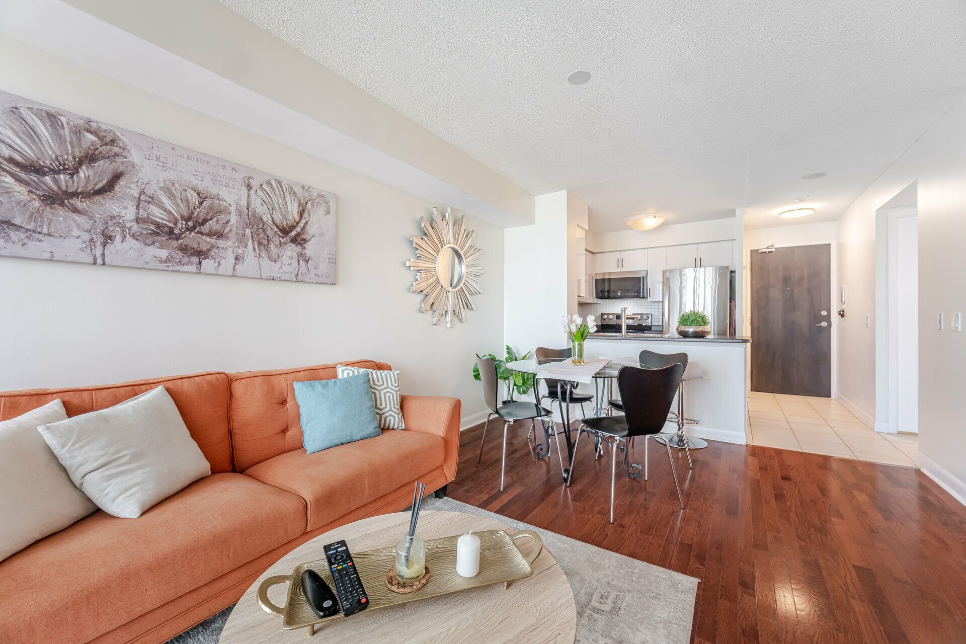 • Open concept layout with hardwood flooring and 9ft ceilings.