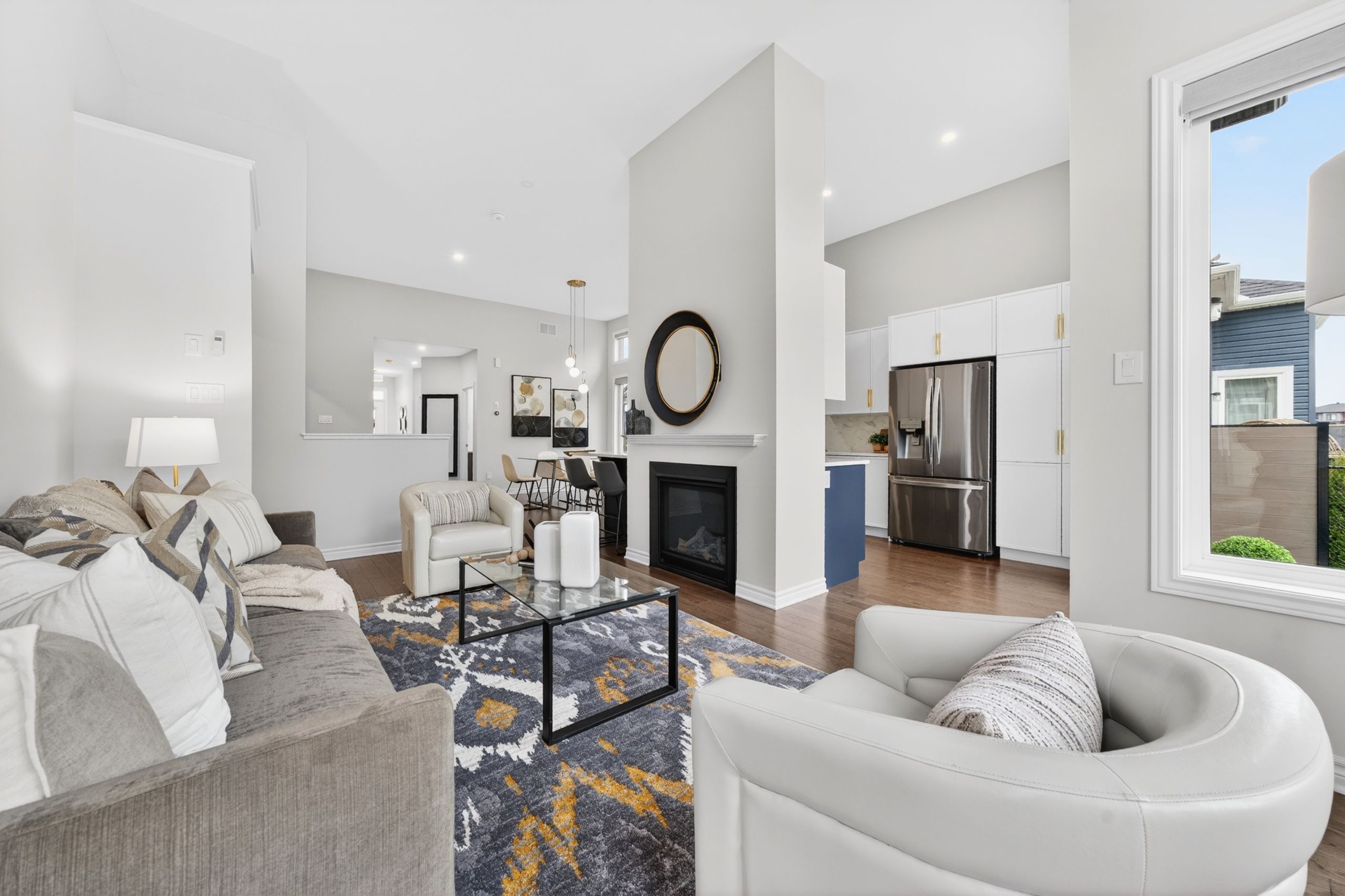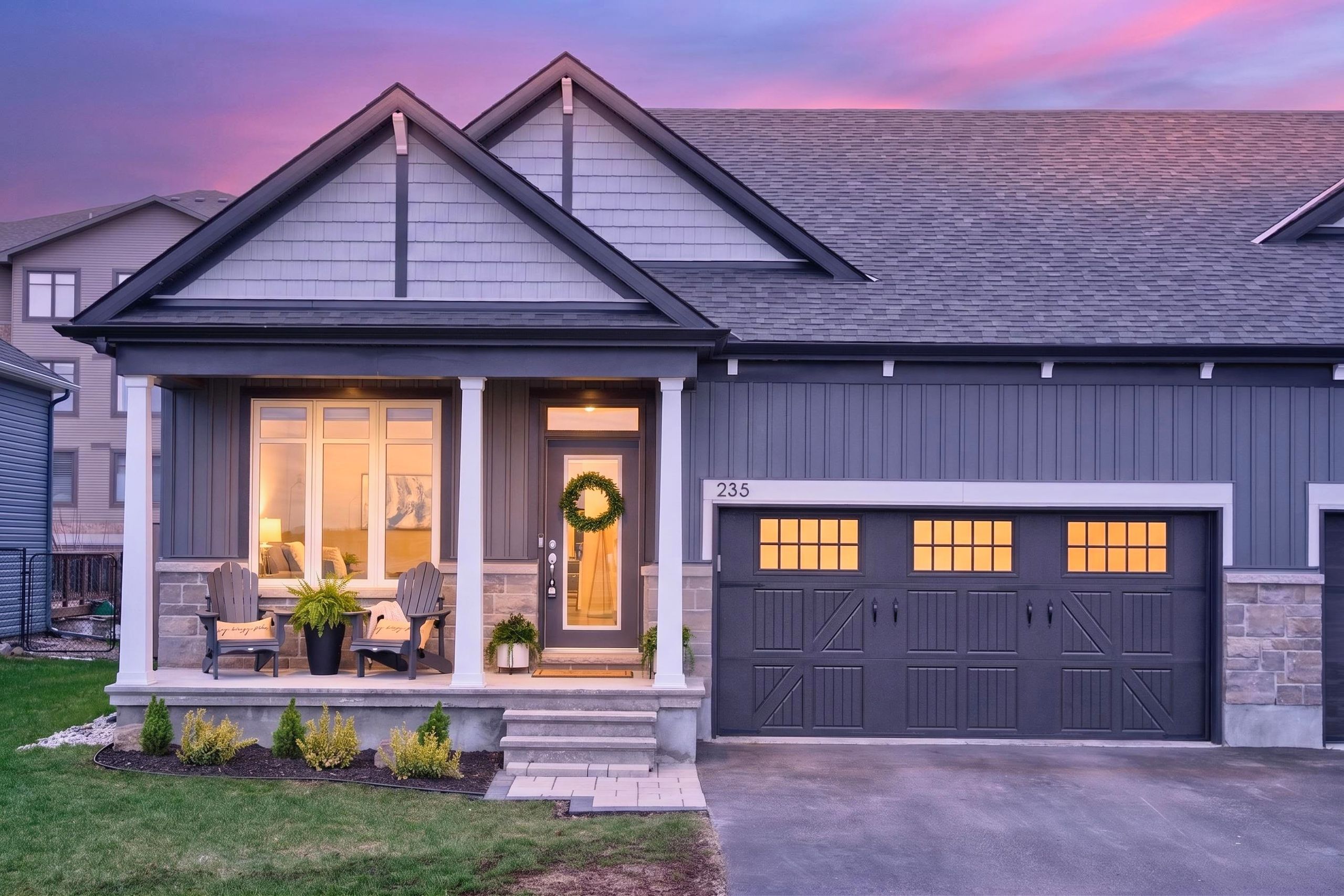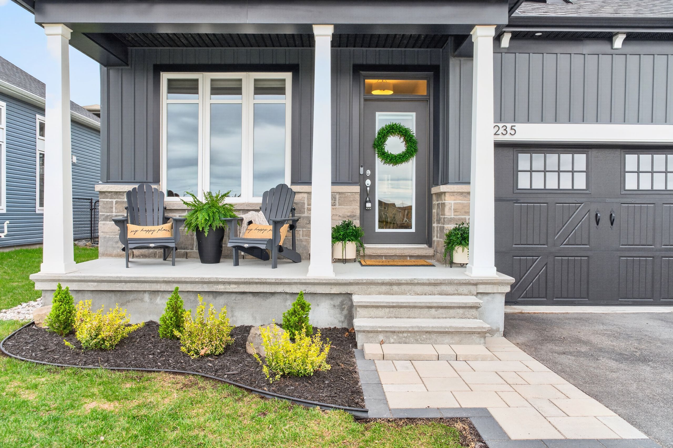 Welcome to 235 shinny avenue in the sought-after fernbank crossing community of stittsville-an exceptional sunningdale energy star high-efficiency bungalow semi offering approximately 1,978 sq. Ft. Of finished living space, including the lower level. This beautifully designed home features 2+1 bedrooms and 3 full bathrooms, with a bright open-concept layout enhanced by soaring 12' ceilings and an abundance of natural light flowing through the living, dining, and kitchen areas. The stylish kitchen showcases elegant quartz countertops, a breakfast bar, and overlooks the spacious great room, where a stunning central gas fireplace creates a warm and inviting focal point. Thoughtful design details include aluminum alloy kitchen handles finished in brushed brass, adding a refined and modern touch. Hardwood flooring extends throughout the main living areas, complemented by ceramic tile in the bathrooms and laundry room, plush carpeting in the bedrooms, and the convenience of main-floor laundry. The generous primary suite offers a walk-in closet and a private 4-piece ensuite, while the fully finished lower level provides a versatile recreation room, an additional bedroom, and a full bathroom-perfect for guests or extended living. Step outside to a beautifully landscaped backyard, ideal for entertaining, relaxing, or gardening, complete with a fully fenced yard (2023), custom window coverings with automatic blinds (2022) in the living and dining area, and extensive landscaping (2025). Ideally located close to parks, shopping, restaurants, services, and easy highway access, this home offers the perfect blend of comfort, style, and convenience in a thriving community.