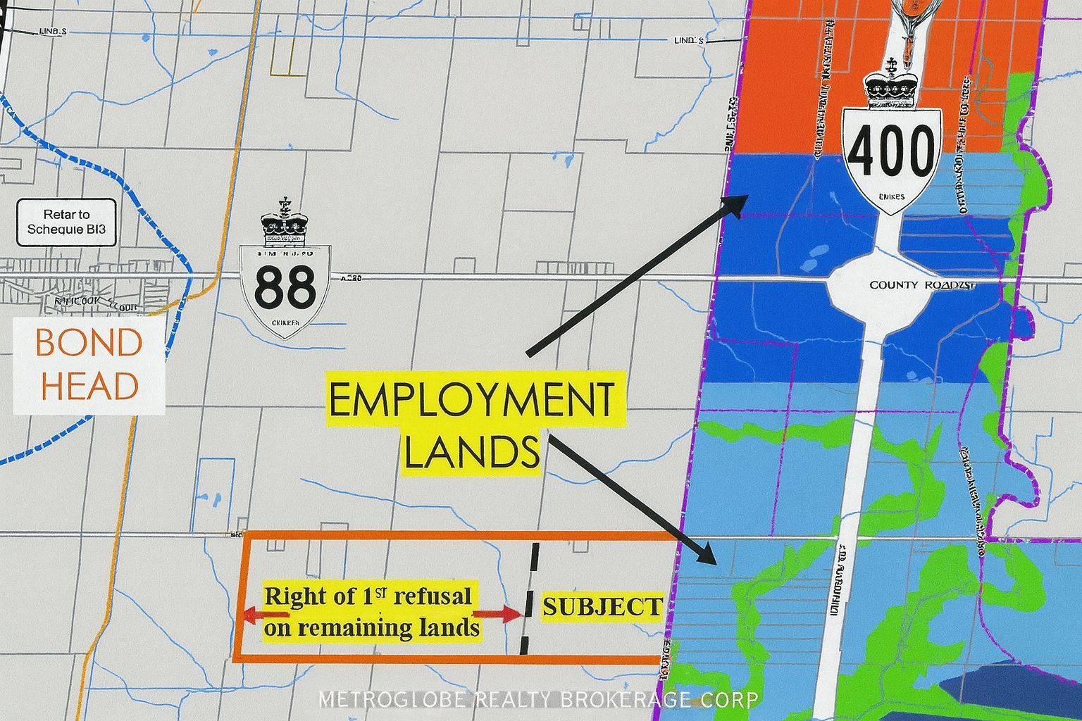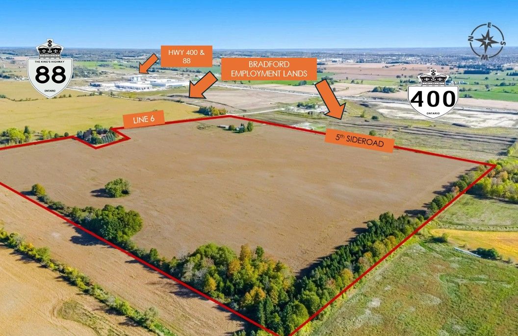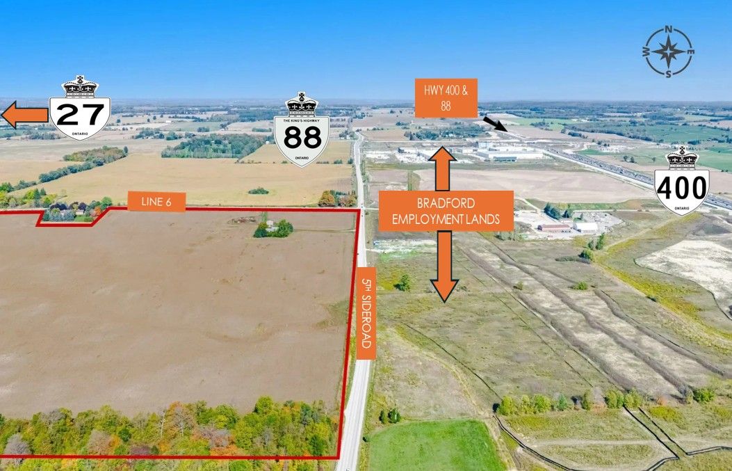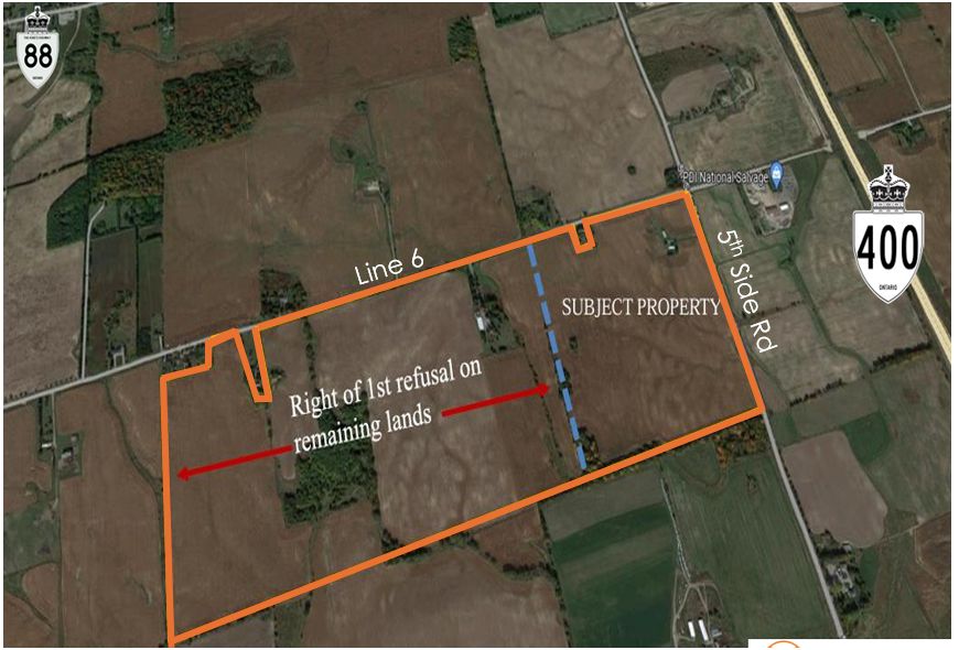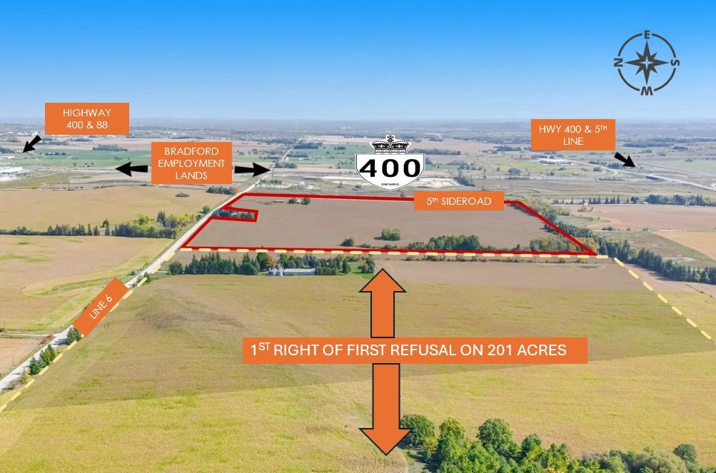 An outstanding opportunity for a major end user or corporate occupier to secure approximately 99. 11 acres at the corner of 5th sideroad and line 6 in bond head, within the town of bradford west gwillimbury. Ideally suited for an operation capable of generating significant employment and economic benefit to the town and broader region, a factor that could support accelerated inclusion of these lands into the town's current official plan boundary, given their direct adjacency to designated employment lands. One of the last remaining privately held farm parcels in the area, it lies just one concession west of highway 400 and borders lands where municipal servicing is actively advancing. Free of greenbelt restrictions, the property includes only a small rear conservation pocket of roughly 3 to 4 acres, leaving the majority as future developable area. The site lies within a high-growth corridor surrounded by major developers and institutional landholders, underscoring its long-term investment strength and strategic positioning. A key feature of this offering is a 25-year first right of refusal on approximately 201 acres of adjacent land, providing the purchaser with an exclusive opportunity to secure substantial additional acreage in the future. While the seller recognizes current market conditions, they remain open to negotiation to achieve a fair and mutually beneficial outcome. The seller is open to a creative seller take-back mortgage that may include an interest-free period during the early years, offering a rare and attractive financing structure for qualified purchasers. Enhanced by a residence and outbuildings under tenancy, the property generates rental income while future development and planning continue to evolve in the immediate area. The site aligns strongly with bradford's long-term employment growth vision and regional economic objectives. Showings are strictly by appointment. Buyer to verify all information and satisfy themselves as to due diligence.