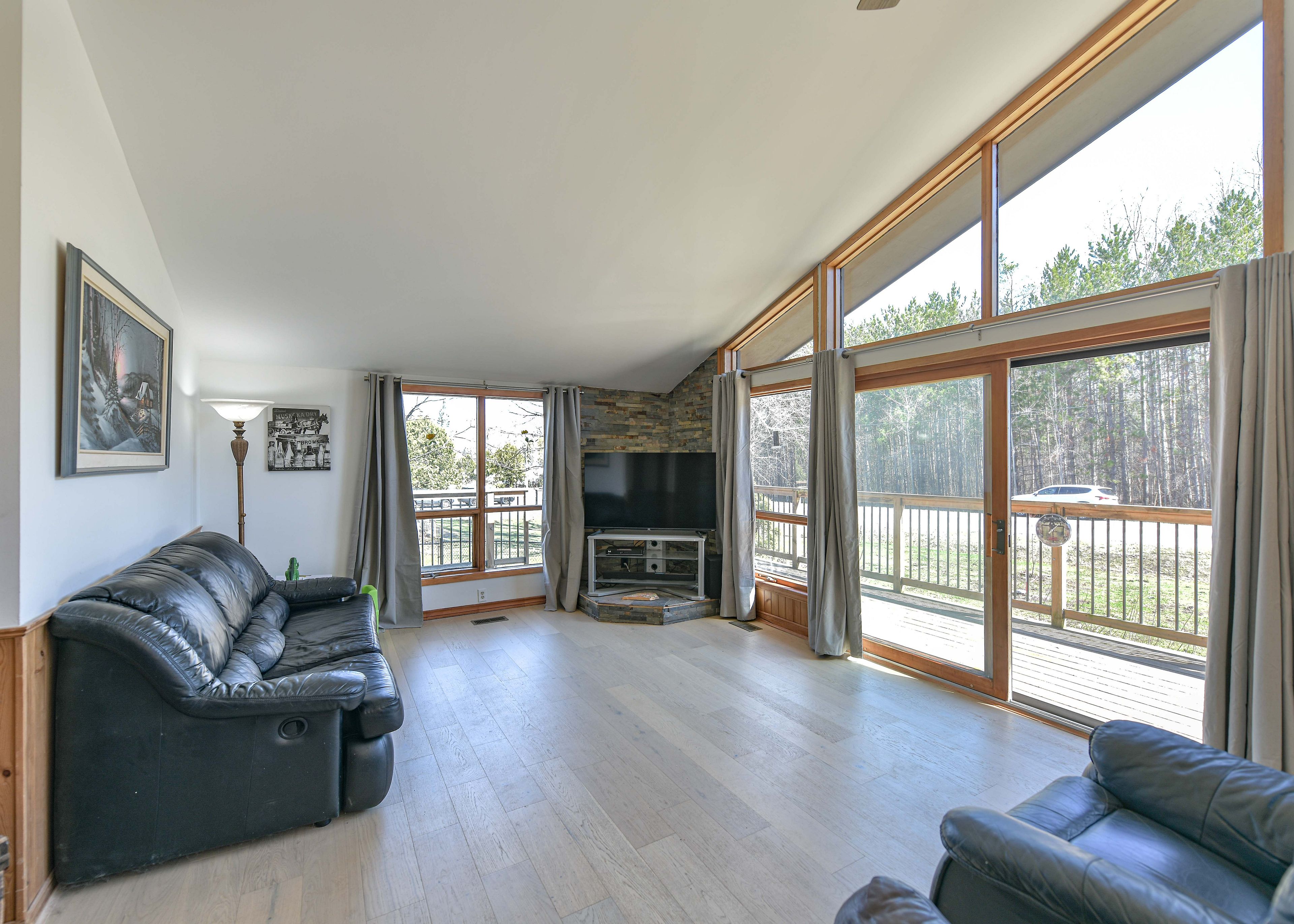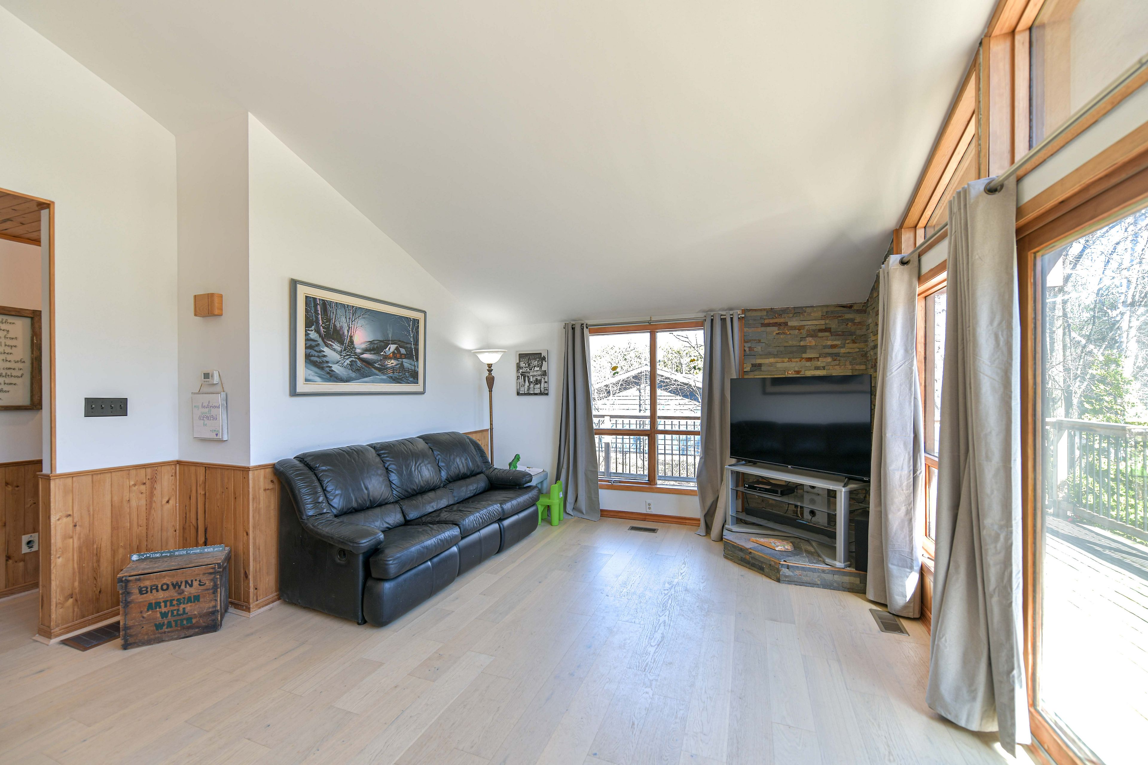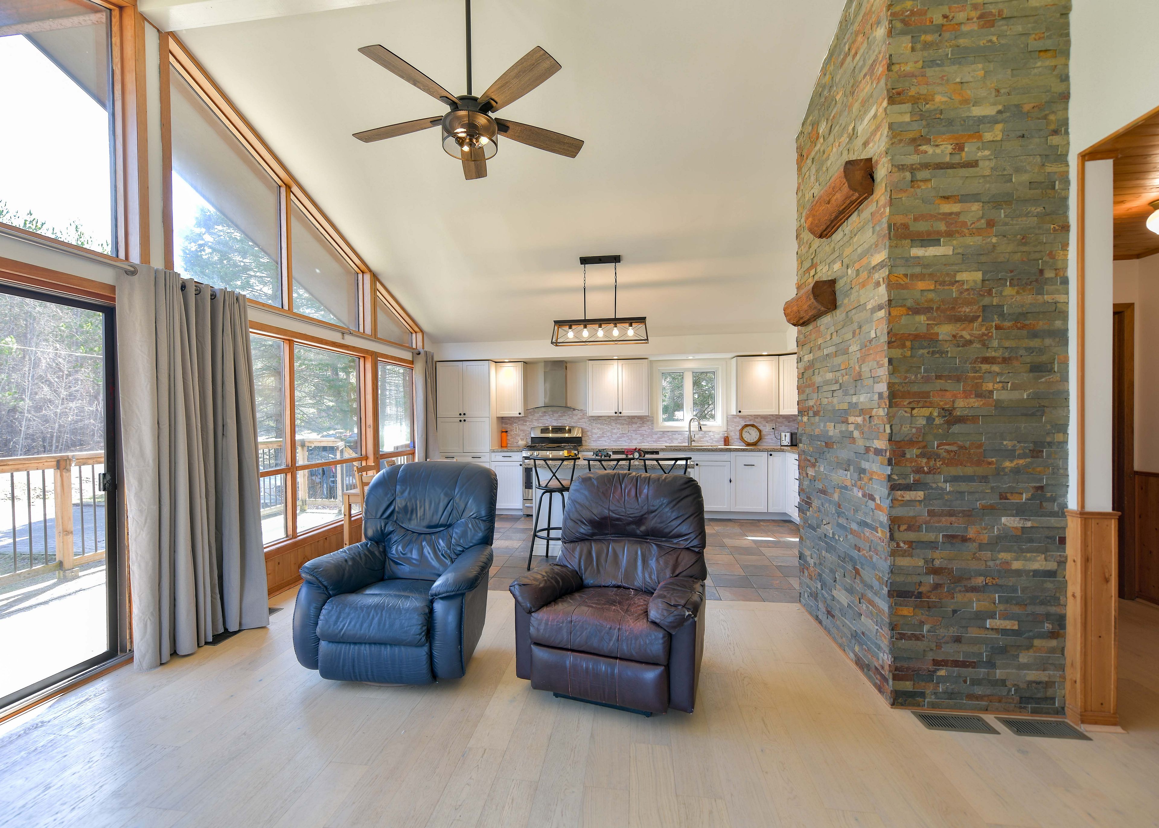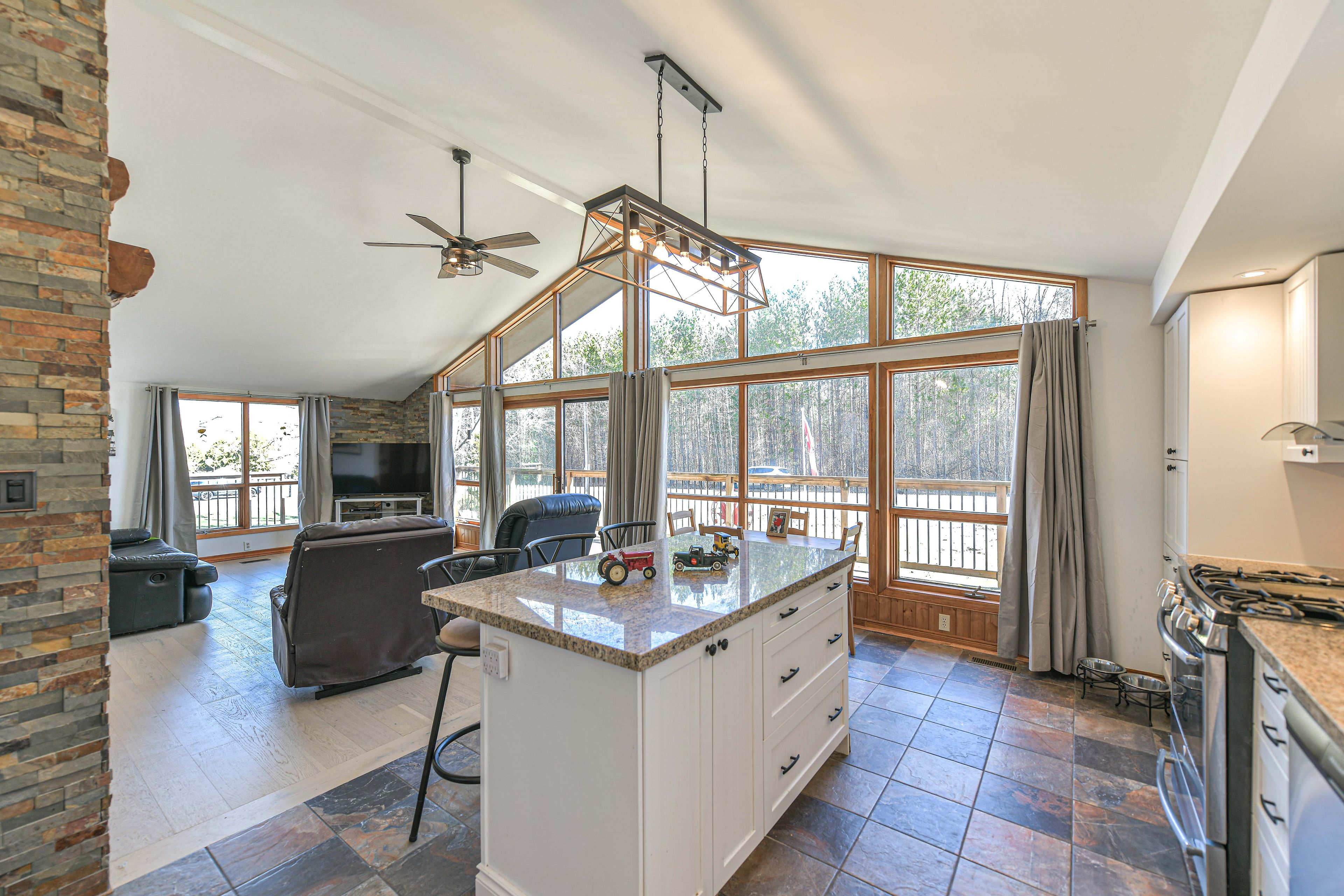 • Bright open-concept great room with cathedral ceiling and large windows.