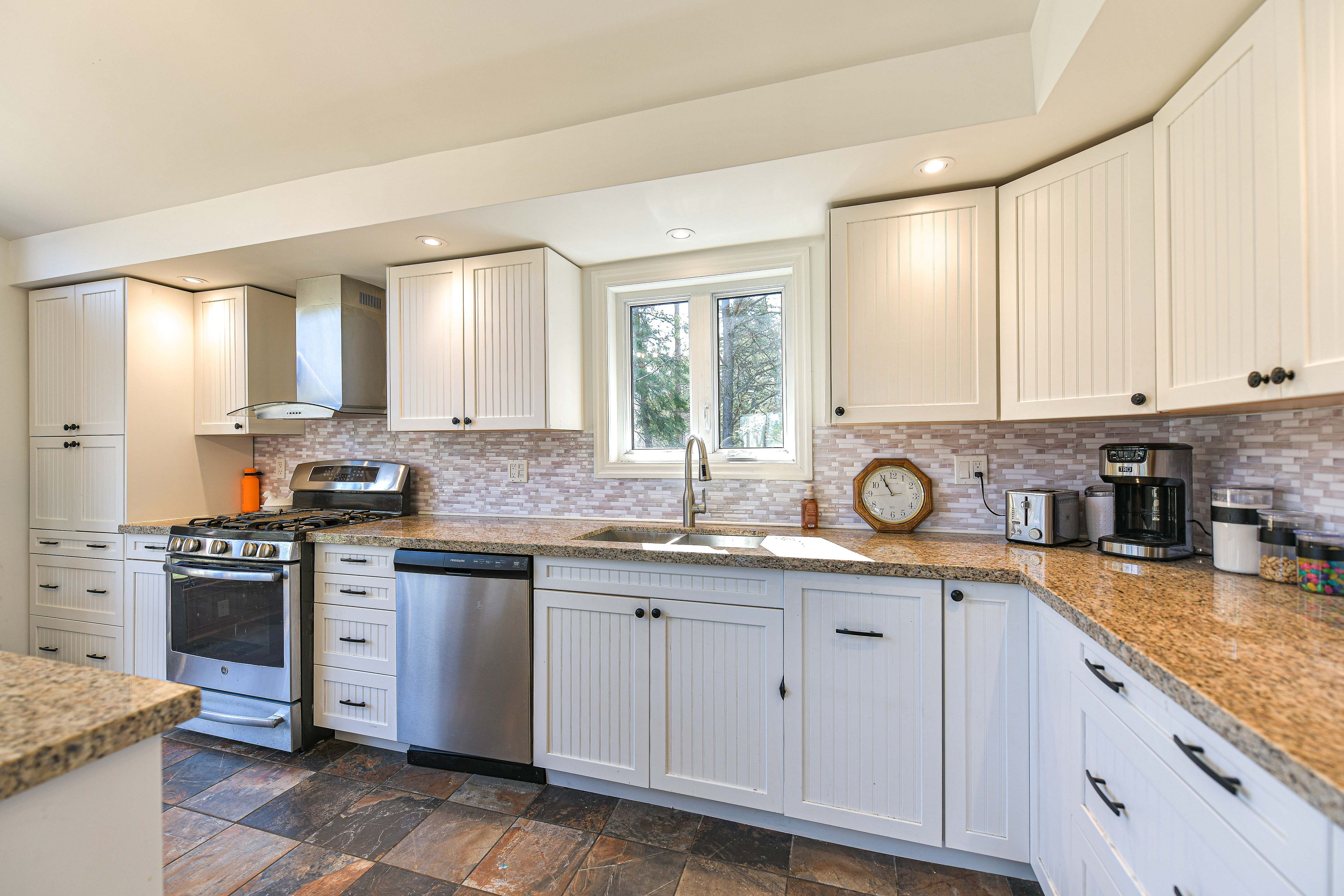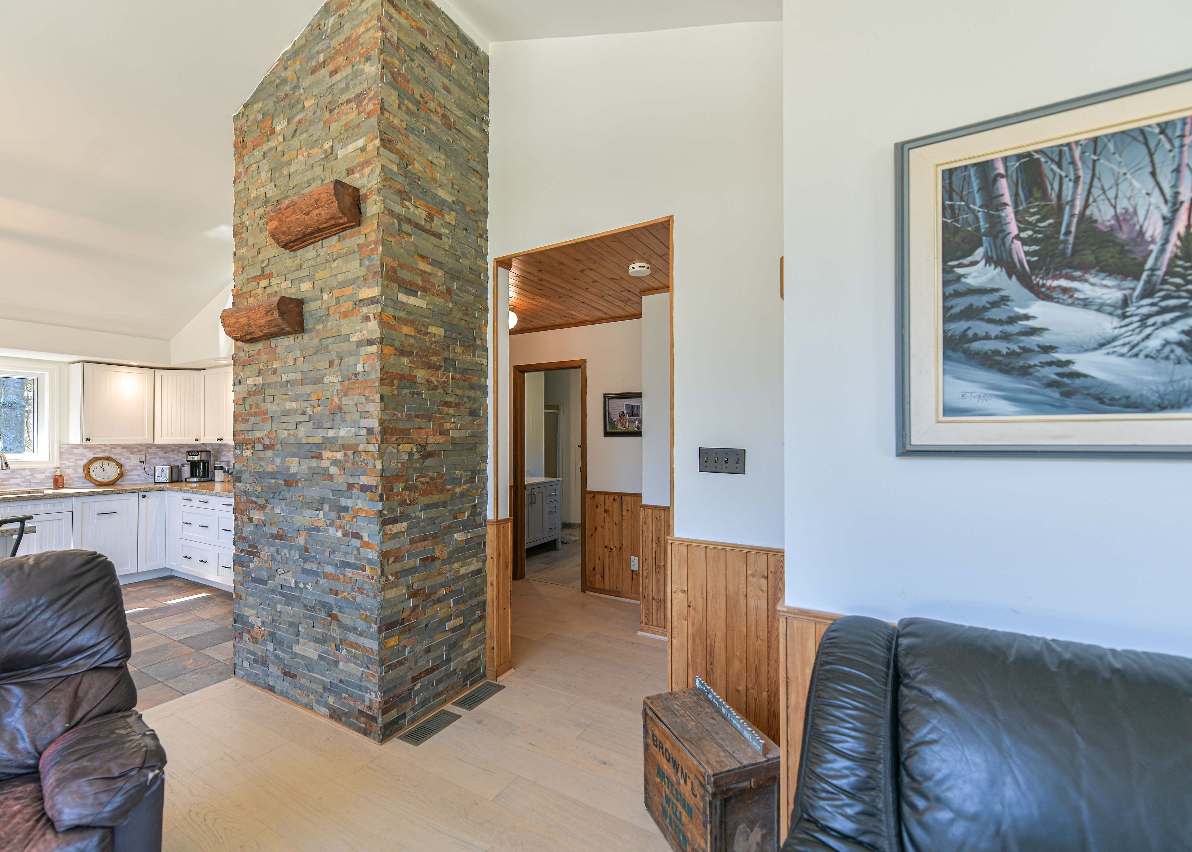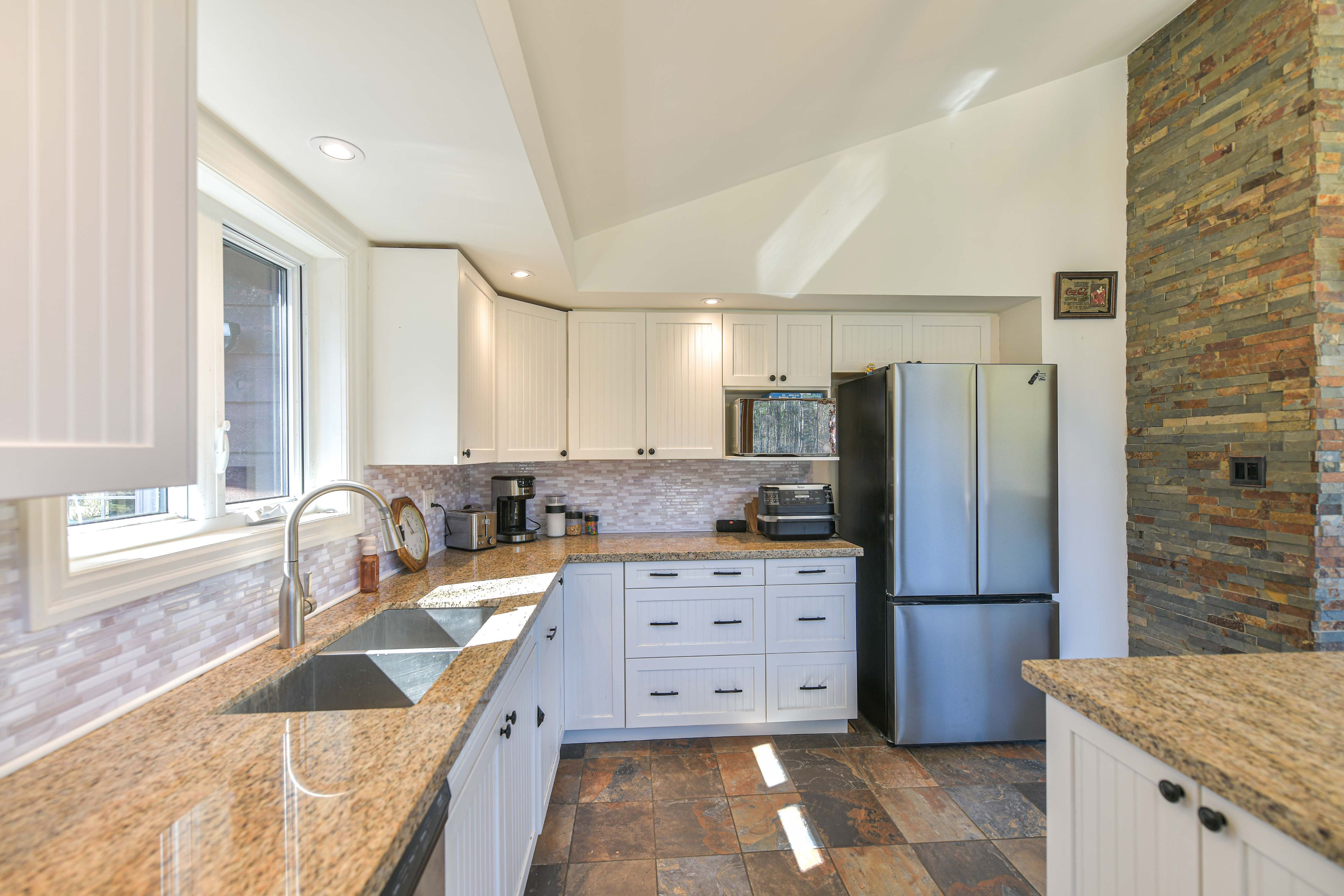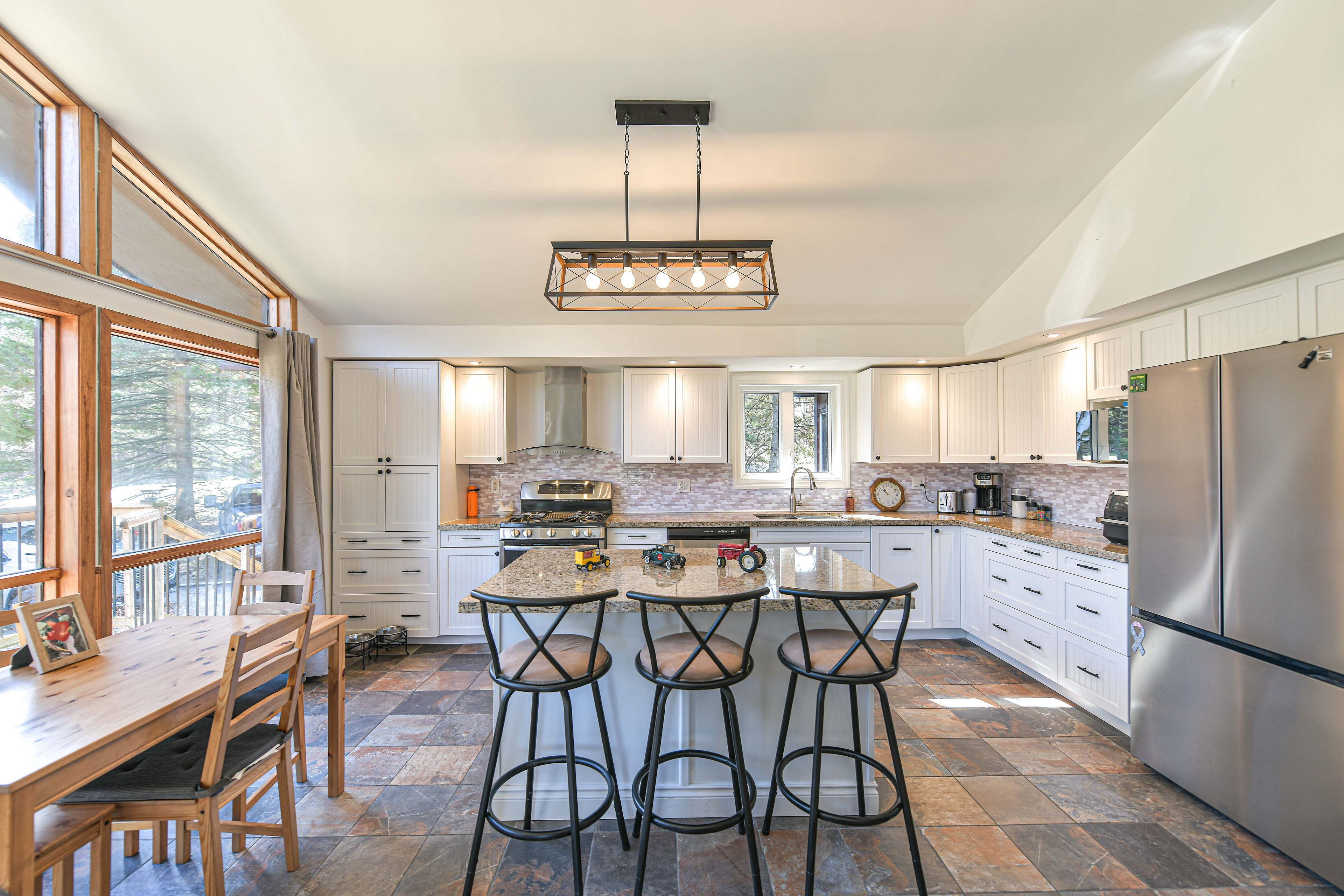 • Bright open-concept great room with cathedral ceiling and large windows.