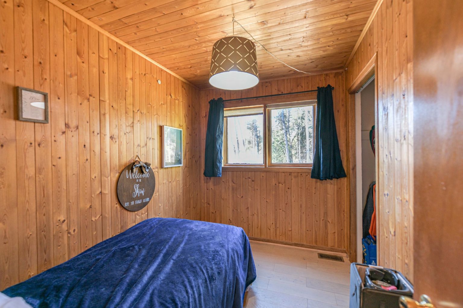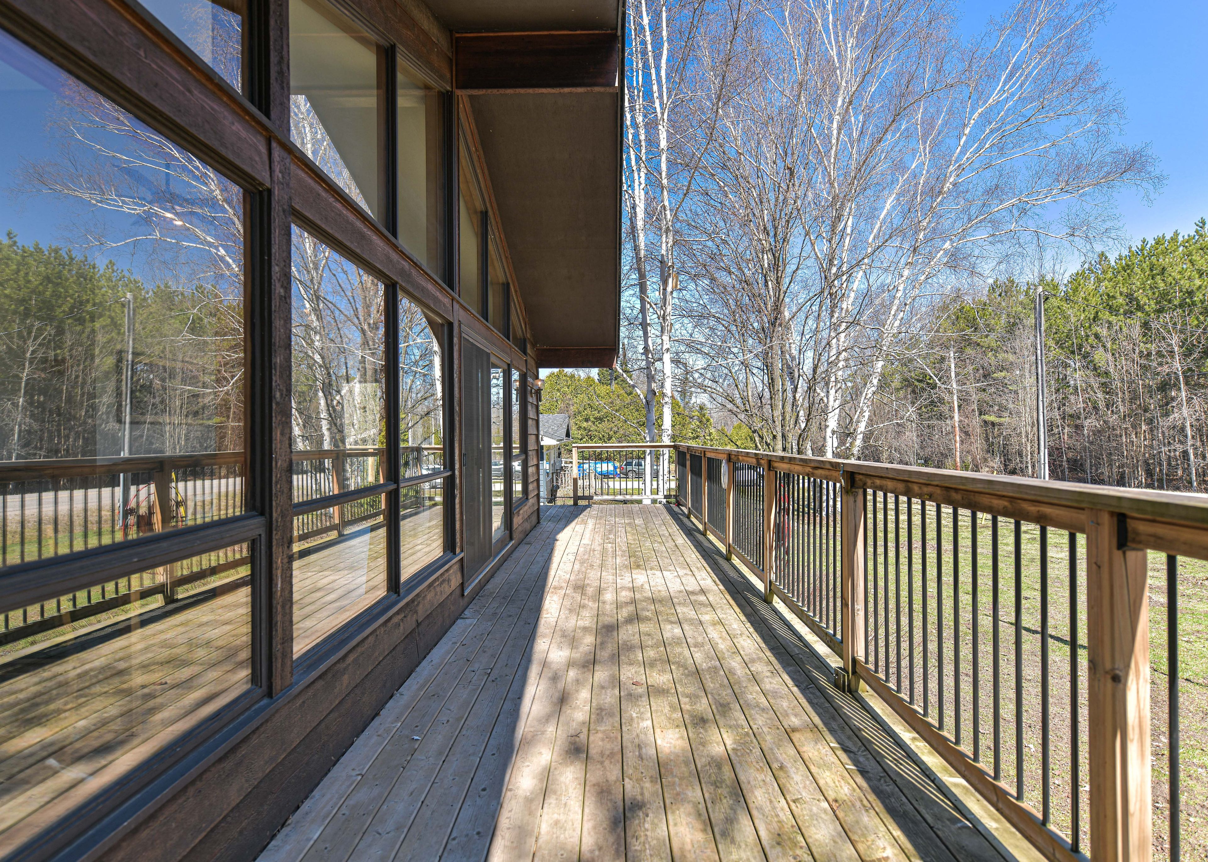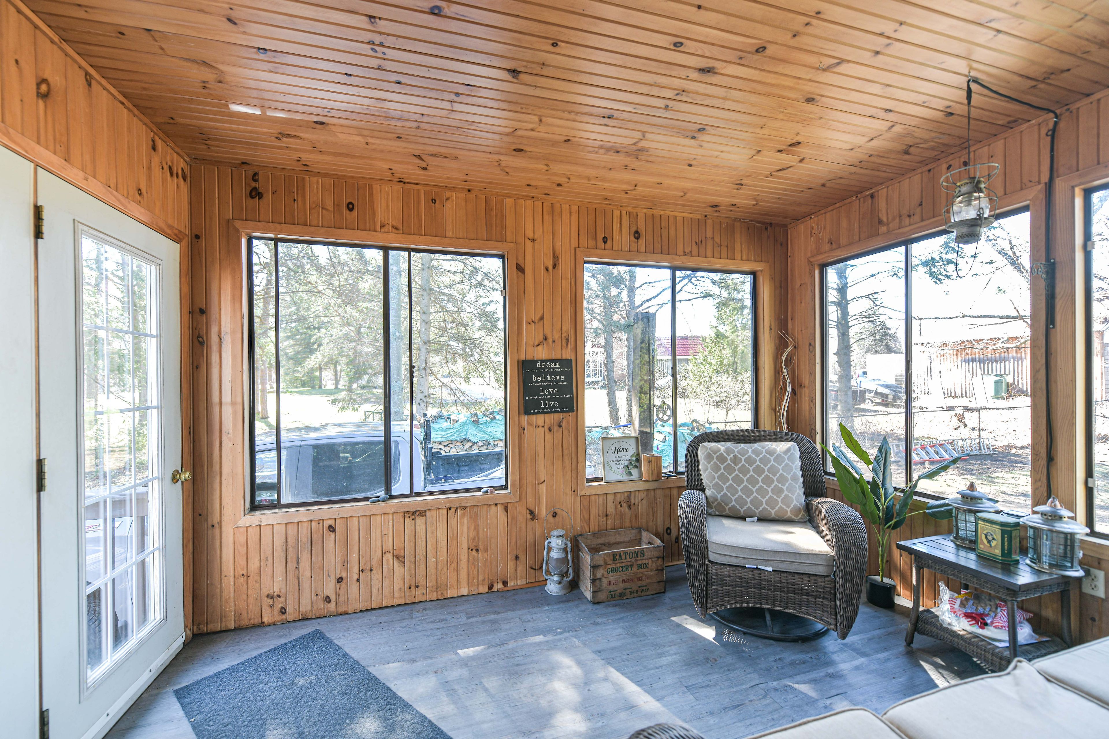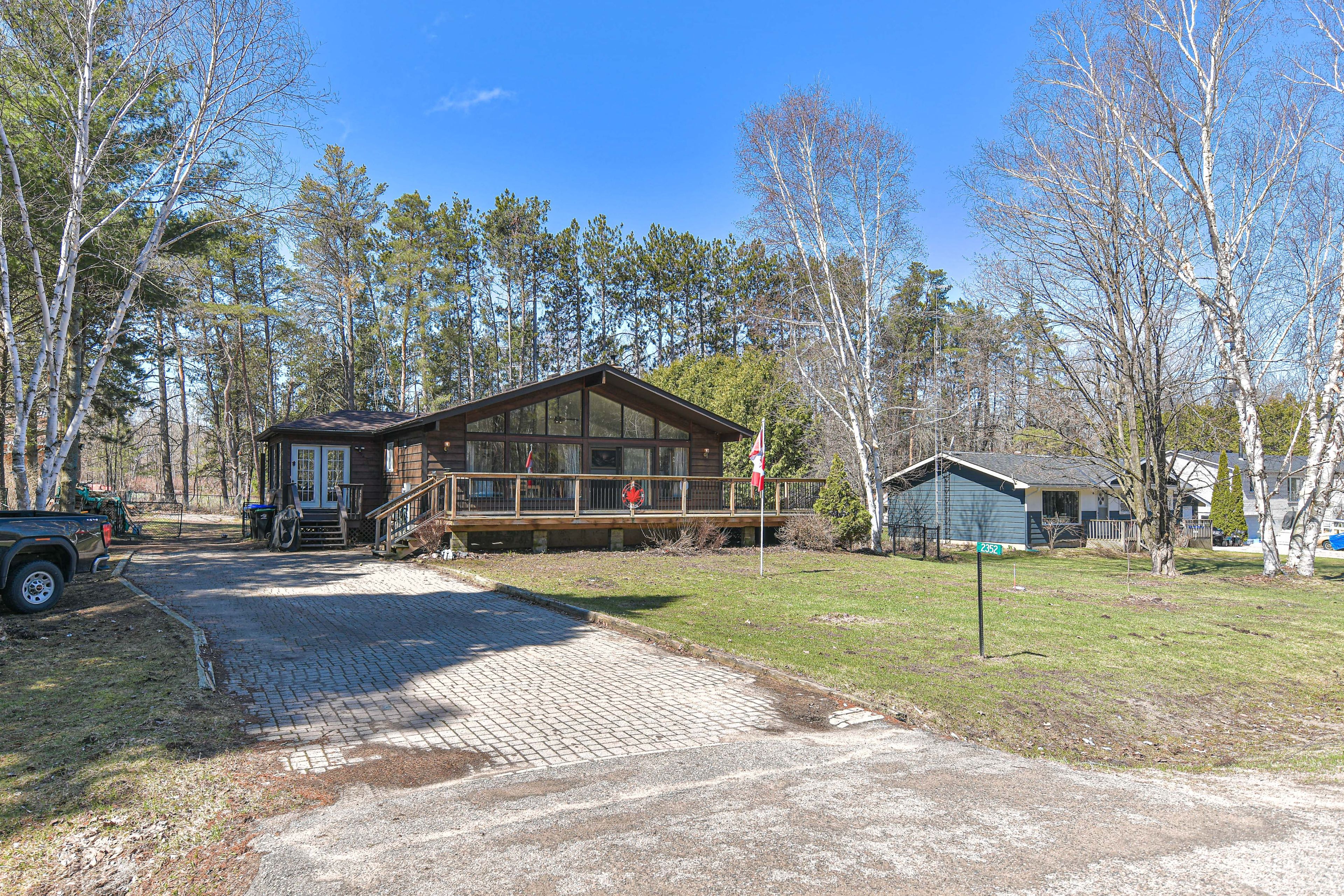 This charming viceroy chalet-style home sits on a generous 100 150 ft lot, offering the perfect blend of character, warmth, and modern touches. With its signature chalet roofline and inviting wrap-around deck, this property feels like a peaceful retreat the moment you arrive. Inside, the bright open-concept great room features a newly drywalled cathedral ceiling, updated flooring, and large windows that fill the space with natural light. A walkout leads directly to the deck, creating easy indoor-outdoor flow for morning coffee, evening bbqs, or simply enjoying the quiet surroundings. The home offers two comfortable bedrooms, including a primary with its own private walkout to the deck - a rare and lovely feature that brings nature right to your doorstep. The kitchen includes updates for a fresh, functional feel. A full unfinished basement provides additional storage or workshop space, the basement is full, unfinished with approximately 6 feet in height has plenty of potential for practical use. With updated shingles, thoughtful interior improvements, and the timeless appeal of viceroy construction, this chalet is ideal as a year-round home, cottage alternative, or peaceful weekend escape.