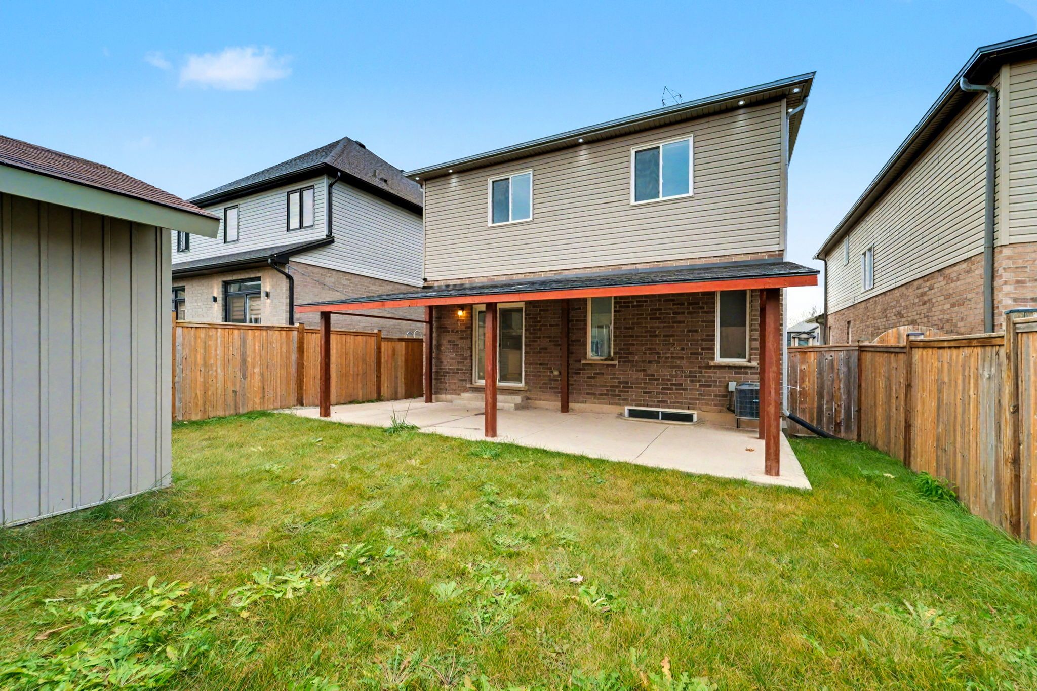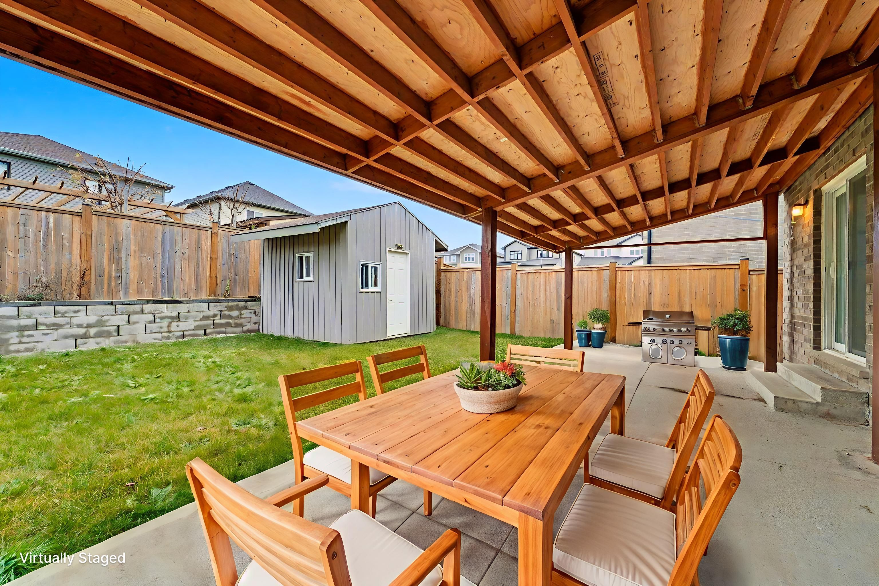 • Fully fenced backyard with stamped concrete driveway and large shed.