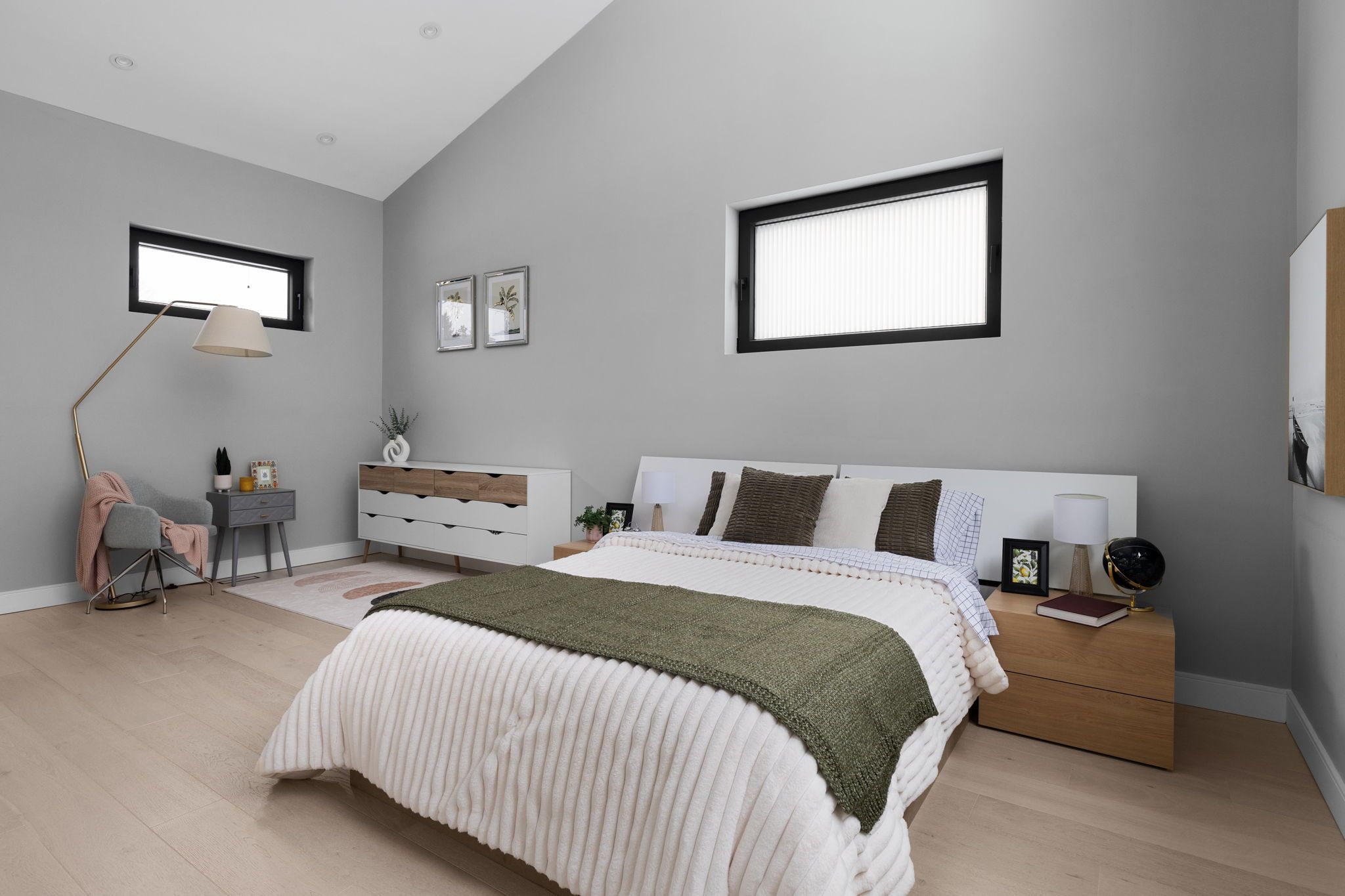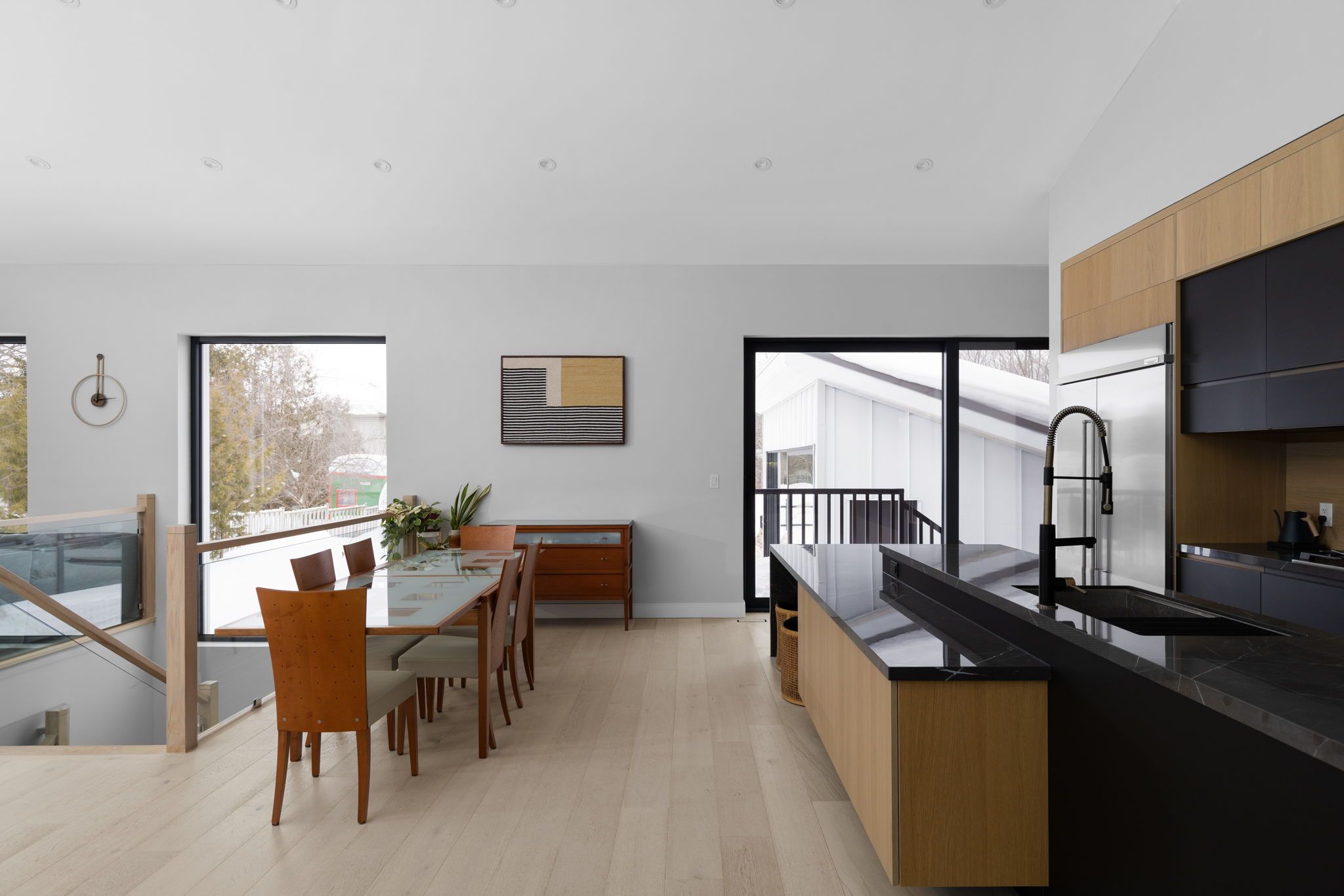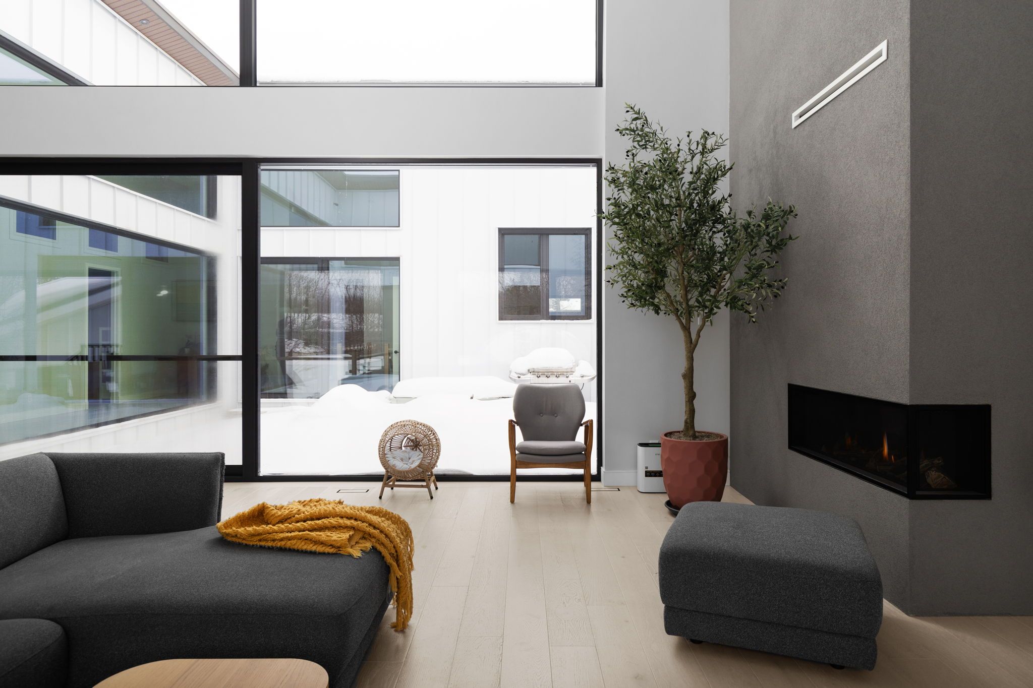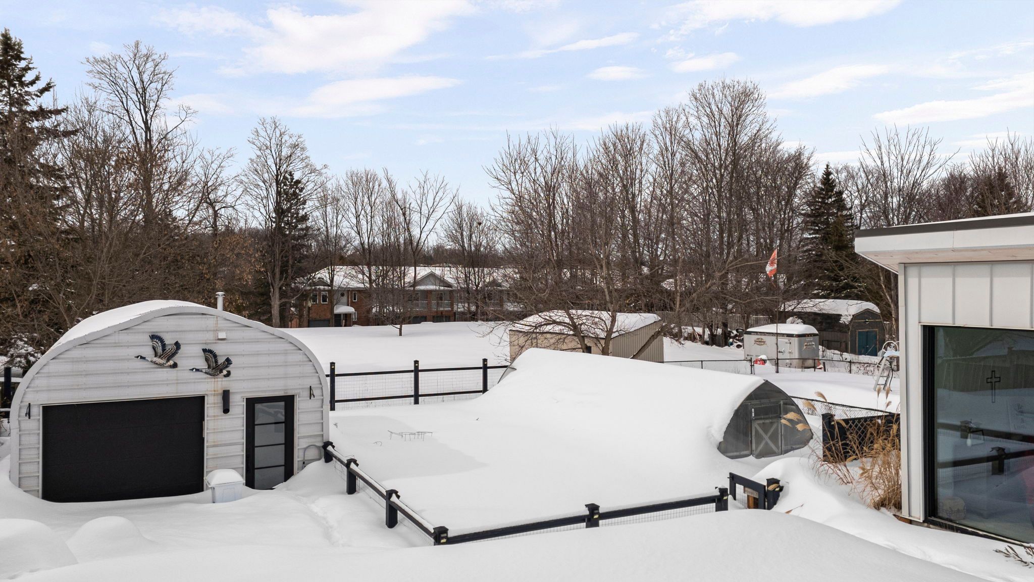 Architectural. Refined. Turn-key. Exceptional custom-built bungalow (2021) offering over 4,300 sq ft of finished living space, complete with a private courtyard retreat, insulated quonset hut, and summer house. Constructed with r35 icf for superior efficiency and durability, and finished with a standing seam aluminum roof, aluminum siding, and aluminum windows. Striking angular rooflines, rich wood accents, and professionally landscaped grounds create remarkable curb appeal. Open-concept interior featuring 17-ft cathedral ceilings, engineered hardwood flooring, and a chef-inspired kitchen imported from greece with porcelain countertops, waterfall island, premium kitchenaid and monogram appliances, and a full butler's pantry. All main-level bedrooms offer private ensuites, including a spa-like primary with freestanding tub and glass shower. Fully finished lower level with 9-ft ceilings, rec room with fireplace, wet bar, office, bonus room, additional bedroom, laundry, and 4-piece bath. Gas hot water on demand. 200-amp service (home), 100-amp (garage), 60-amp (quonset hut). Outdoor courtyard includes gas line; raised garden beds and greenhouse complete the property. A rare, design-forward offering combining craftsmanship, efficiency, and lifestyle.
