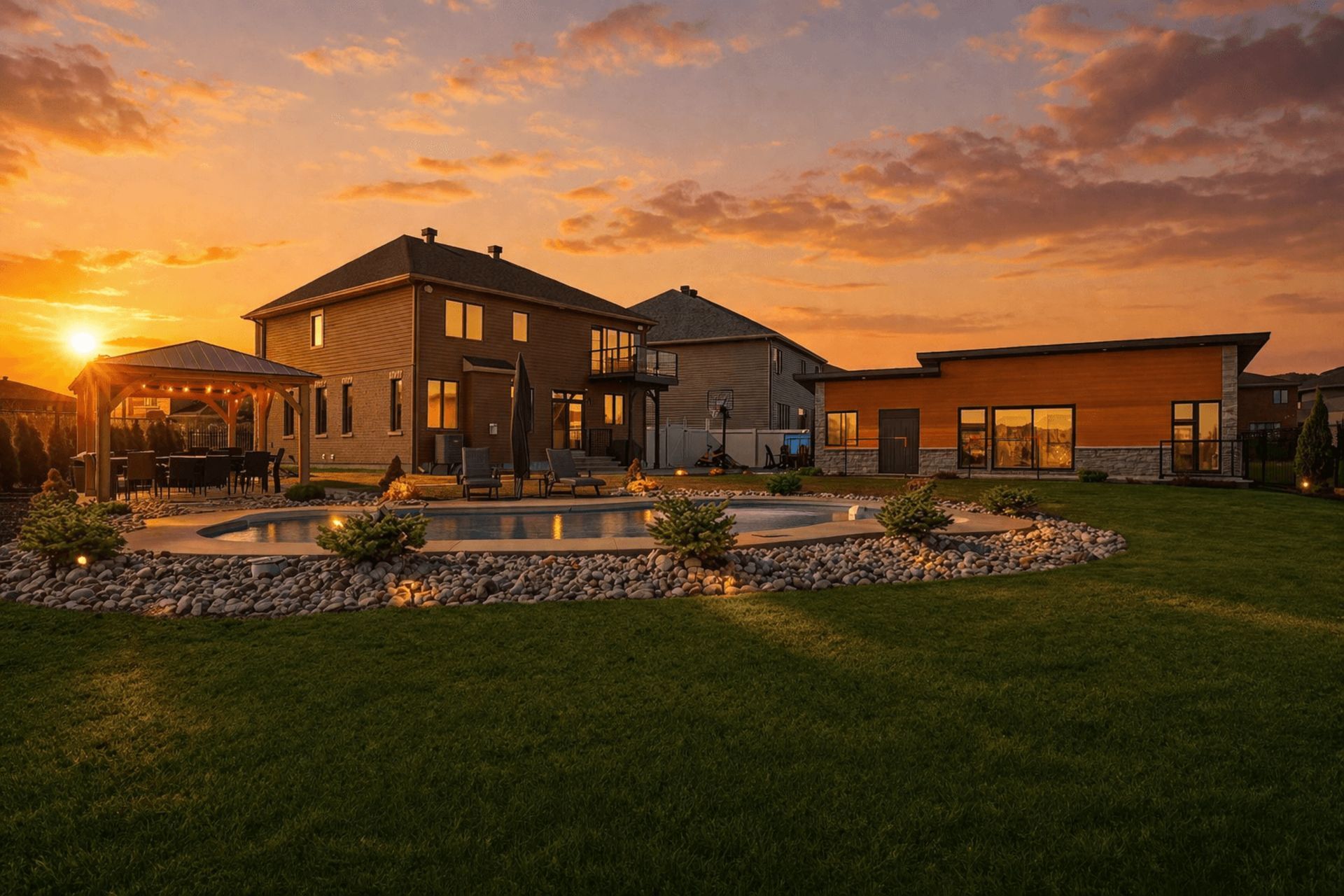 Step into a statement of luxury in one of avalon's most coveted settings. This exceptional 4+1 bedroom residence is perfectly positioned on one of the largest lots in the community, backing onto no rear neighbours and offering a rare level of privacy and scale. Inside, every detail has been thoughtfully curated. The chef-inspired kitchen is the true centerpiece-designed for both elevated entertaining and effortless everyday living, with premium finishes, generous workspace, and seamless flow into the main living areas. The absence of carpet throughout enhances the home's clean, modern aesthetic while offering durability and ease of maintenance. The fully finished basement extends the living space beautifully, featuring a spacious rec room, an additional bedroom, and a full bathroom - ideal for guests, multigenerational living, or creating the ultimate entertainment zone. Outdoors, the property transforms into a private resort-style retreat. The expansive lot provides endless space to relax and entertain, highlighted by a stunning inground swimming pool. Adding to the exclusivity is a detached backyard structure, thoughtfully designed as a private office and fully equipped gym - perfect for those who value both productivity and wellness without ever leaving home. This is more than a home - it's a lifestyle. Rarely offered and truly one-of-a-kind in avalon, this property delivers luxury, flexibility, and unmatched outdoor living on a grand scale.