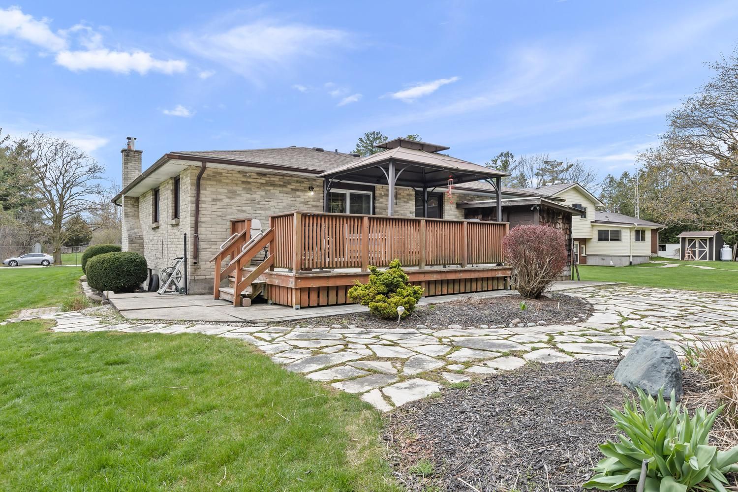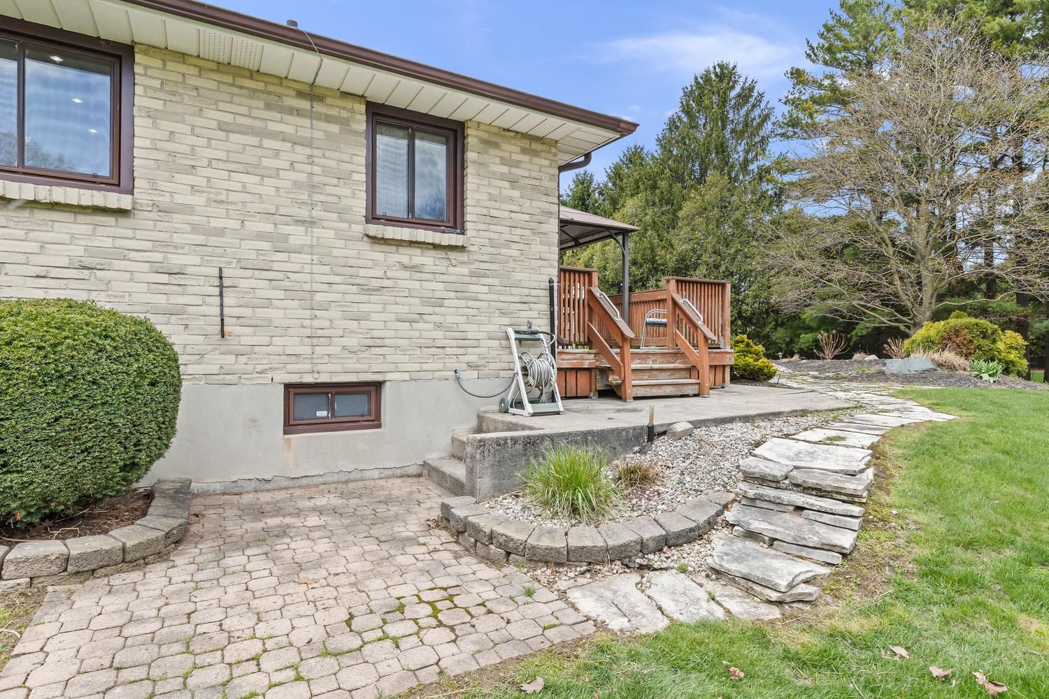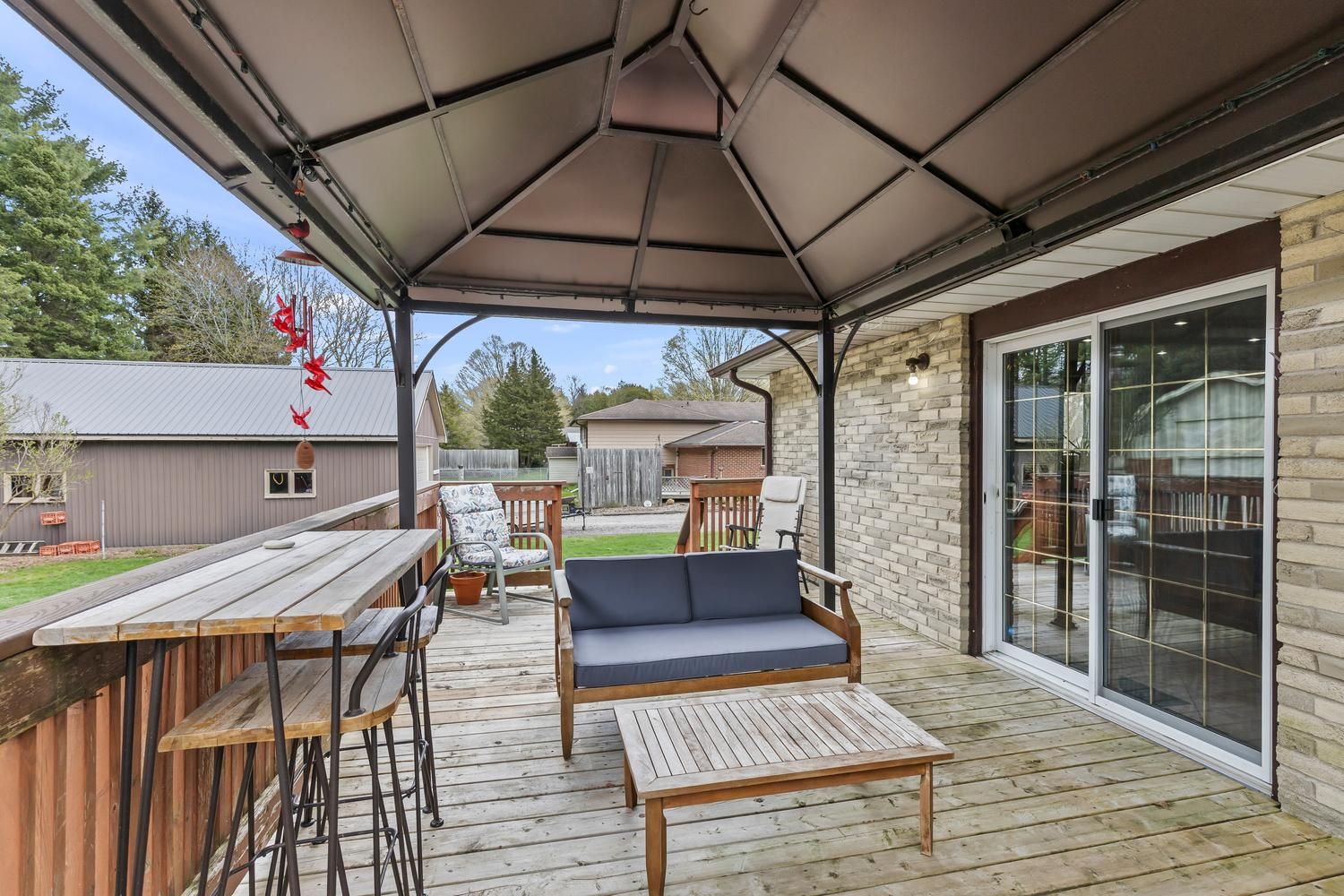 • Large deck with views of the private, treed yard for relaxation.