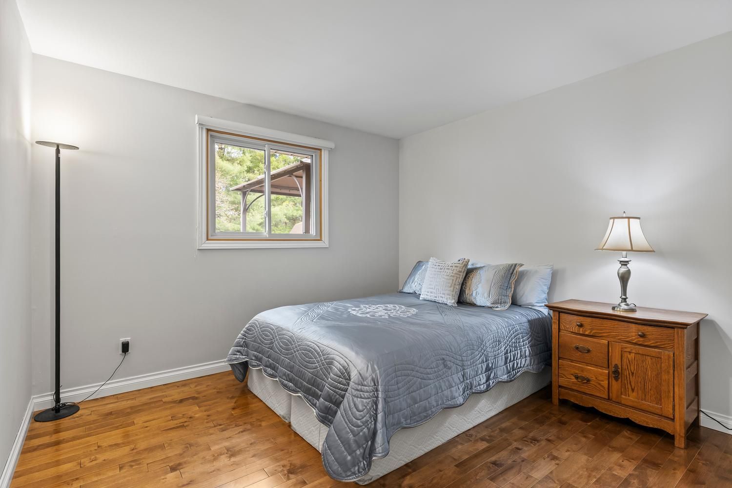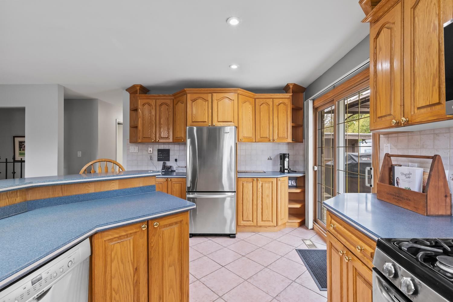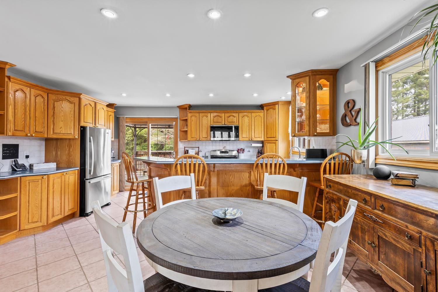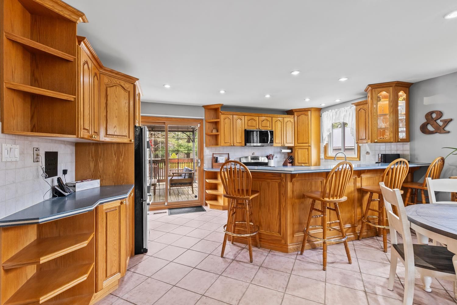 • Large deck with views of the private, treed yard for relaxation.