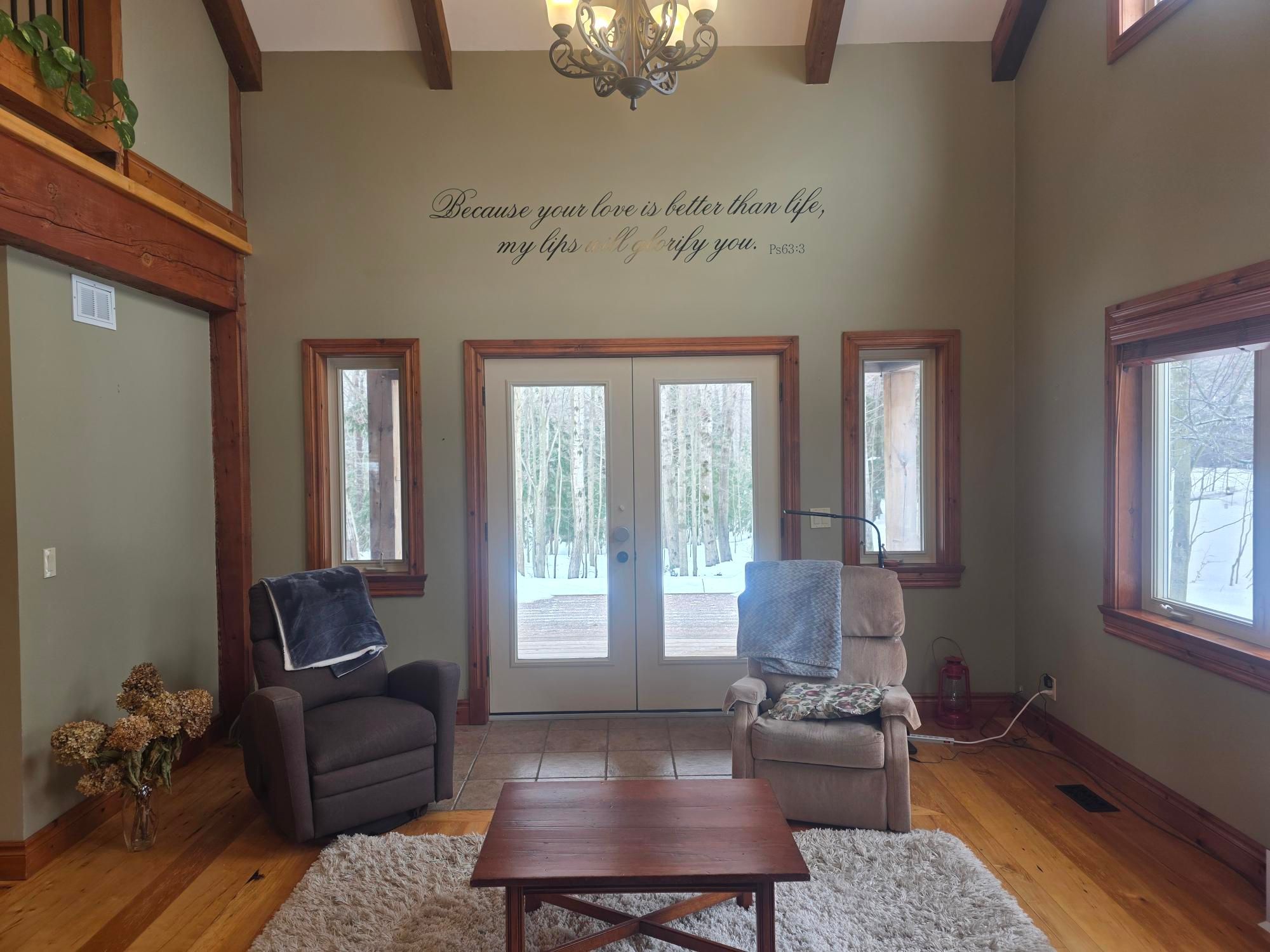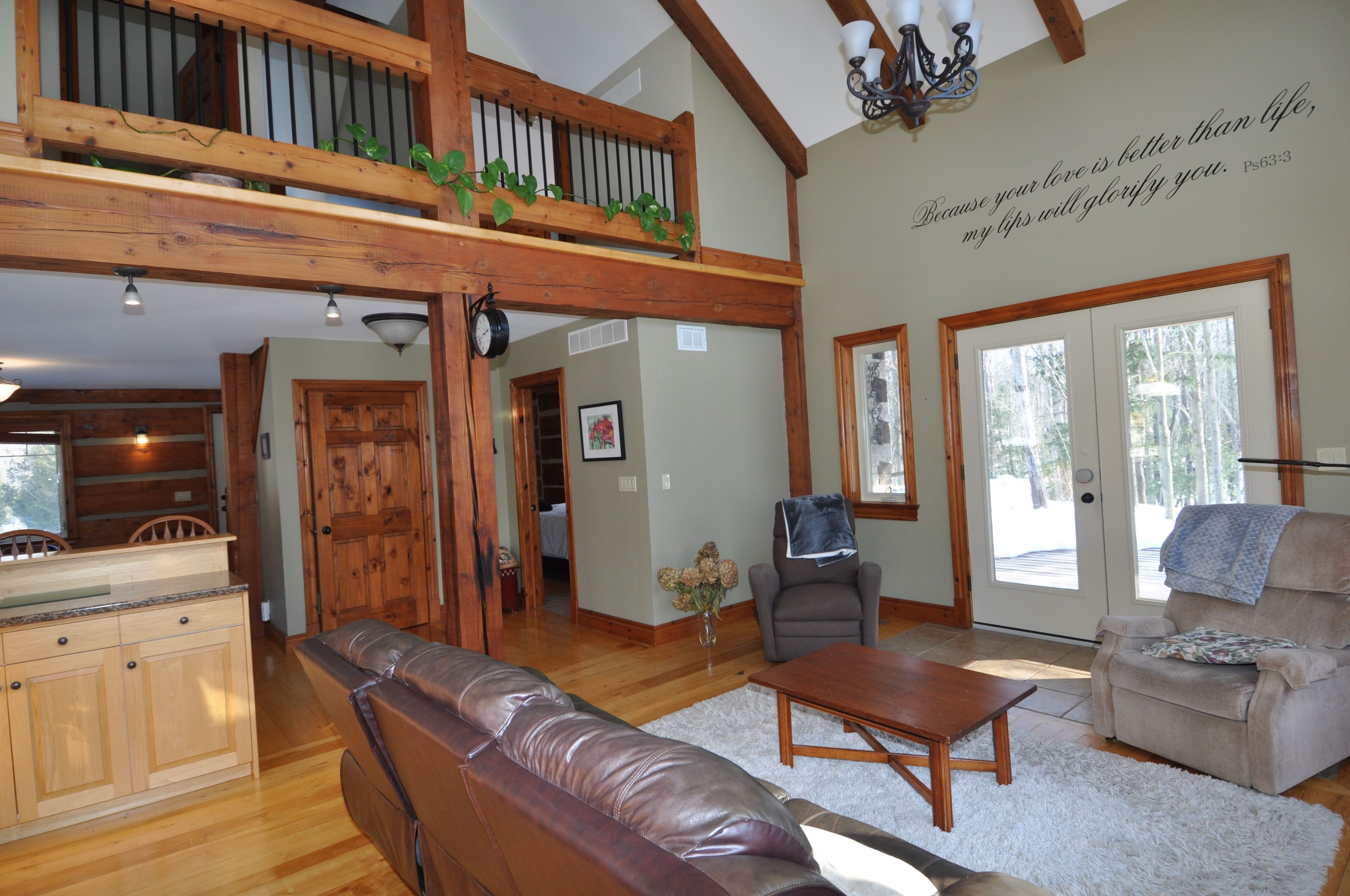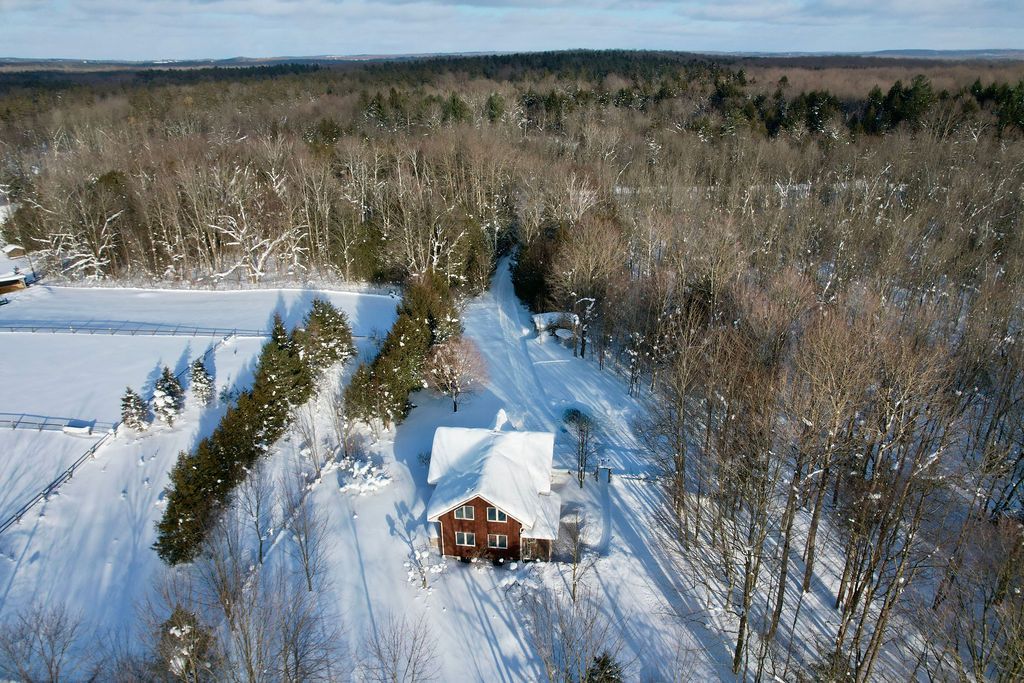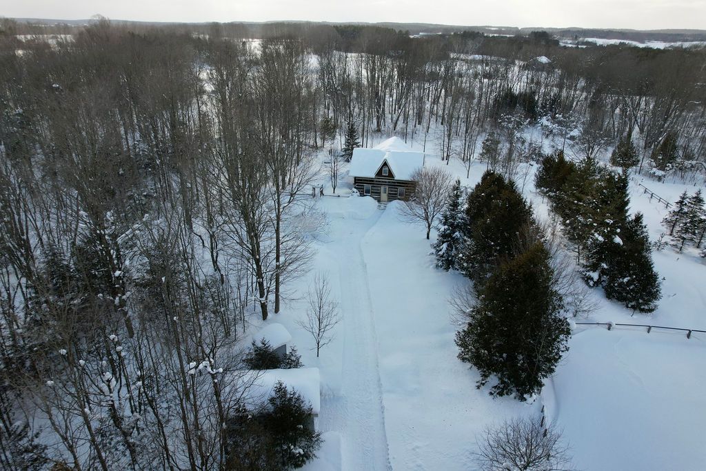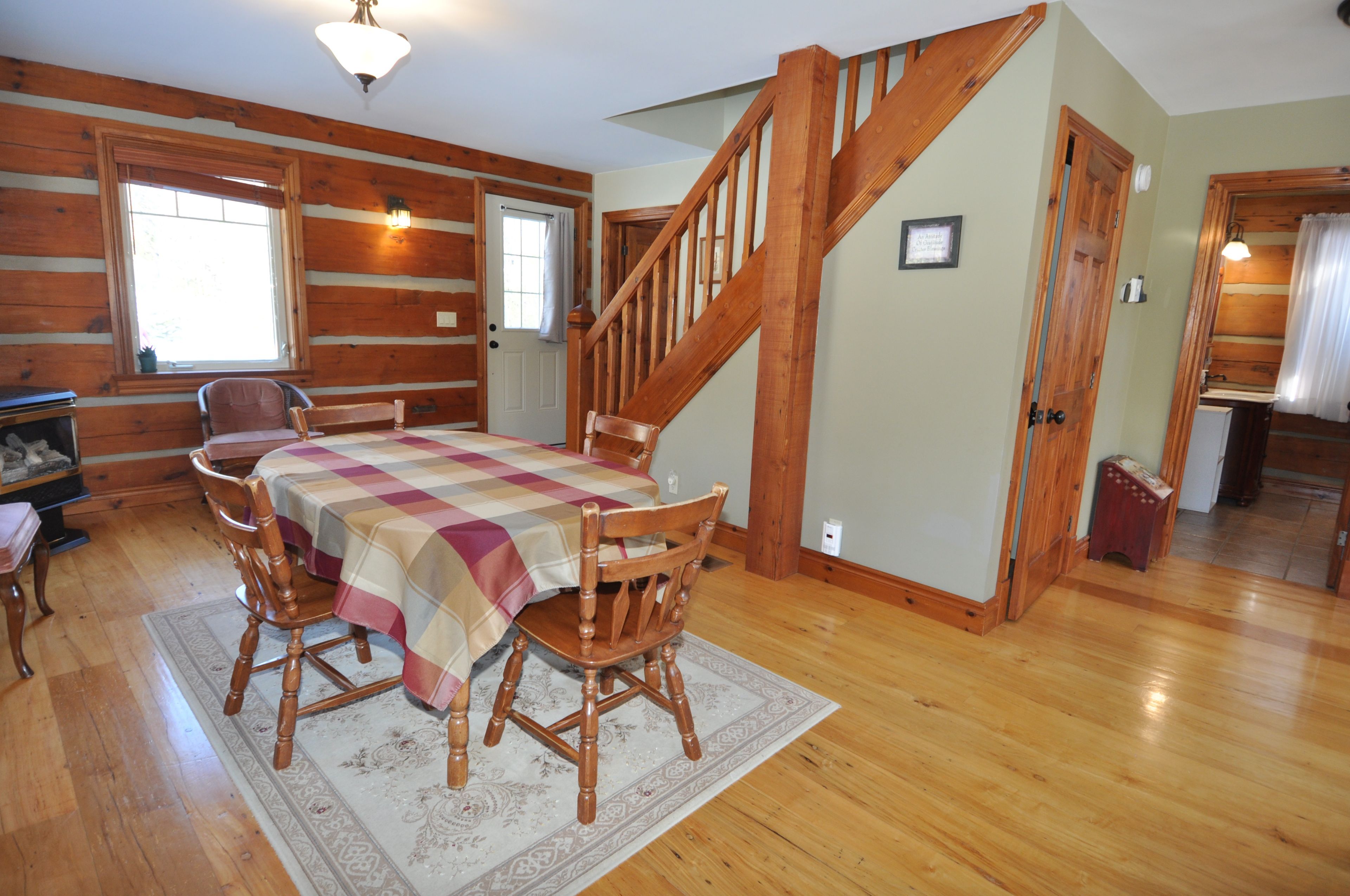 Set well back from the road down a long, winding laneway, this stunning 1 1/2 storey fir log home offers the perfect blend of rustic charm and modern comfort on a private 2. 5-acre setting. Built in 2009, the home welcomes you with warm maple floors, solid pine doors, and striking interior fir beams that showcase its craftsmanship and character. The bright open-concept design is enhanced by an abundance of windows that flood the living spaces with natural light and capture peaceful views of the surrounding greenspace. The spacious kitchen features a convenient breakfast bar and flows seamlessly into the dining and living areas, where a cozy propane fireplace adds warmth and ambiance. A generous side deck extends your living space outdoors-ideal for relaxing or entertaining while overlooking the serene landscape. The main floor primary bedroom offers ensuite privileges , a second full bath in the lower level with two additional bedrooms both with walkin closets upstairs, provides ample space for family or guests. A mezzanine area above overlooks the kitchen and living room, creating a beautiful architectural feature and a perfect spot for a home office or reading retreat with treetop views. The unfinished basement is ready for your personal touch and already includes in-floor heating for future comfort. Thoughtful outdoor additions complete the property, including a firepit area, flagstone path, walking trails through the woods, irrigation system, landscape lighting, and a storage shed. With central air conditioning and exceptional privacy, this unique log home offers a peaceful country lifestyle with modern amenities.
