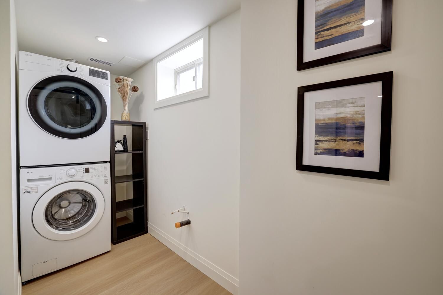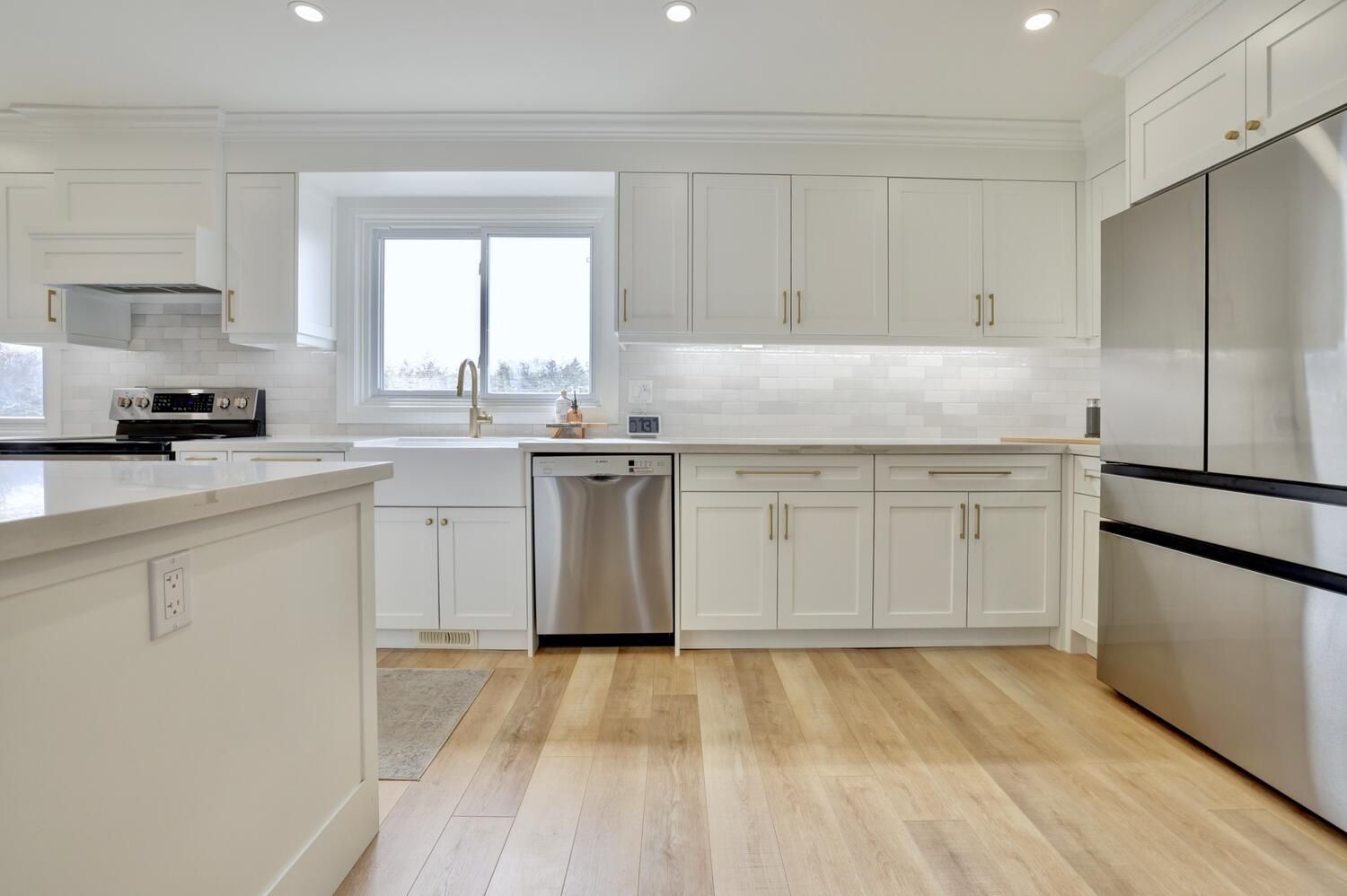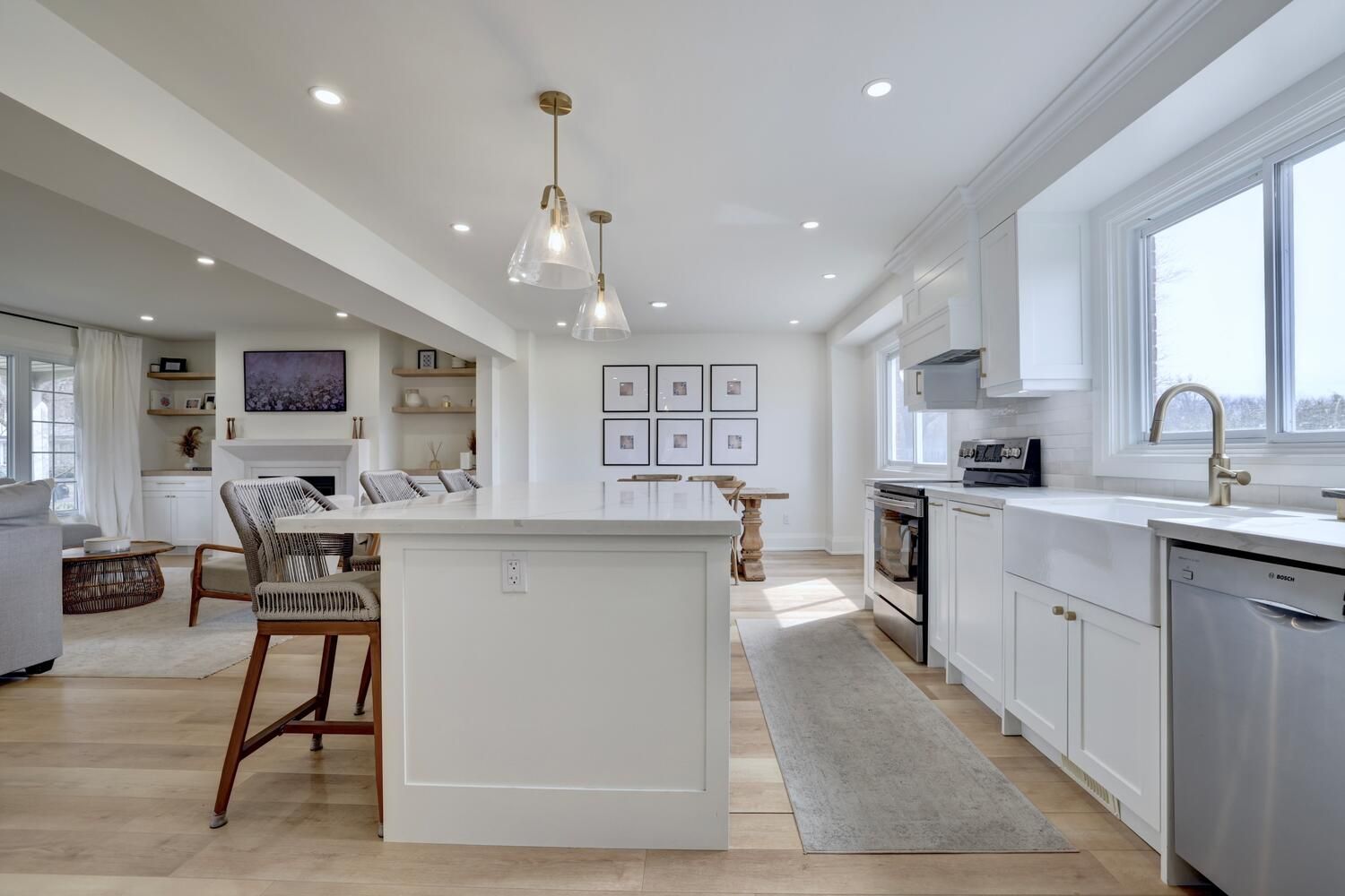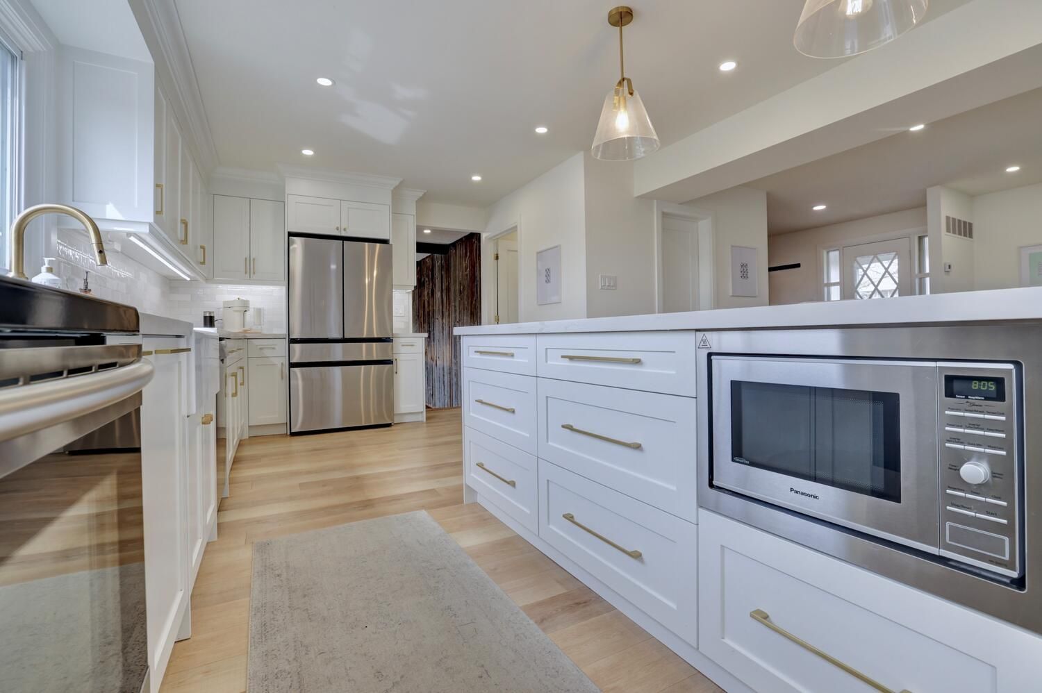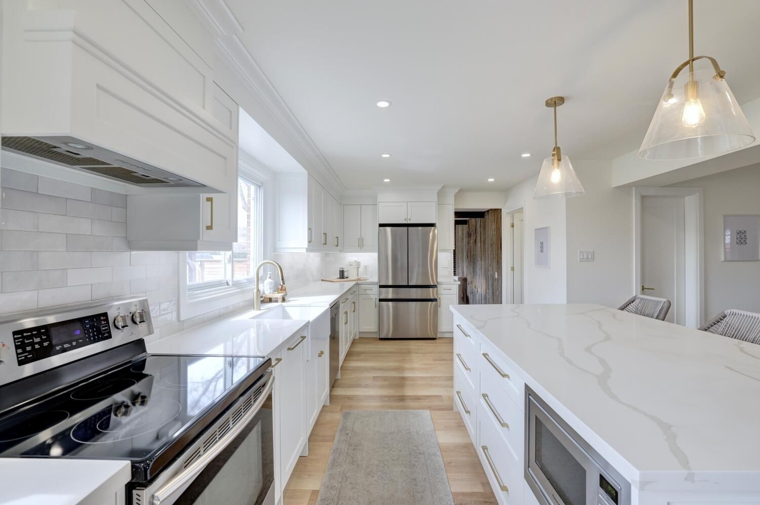• Designer kitchen with quartz countertops and stainless steel appliances.