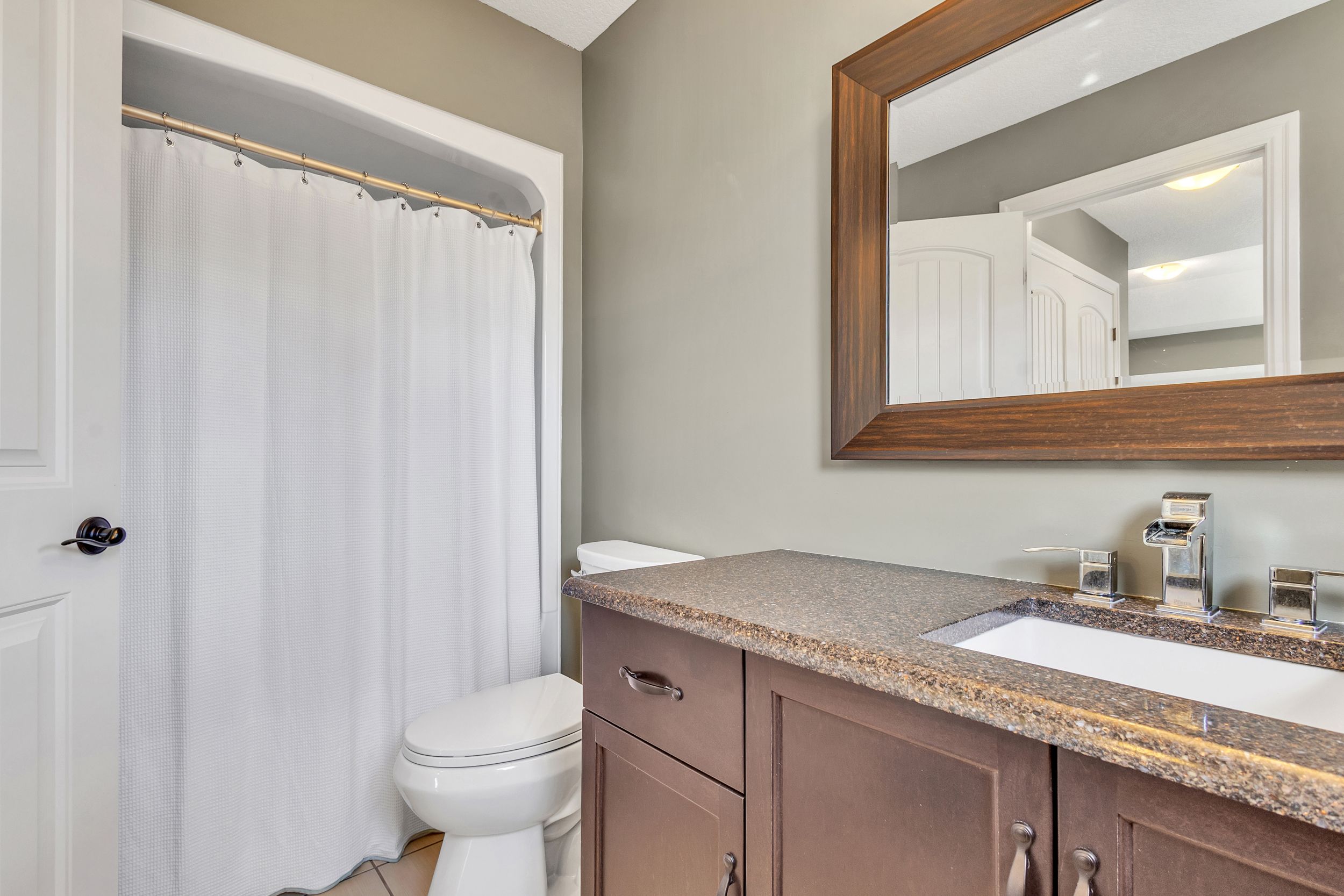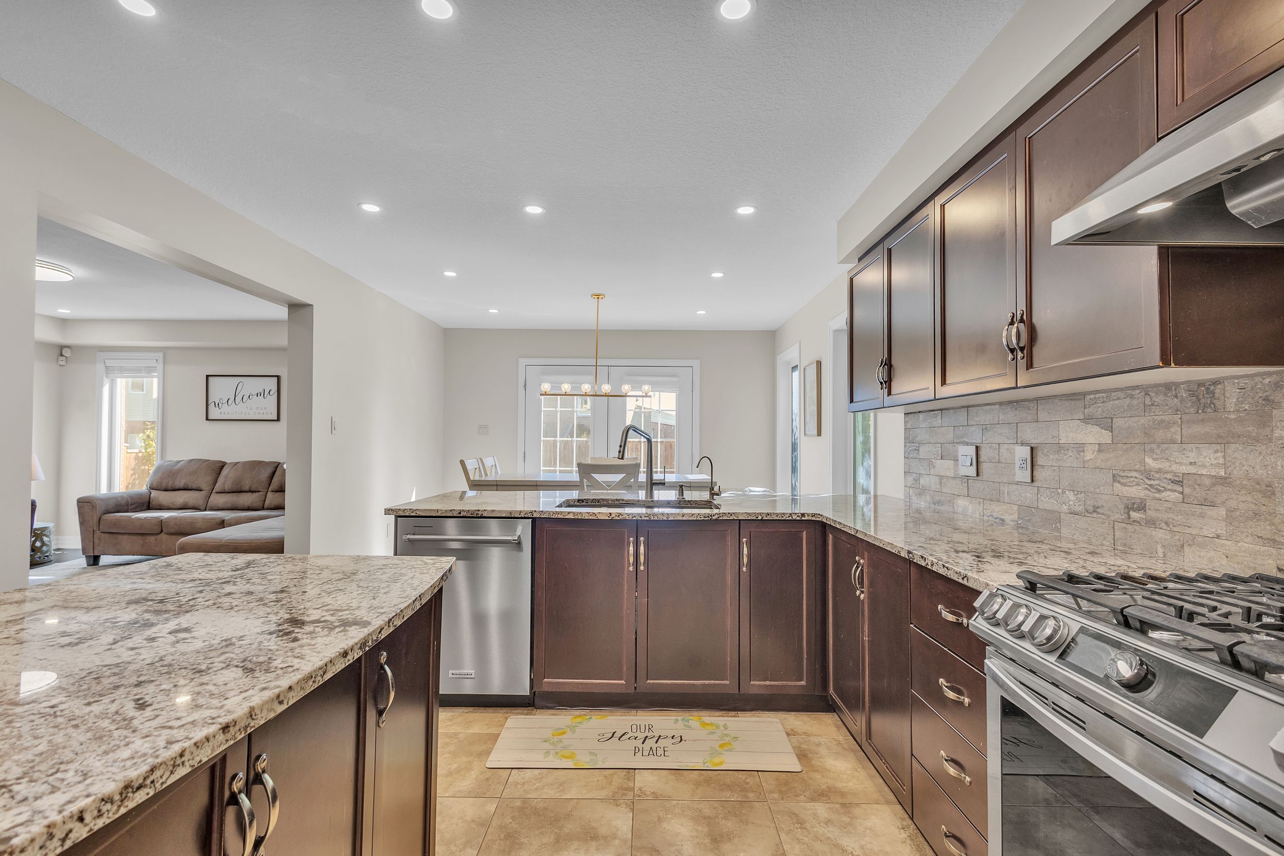 • Modern kitchen with granite countertops and stainless-steel appliances.