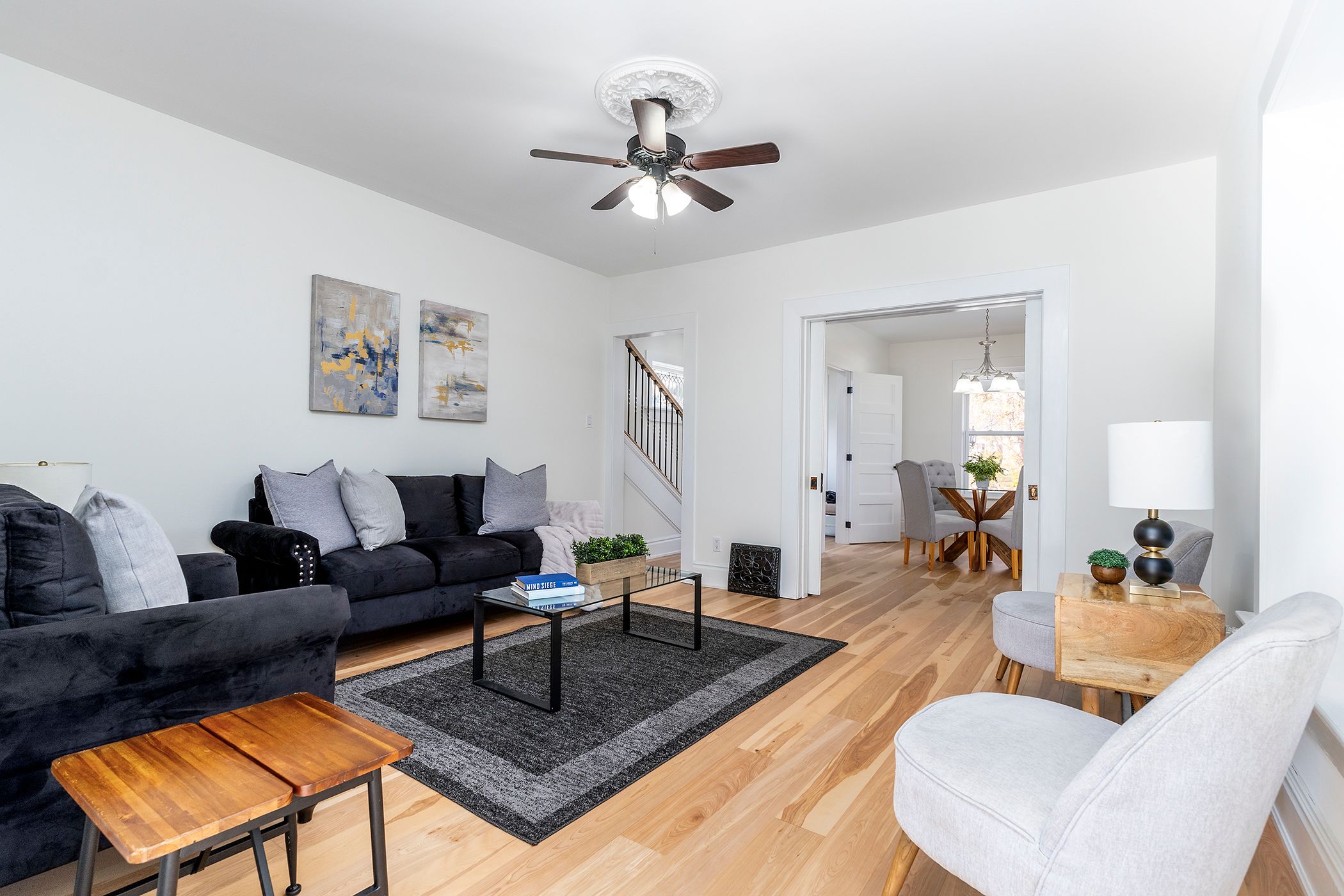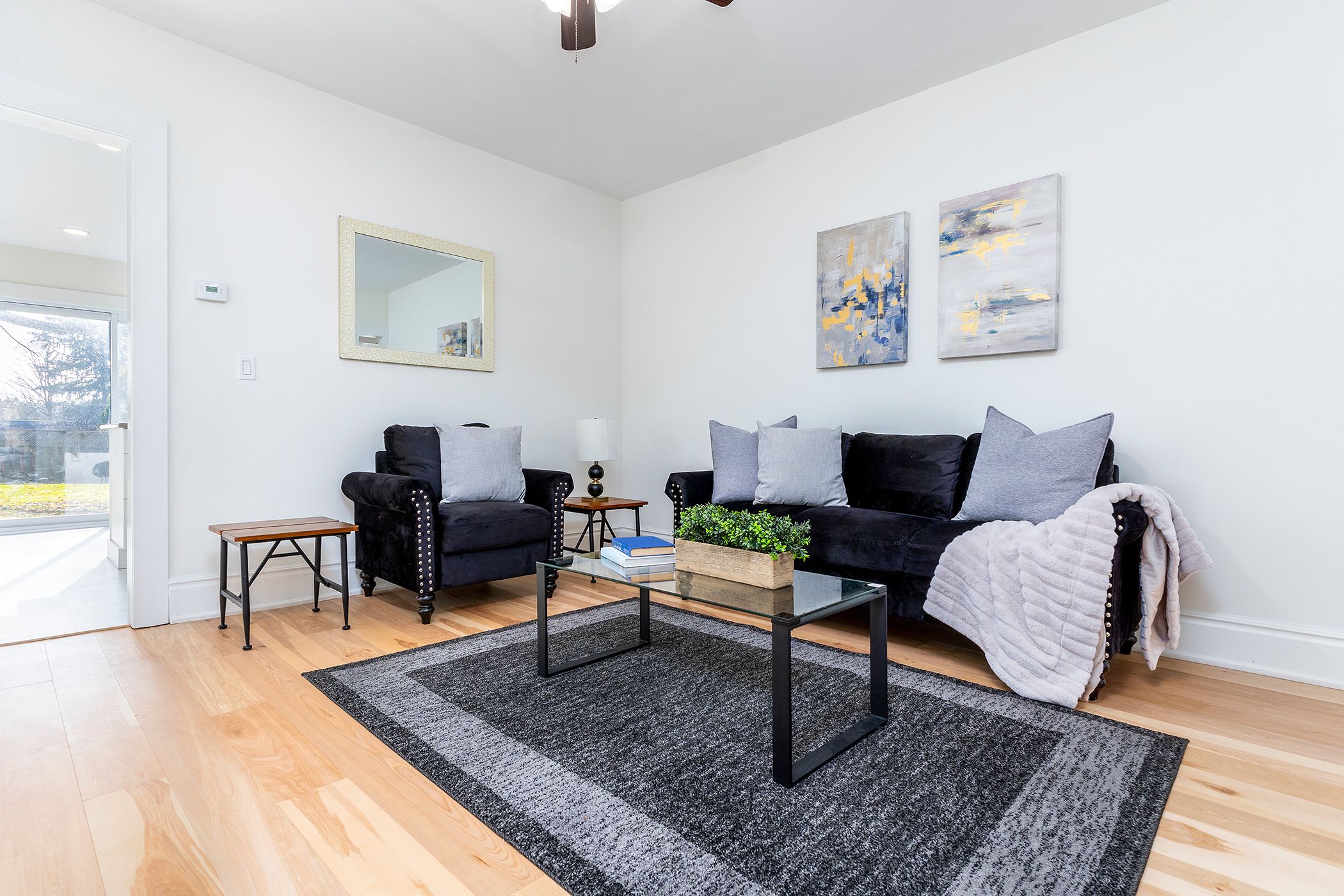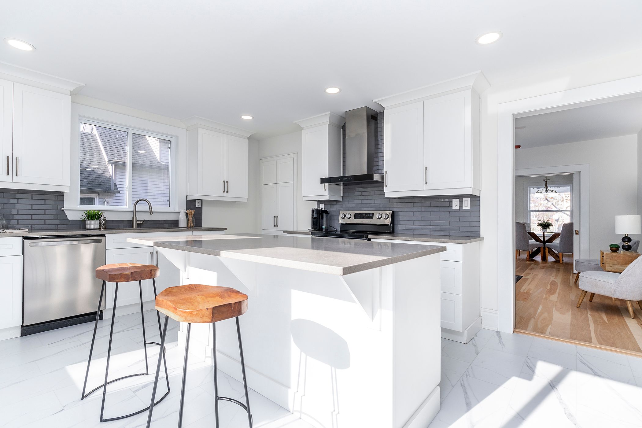 • Eat-in kitchen features quartz counters, a large island, and backyard access.