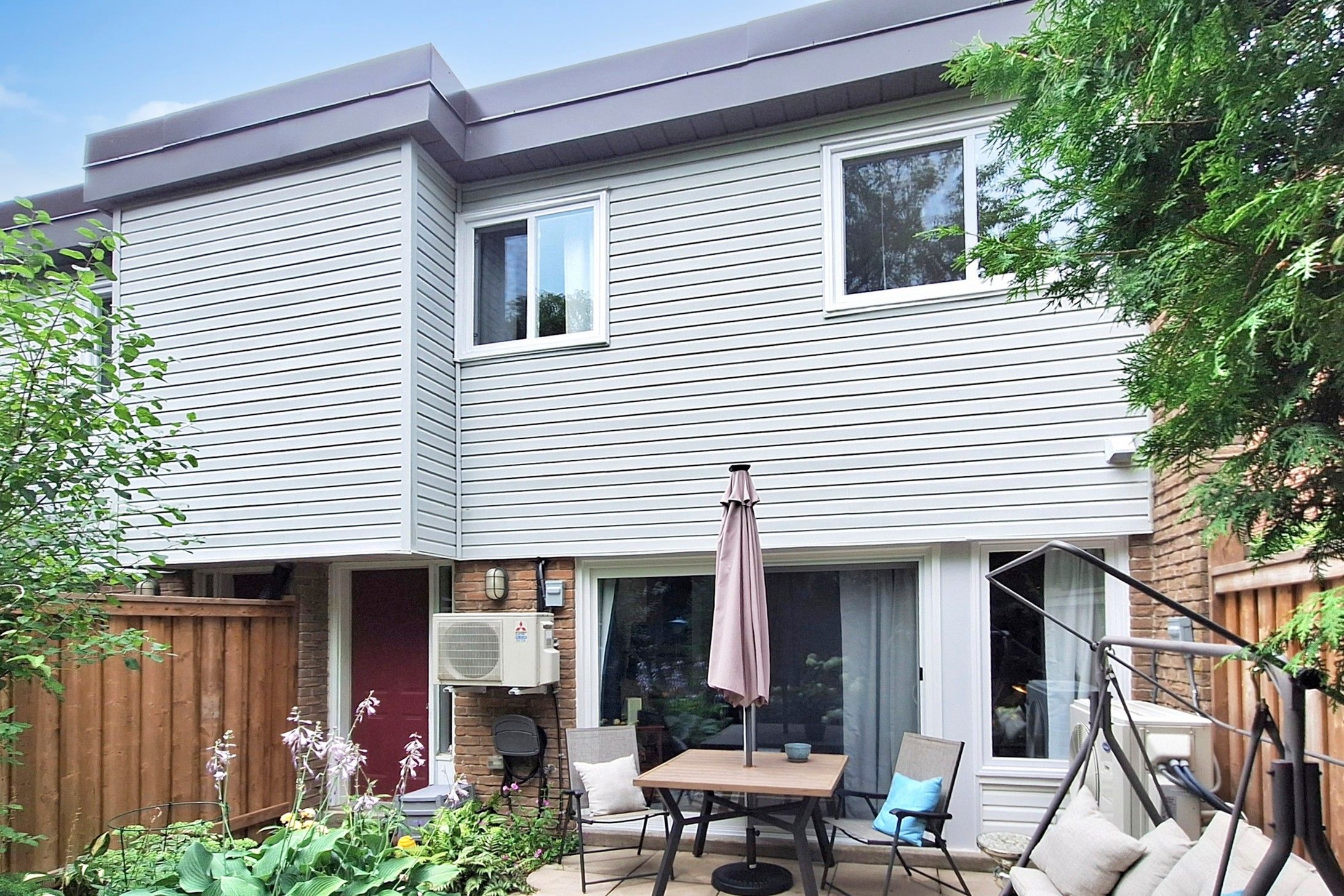 Beautifully updated condo townhome in the heart of aurora, close to schools, transit and shopping. One of only a few premium townhomes in the complex backing onto mature trees and a private walking trail, this renovated 3-bed, 2-bath unit offers true indoor-outdoor living. Enjoy your own tranquil garden and oversized patio perfect for coffee, dining, or peaceful evenings surrounded by nature. In addition, the complex offers a recently refurbished inground pool to cool off. Inside, the home features hardwood floors and the modern kitchen boasts quartz counters, sleek cabinetry and stainless steel appliances. The spacious living room flows seamlessly to the patio through large sliding doors with green views. Upstairs, the spacious primary suite offers two closets. Two additional bedrooms provide ample space and storage. Recently installed heat pump (2022) with heating/cooling units in all 3 bedrooms (plus existing in living room).