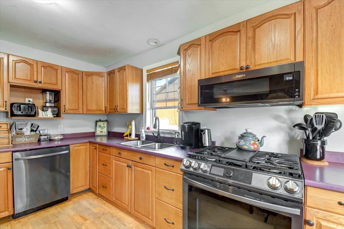 • Modern kitchen with stainless steel appliances and ample cabinetry.
