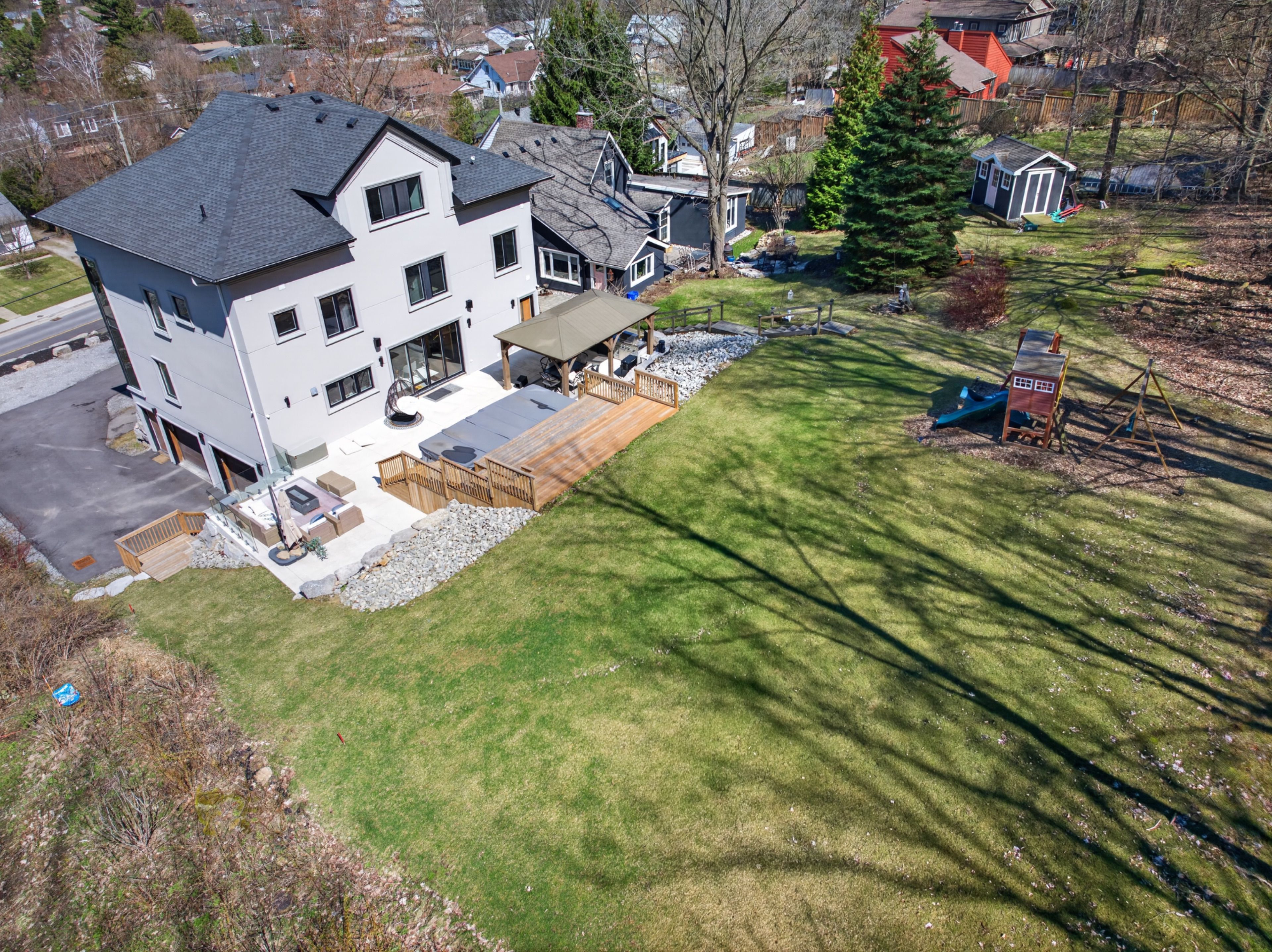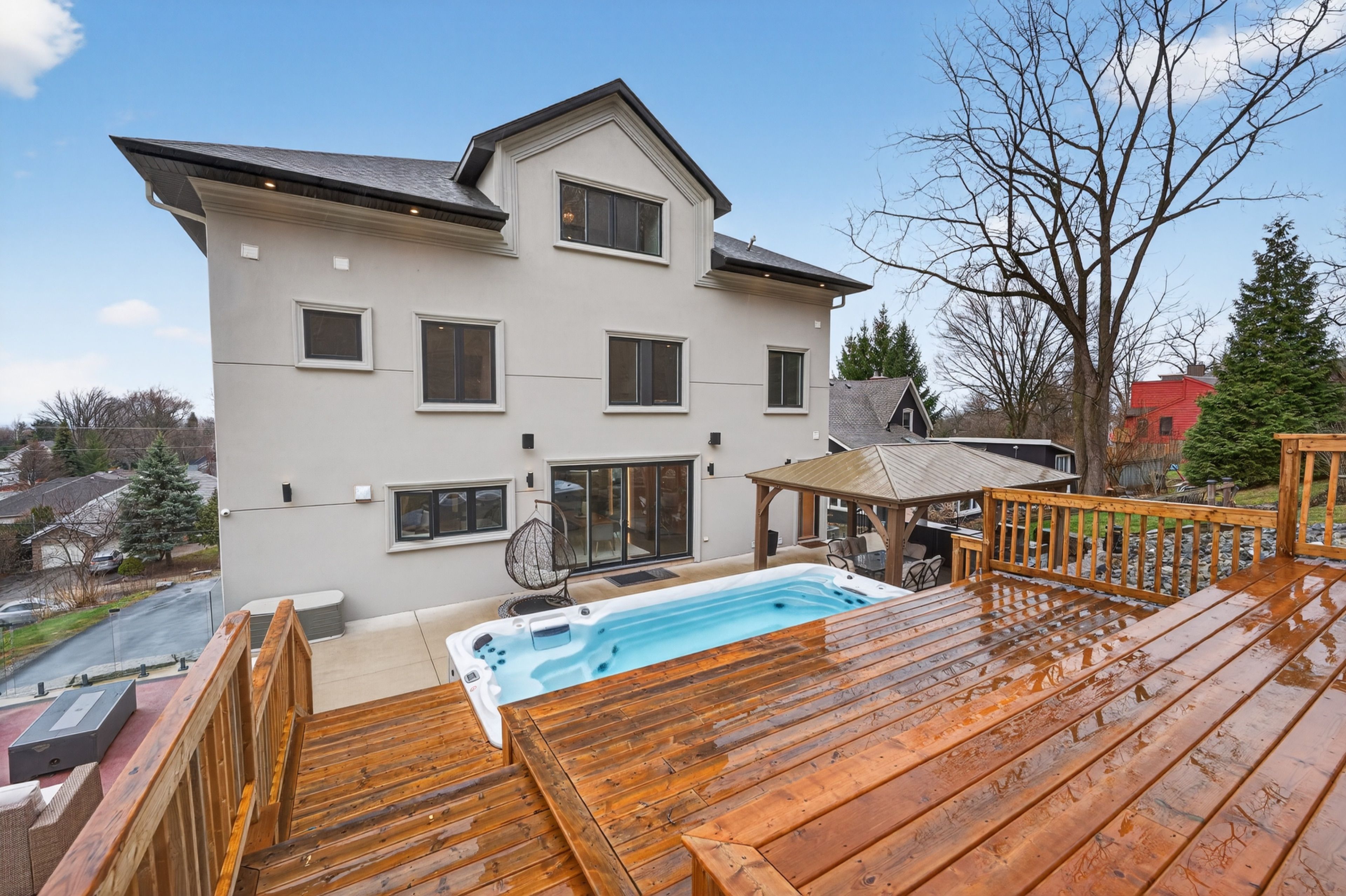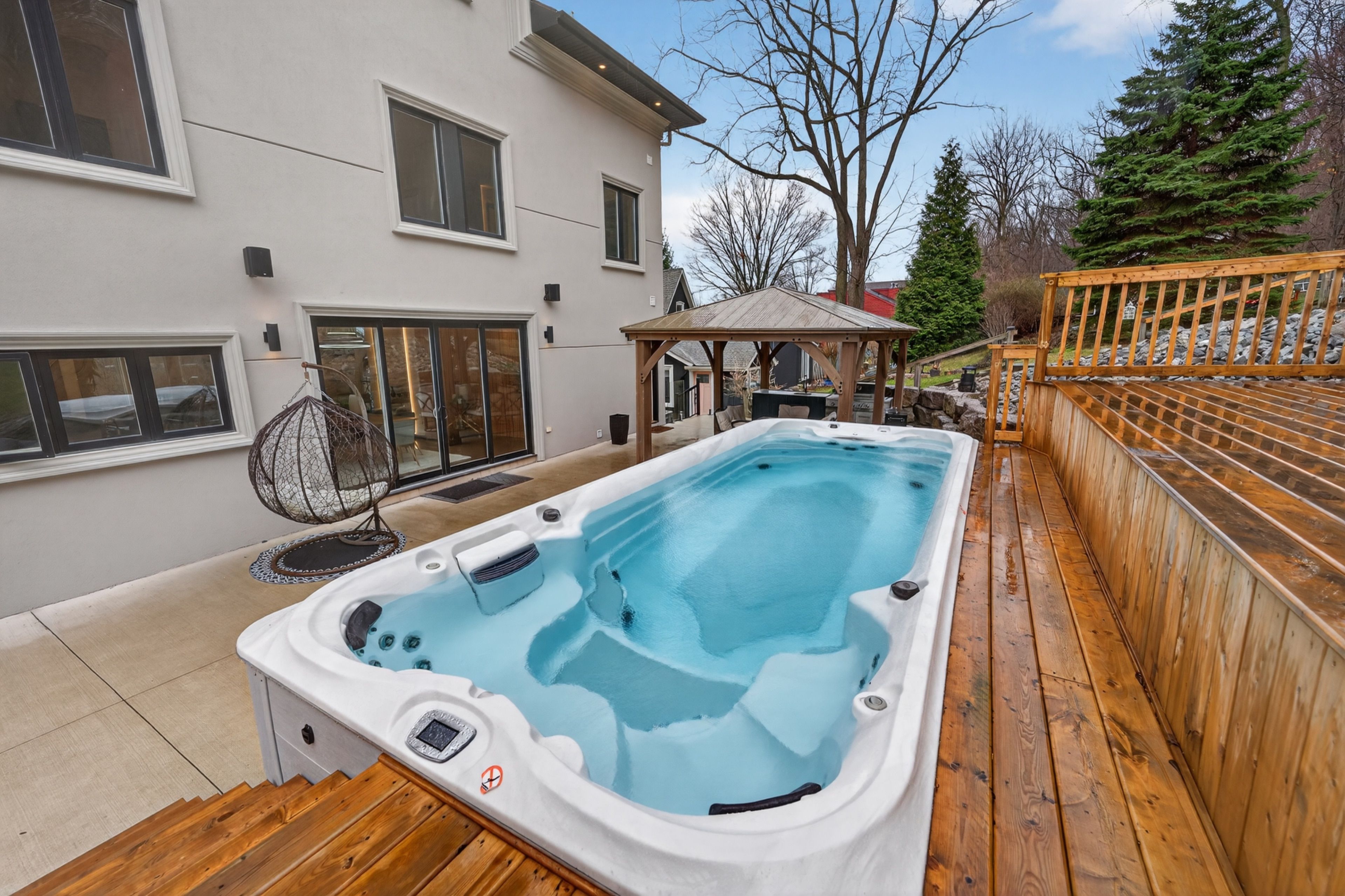 • Tiered backyard with a swim spa offers privacy and a peaceful environment.
