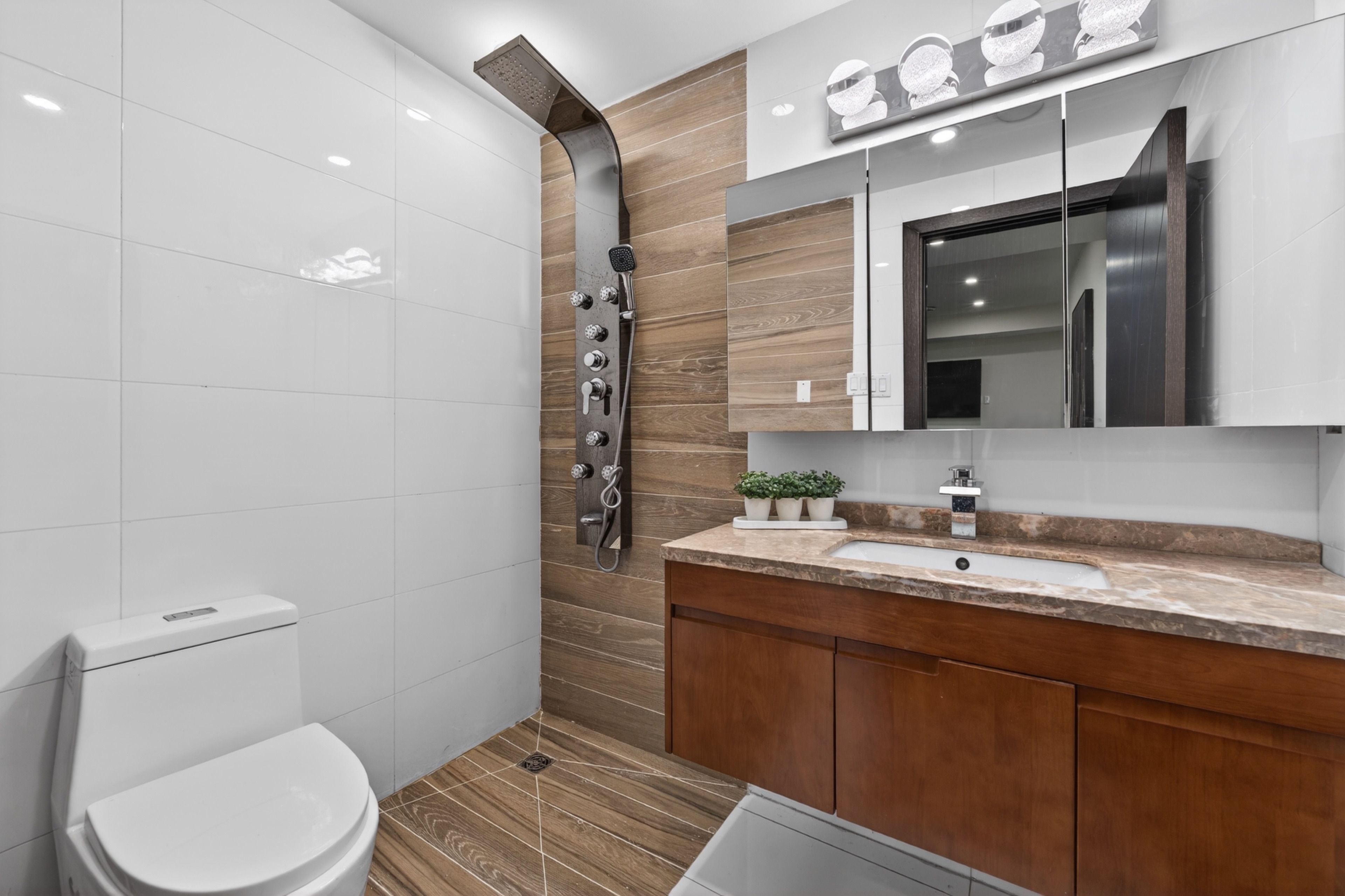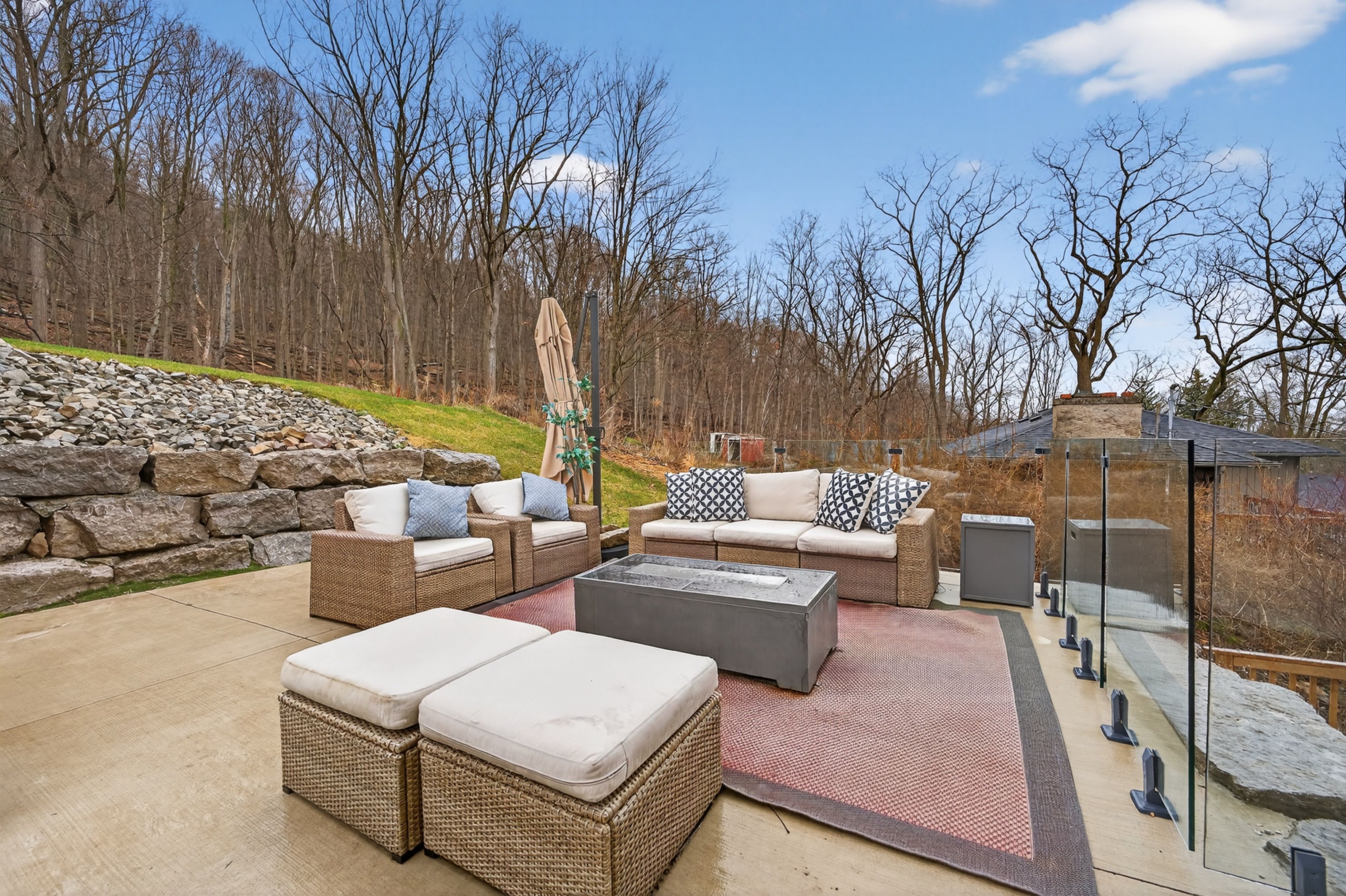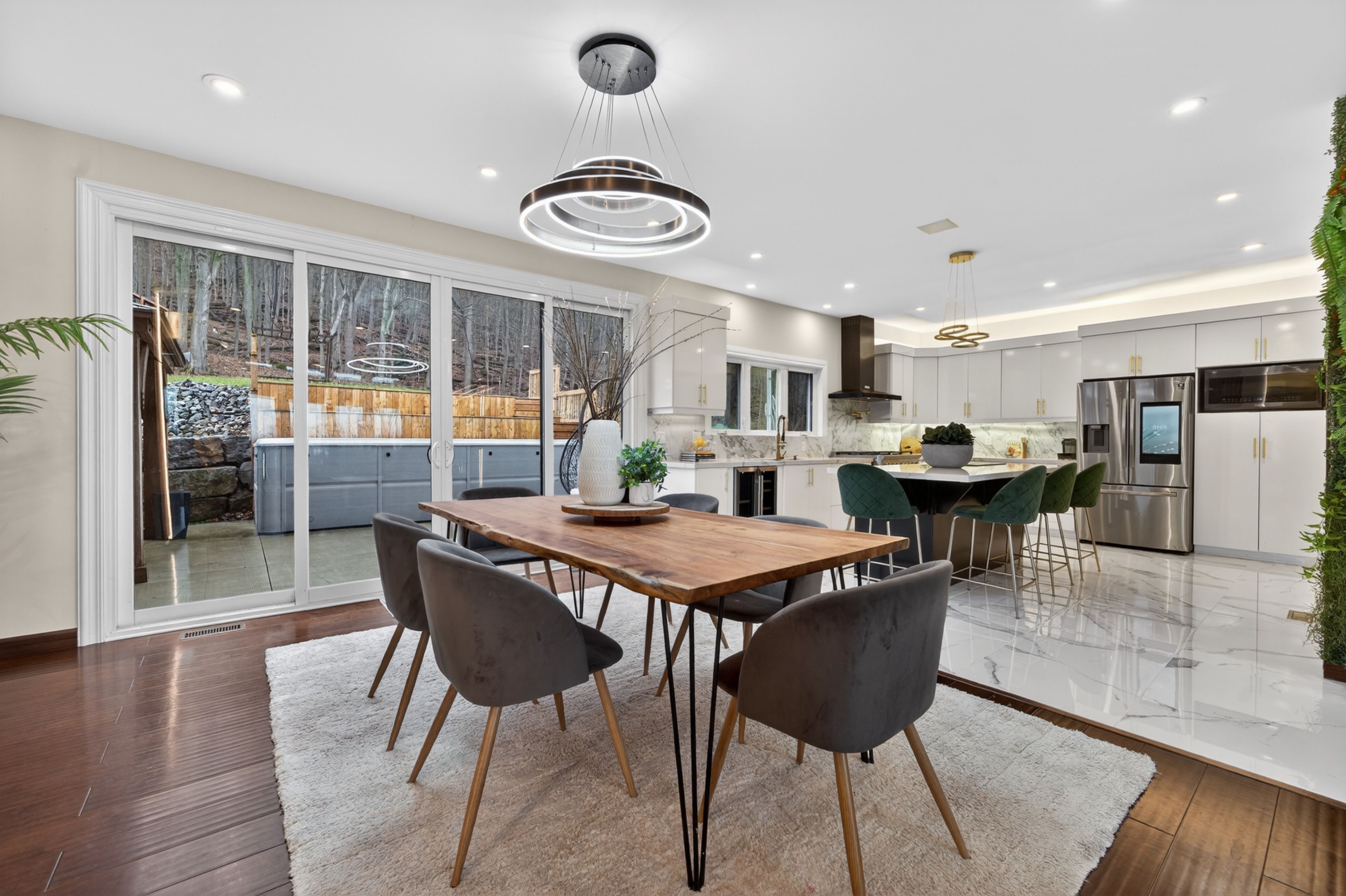 • Tiered backyard with a swim spa offers privacy and a peaceful environment.