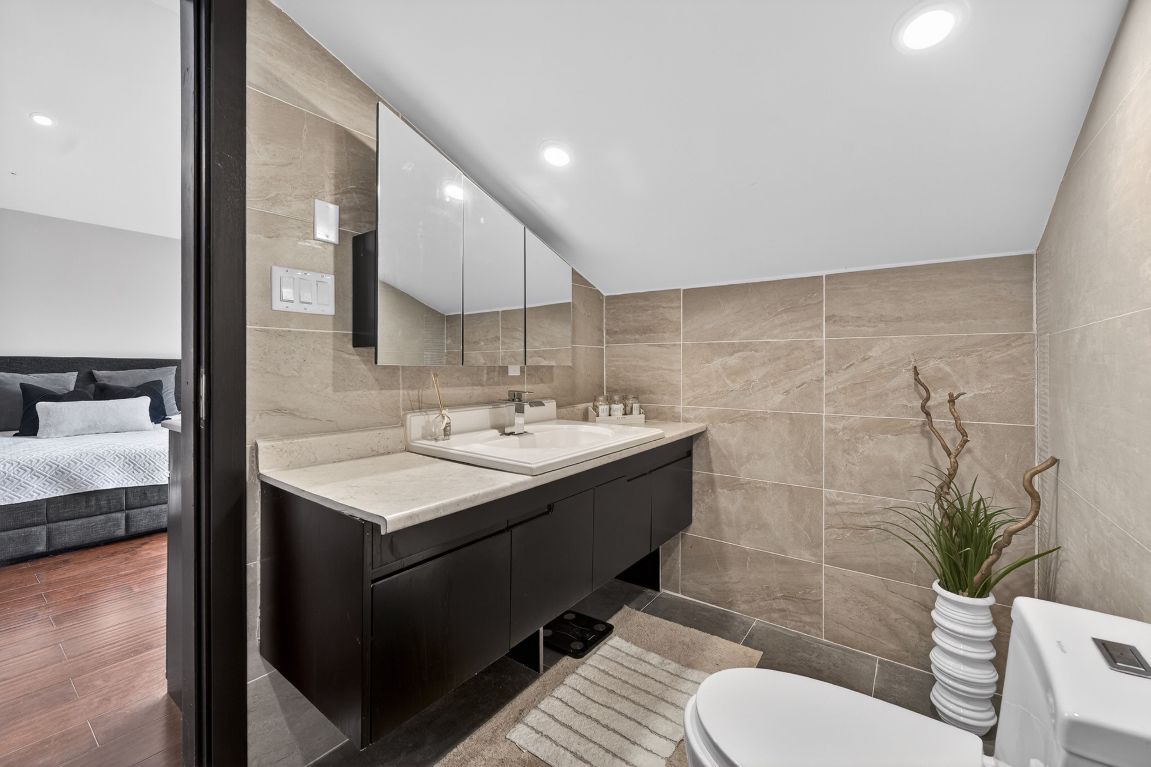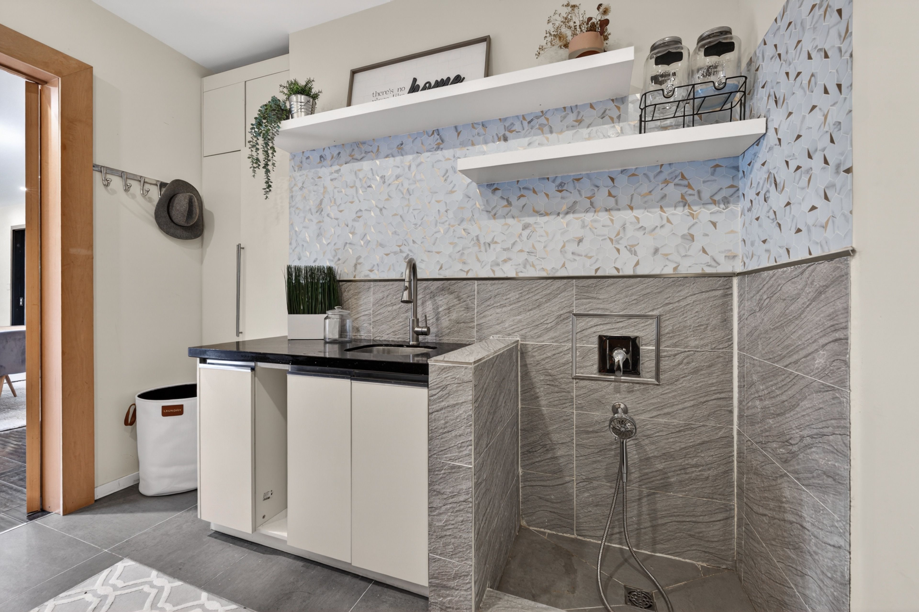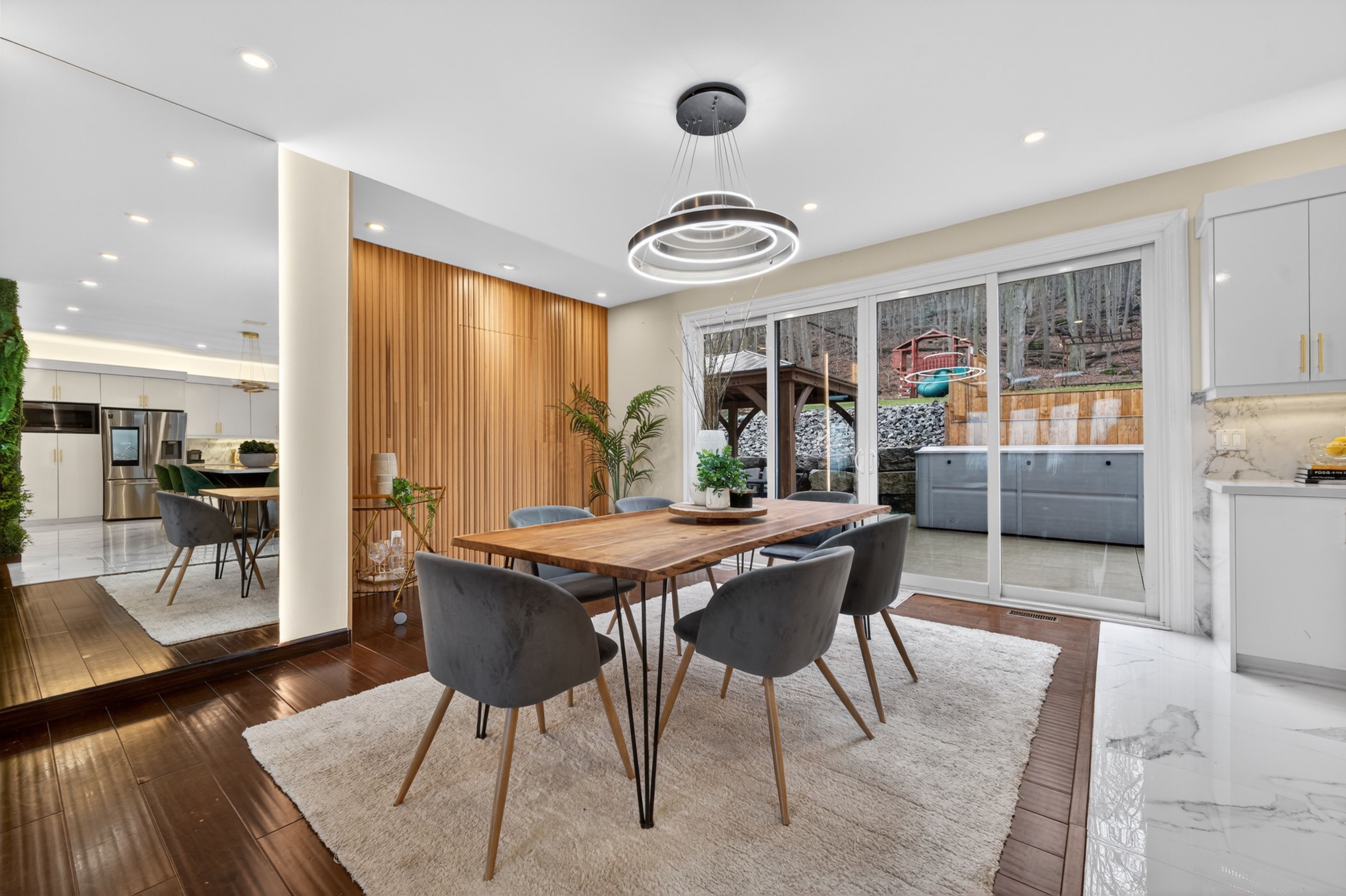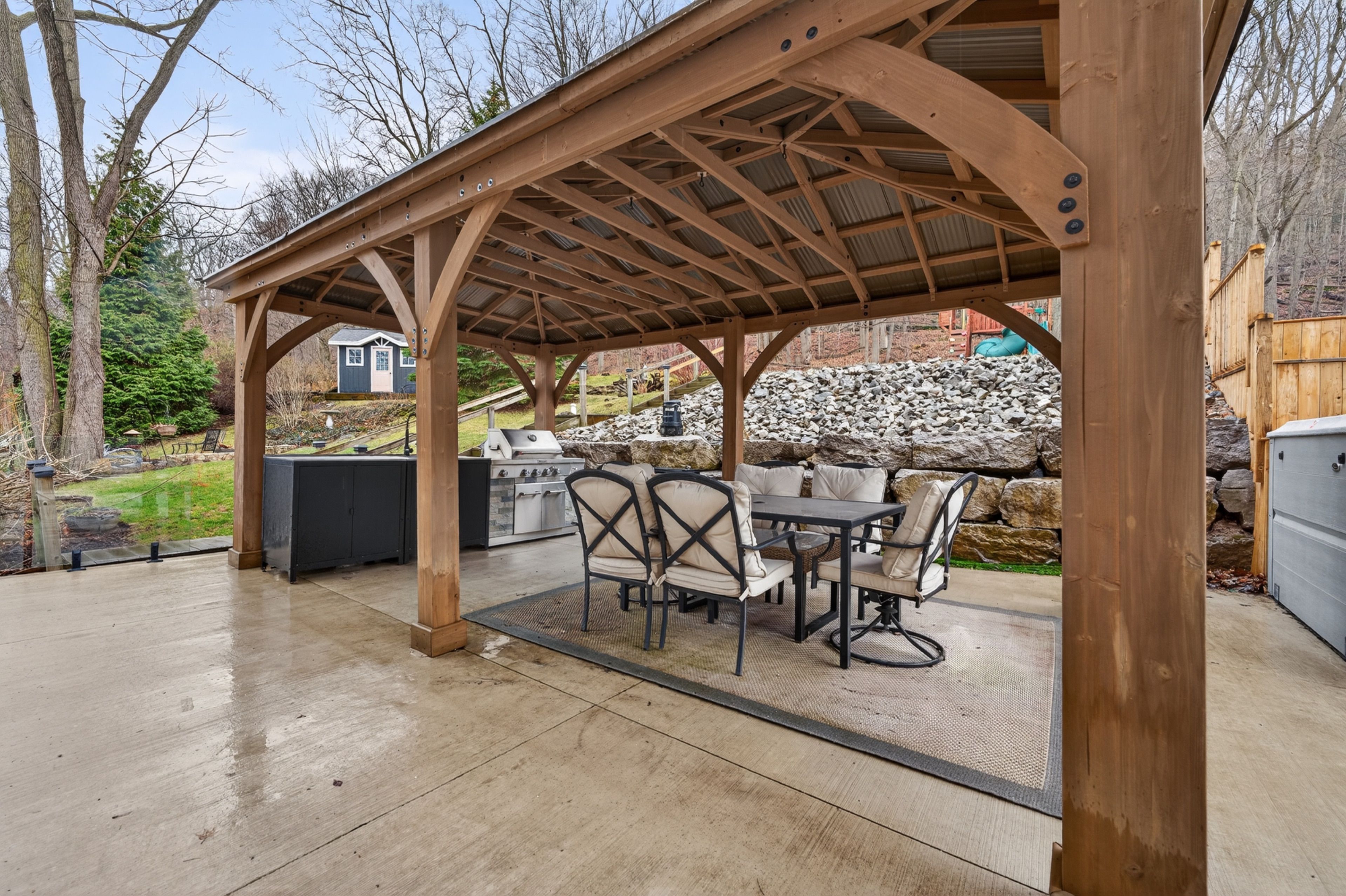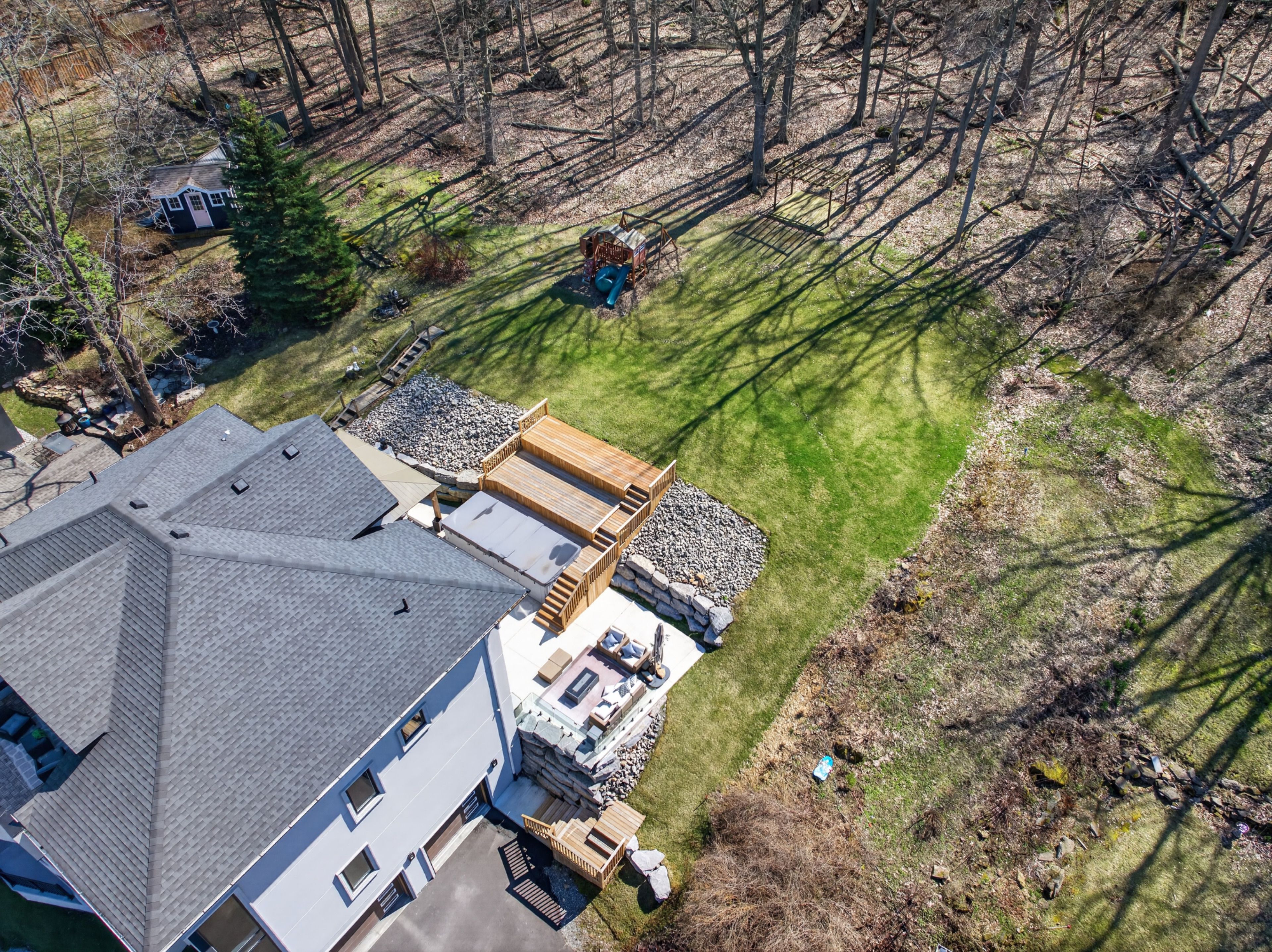 • Tiered backyard with swim spa, offering privacy and tranquility.