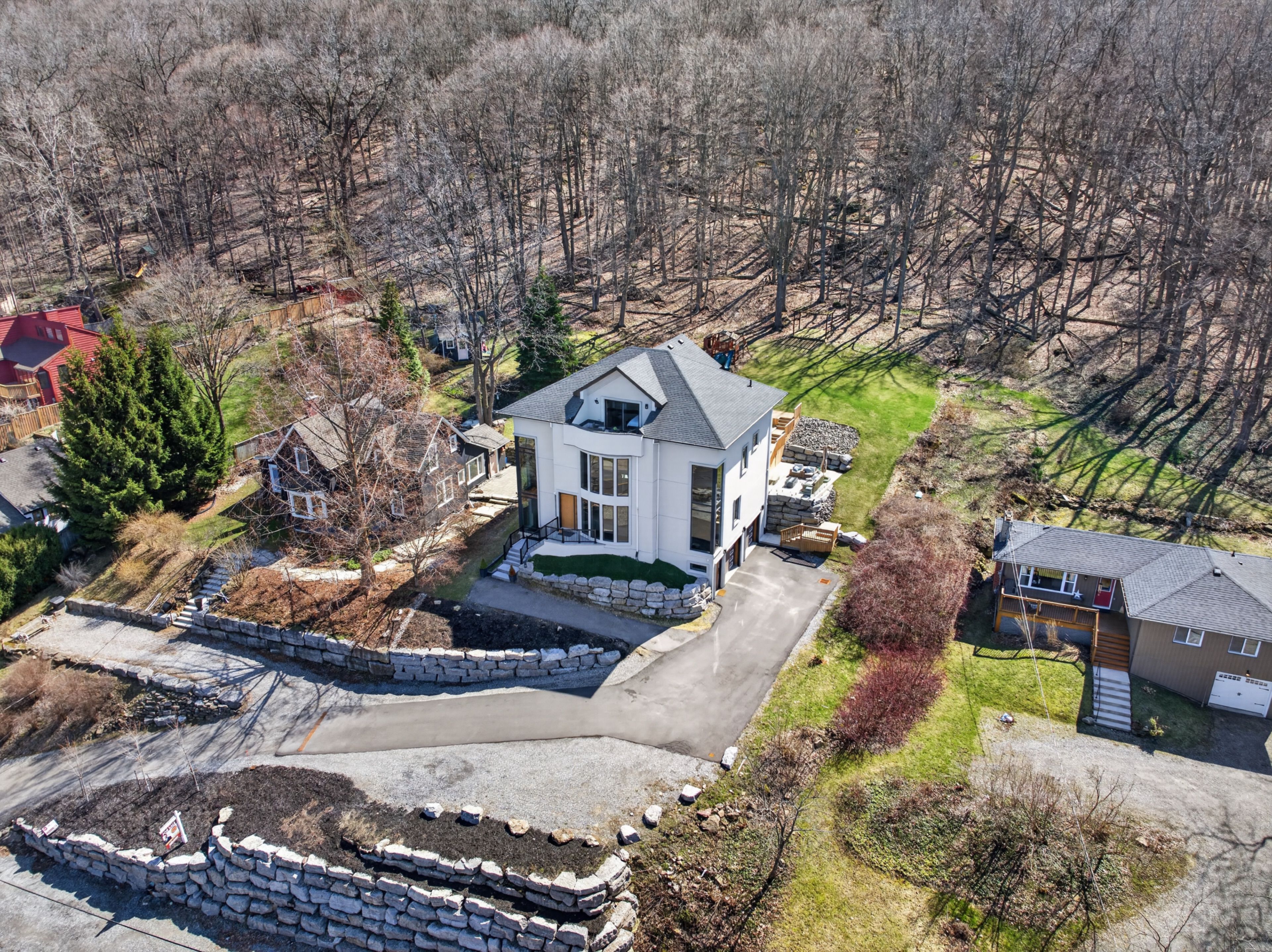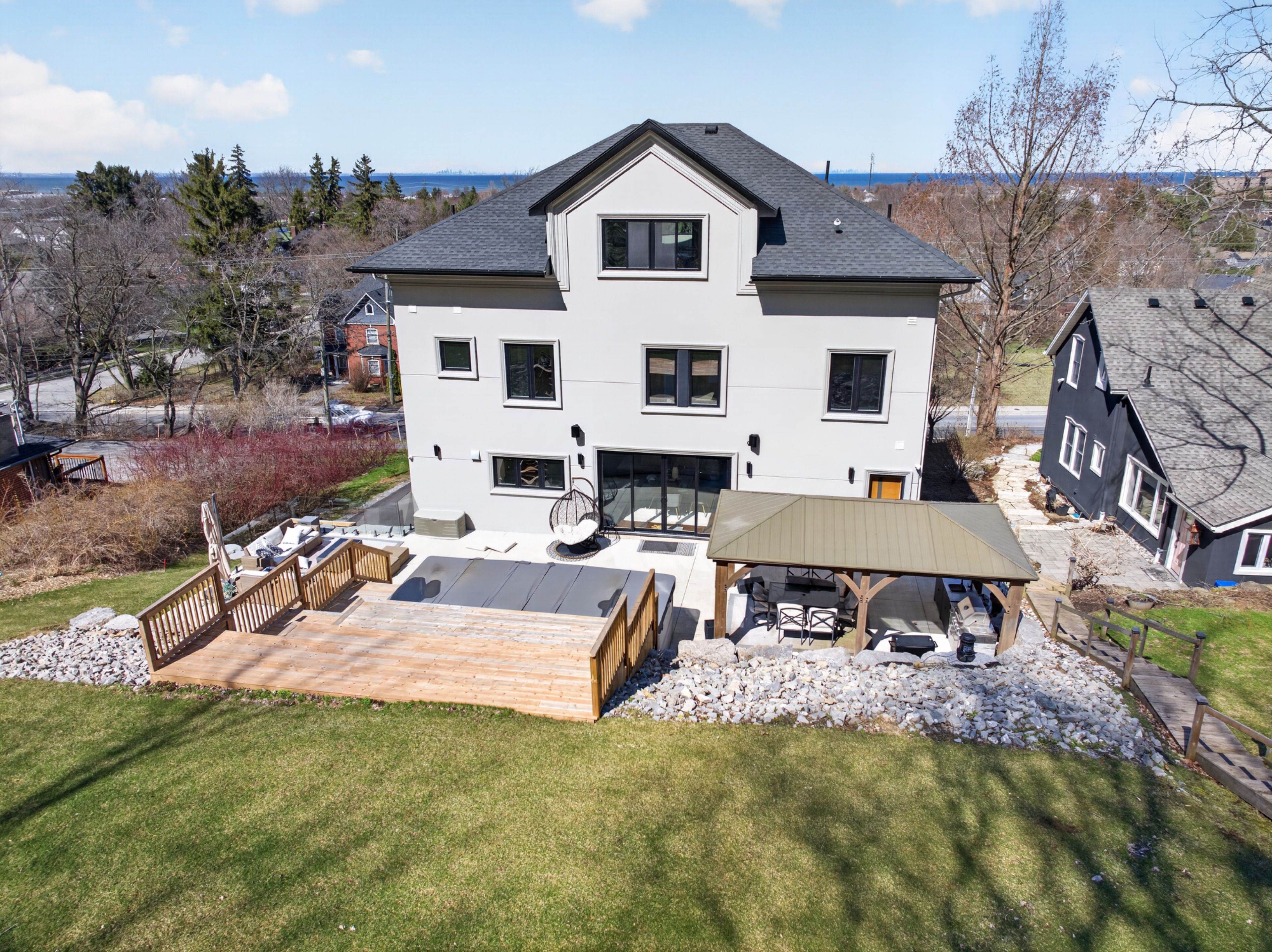Escarpment luxury masterpiece with unobstructed lake and toronto skyline views. Perchedhigh along the grimsby escarpment, this is more than a home, it is a rare lifestyle reserved for those whoexpect more. With sweeping, unobstructed views across lake ontario to the toronto skyline, every momenthere feels elevated, private, and exceptional. Inside, soaring ceilings and dramatic walls of glass flood the home with natural light, creating a seamless connection between refined living and the landscape beyond. The chef-inspired kitchen anchors the main level with an oversized island and walk-in pantry, designed for effortless entertaining and everyday comfort. A private in-home elevator connects all three levels, delivering convenience without compromise. The upper floors unfold into a true retreat, featuring a third-level sanctuary with a private balcony where morning coffee and sunset views become part of your dailyroutine. Step outside to a tiered backyard set against the escarpment, offering rare privacy and a peaceful natural backdrop. The swim spa creates the perfect setting for relaxing evenings and summer days spent athome. Located minutes from downtown grimsby, you will enjoy boutique shops, dining, parks, and top-rated schools, with quick highway access to hamilton, burlington, and the gta. This is where nature,luxury, and convenience come together. A rare opportunity to experience escarpment living at its highest level.