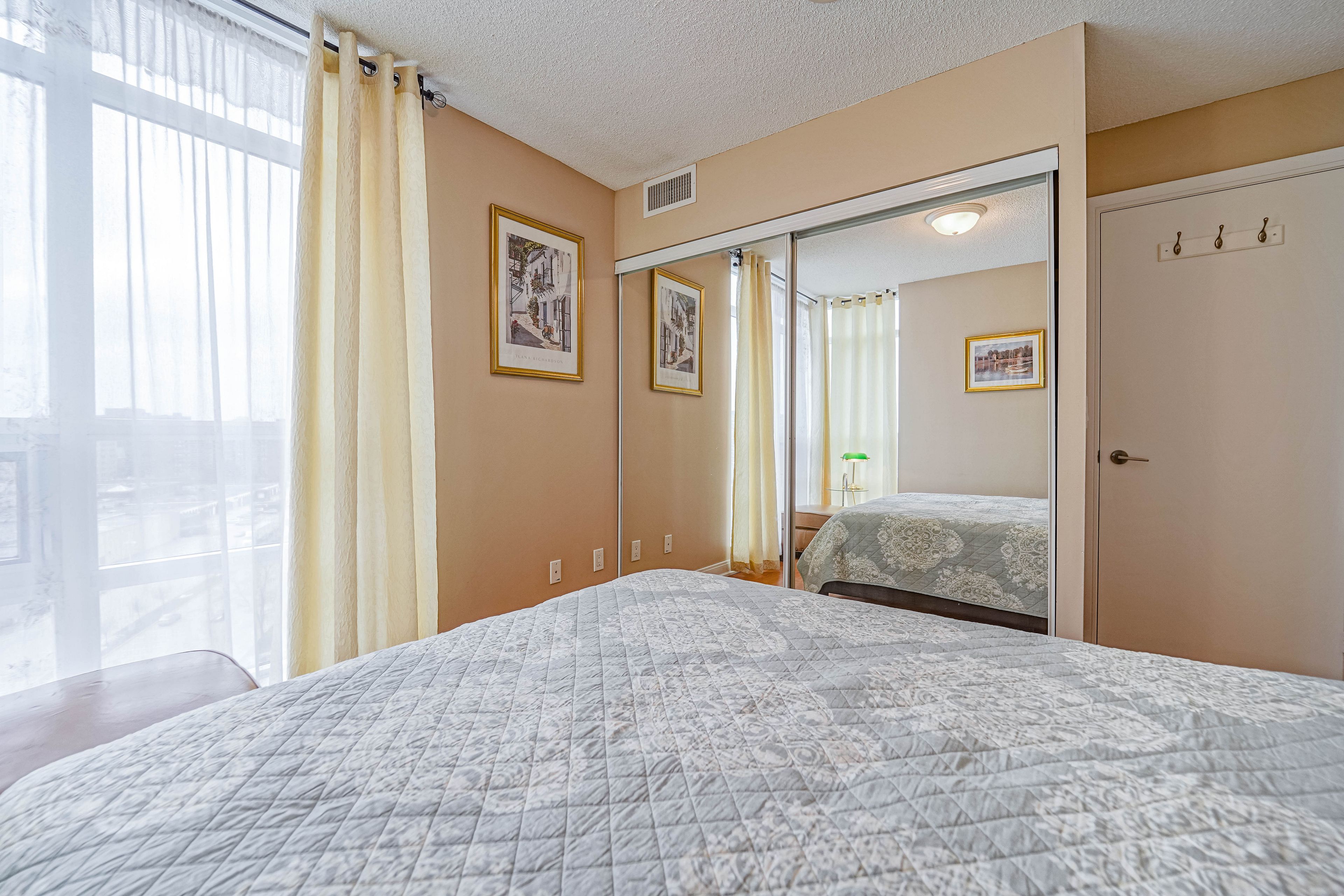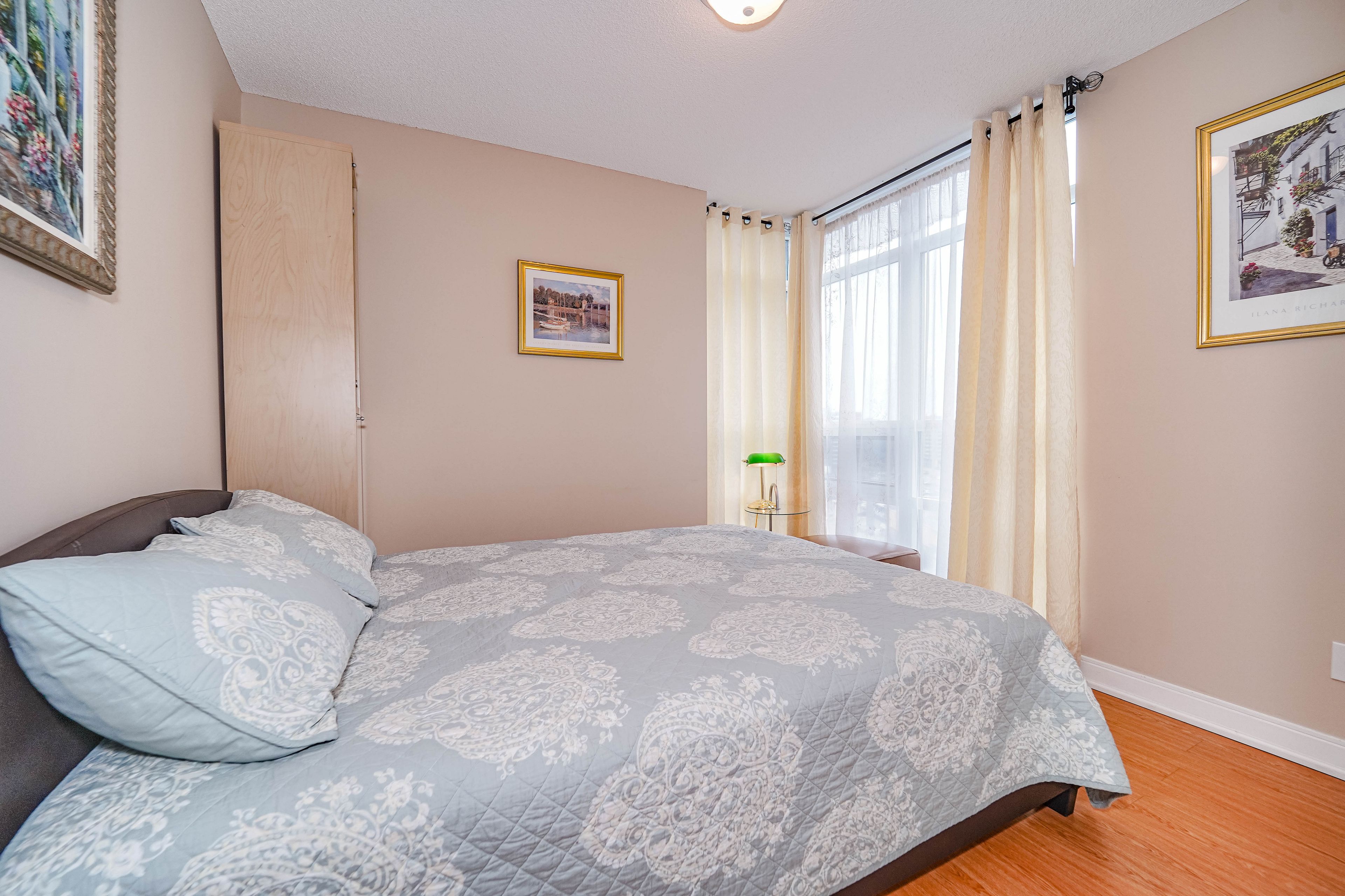 Tridel built, large, sun-filled corner unit 1,280 s. F. Laminate flooring, crown-molding, fully furnished-move in & enjoy. Parking & locker included. All utilities included except hydro in maintenance fee. Pets & smoking not allowed. Plenty of storage w/closet organizers. 24 hrs security. Indoor pool, gym & party room. Golf course in the back of the building. Public library. Public transport & quick access to major routs. Avoid buying furniture, moving expenses & settling! , move in & enjoy! Check video tour!
