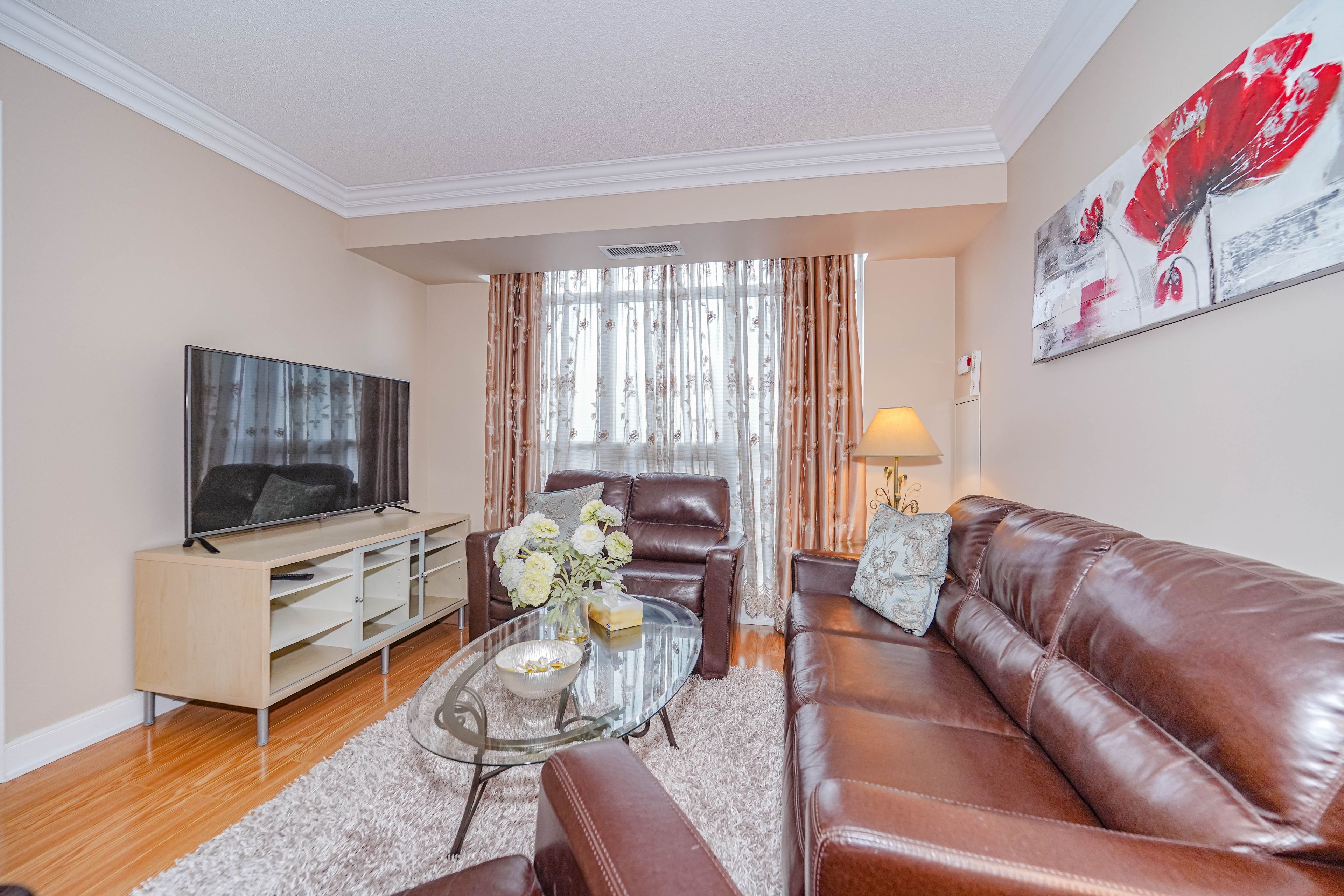 Foreign students welcome! Fully furnished - what you see is what you get - check the video-tour! Tridel built, large, sun-filled corner unit 1,280 s. F. Laminate flooring, crown-molding. Parking available for rent. All utilities included except hydro! Pets & smoking not allowed. Plenty of storage w/closet organizers. 24 hrs security. Indoor pool, gym & party room. Golf course in the back of the building. Public library. Public transport & quick access to major routs. Qualified tenants only. Avoid buying furniture, moving expenses & settling! , move in & enjoy!