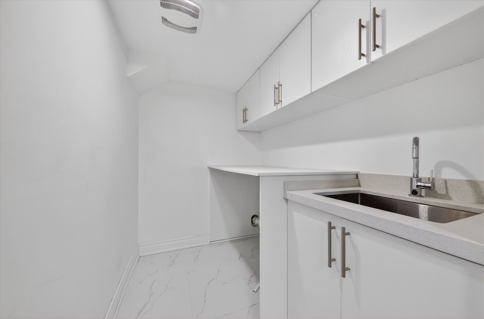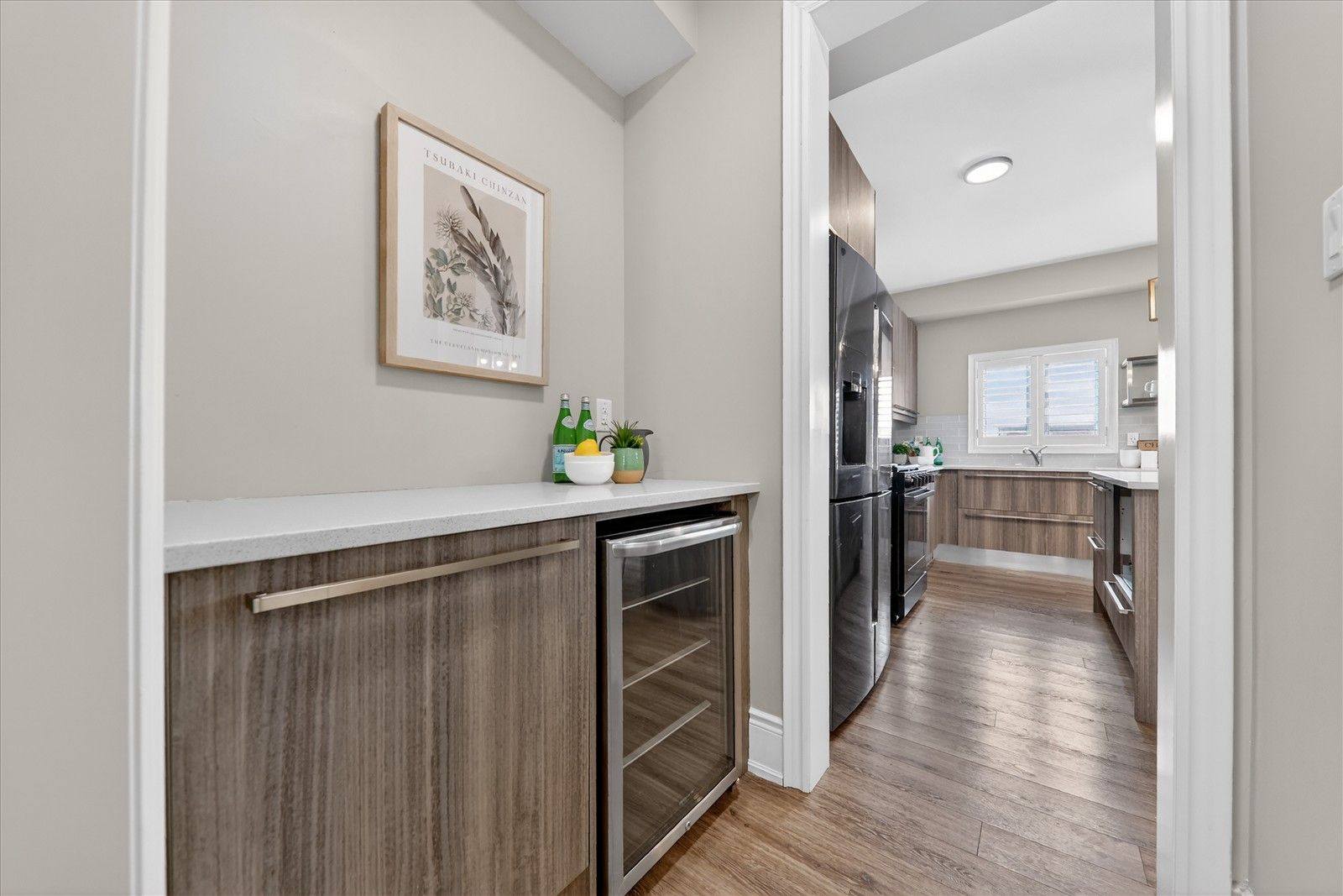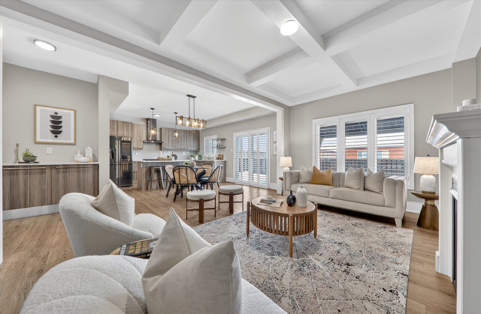 • Contemporary open-concept kitchen with smart appliances and walk-through pantry.
