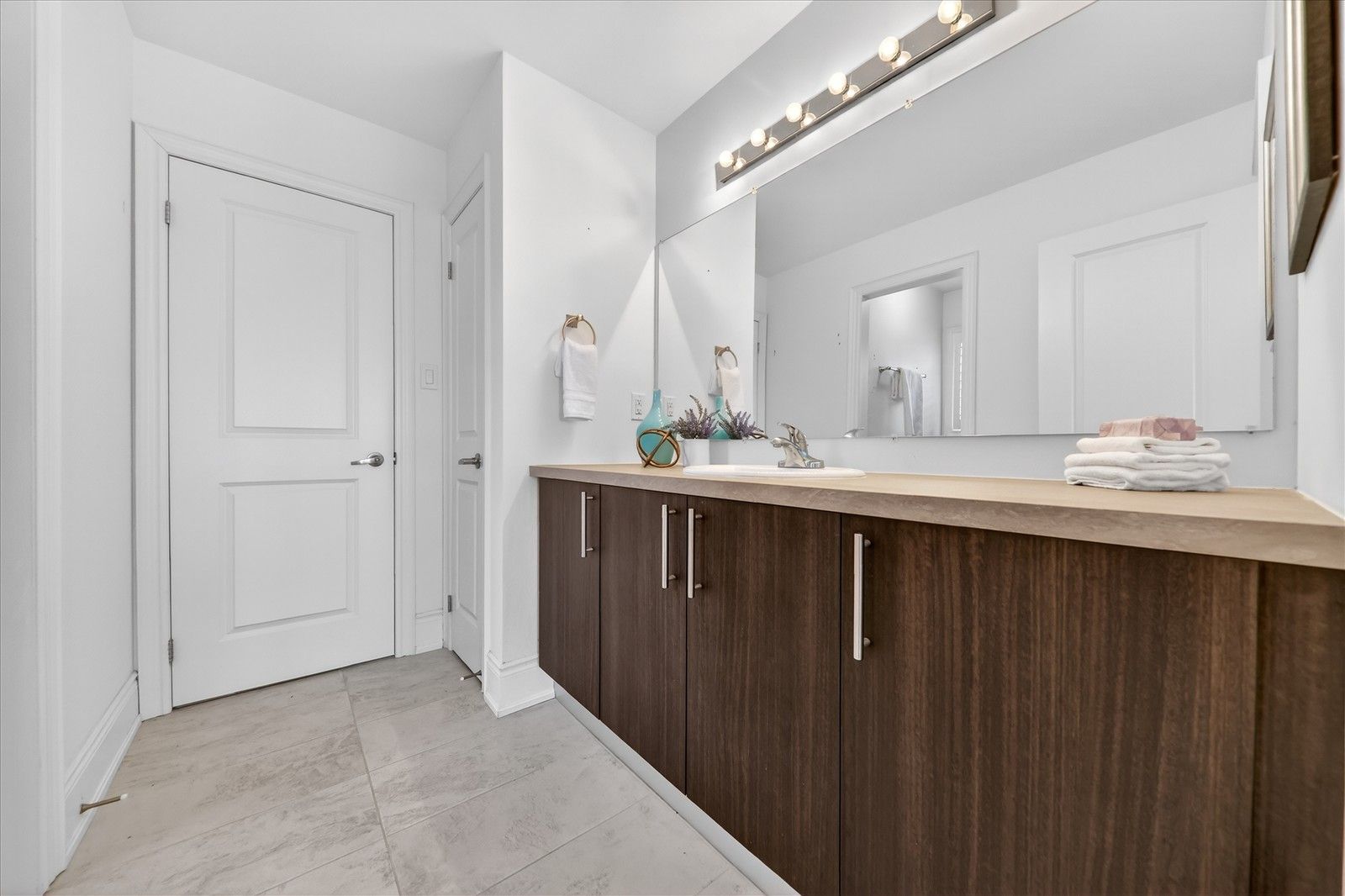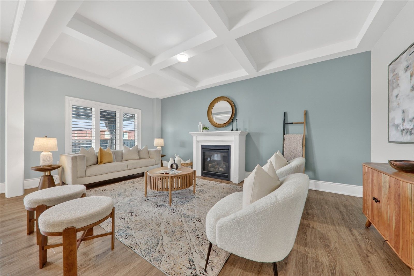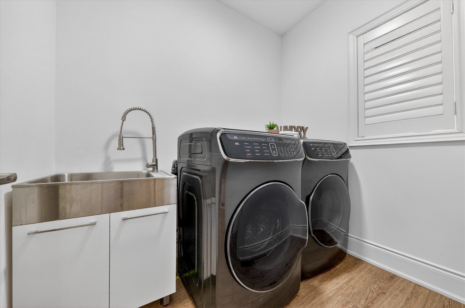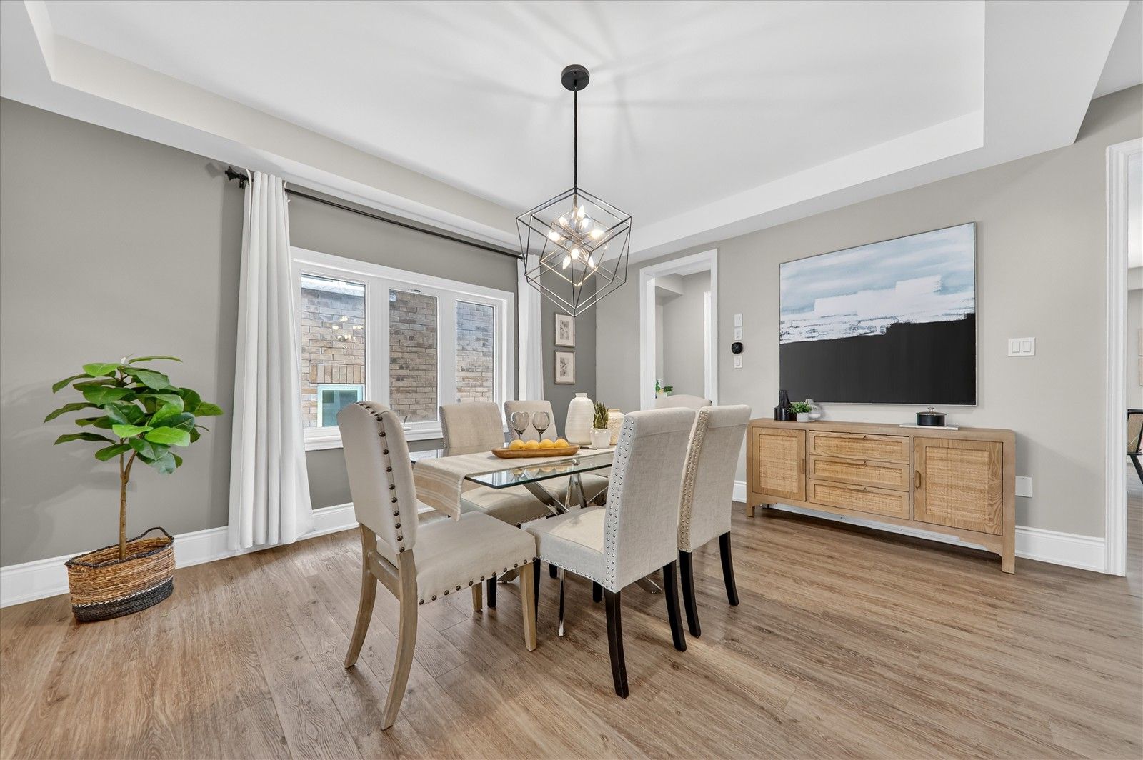 • Contemporary open-concept kitchen with smart appliances and walk-through pantry.