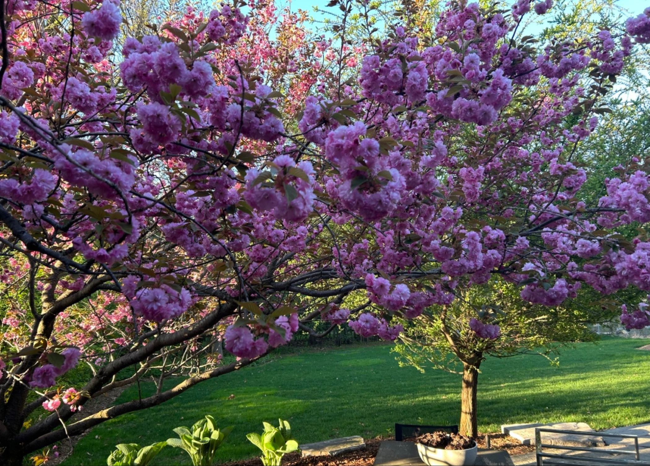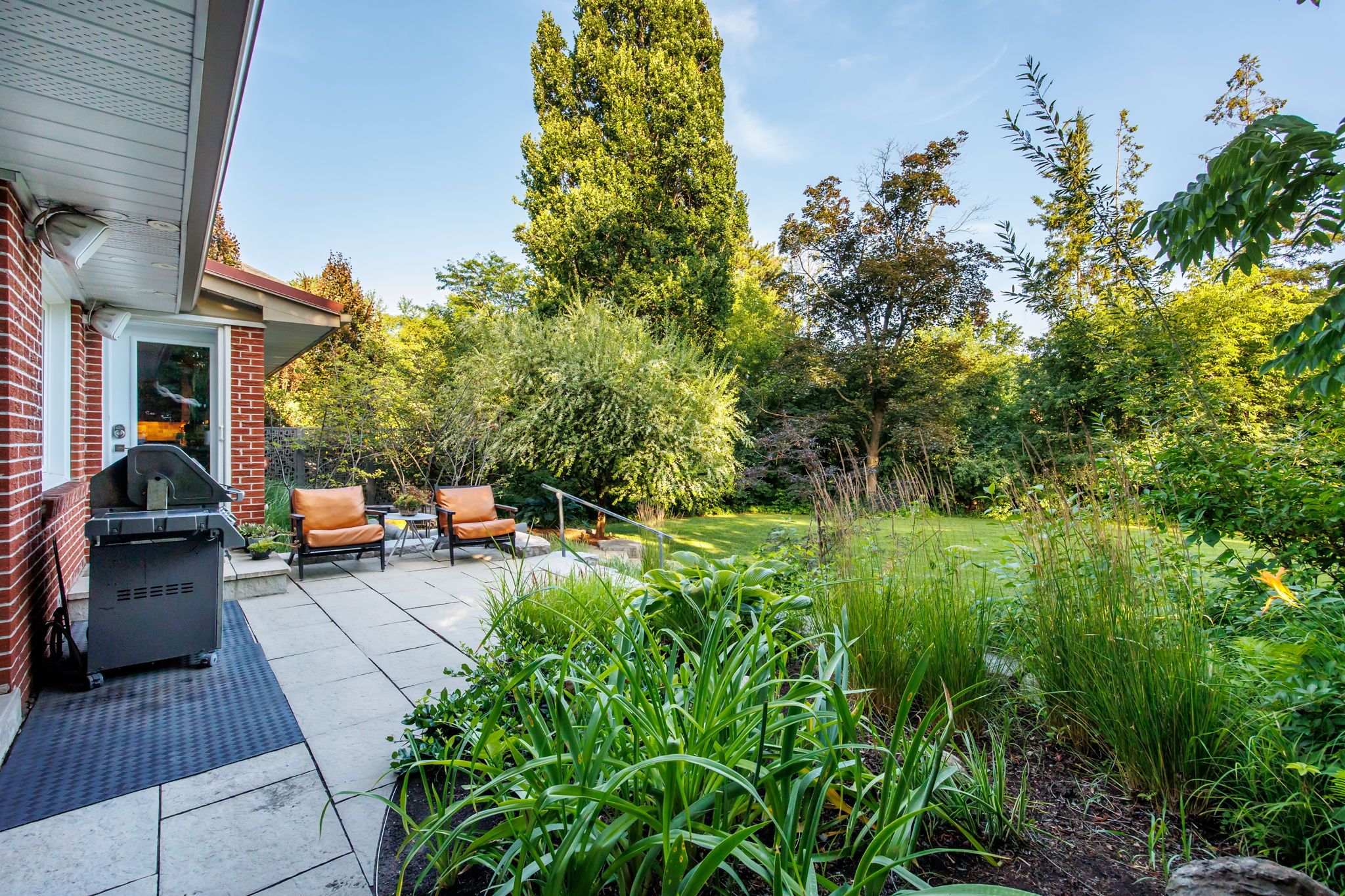 • Expansive south-facing backyard surrounded by mature trees for added privacy.