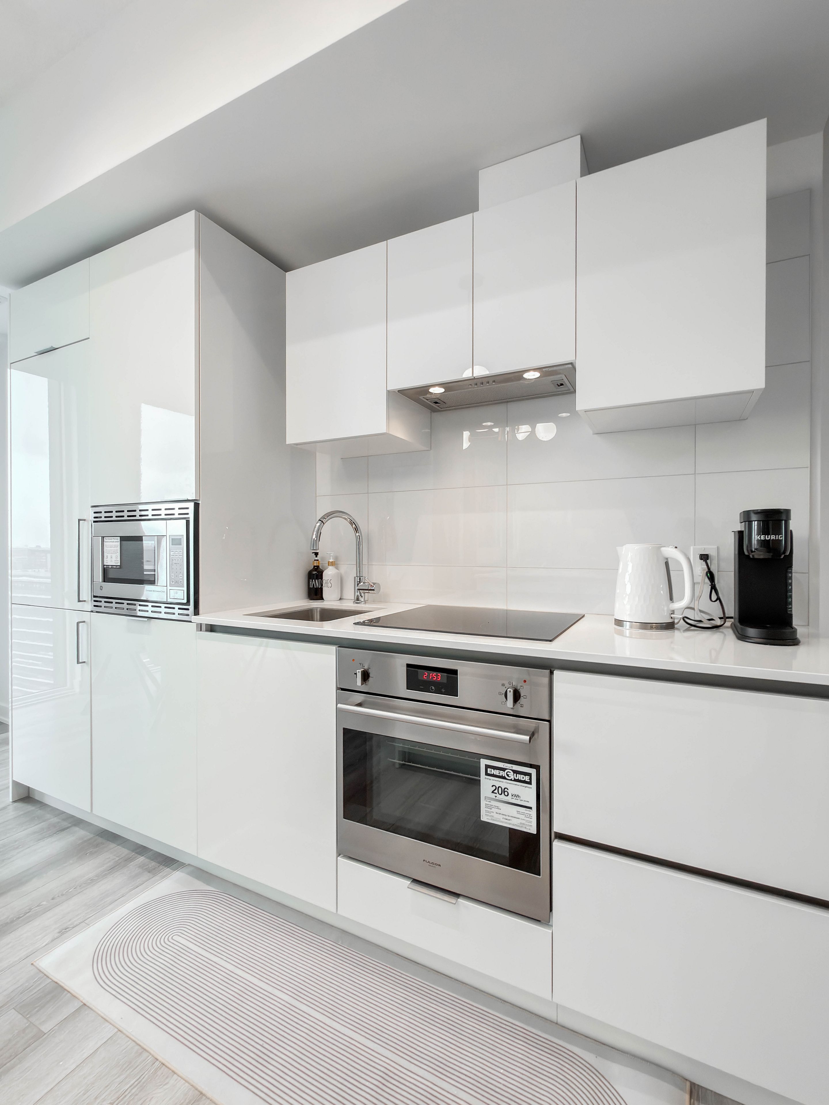 • Modern kitchen with built-in appliances and stylish backsplash.