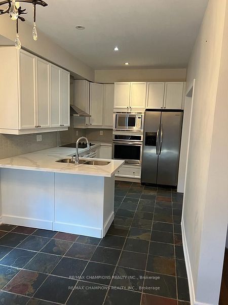 • Bright kitchen with quartz countertops and stainless steel appliances.