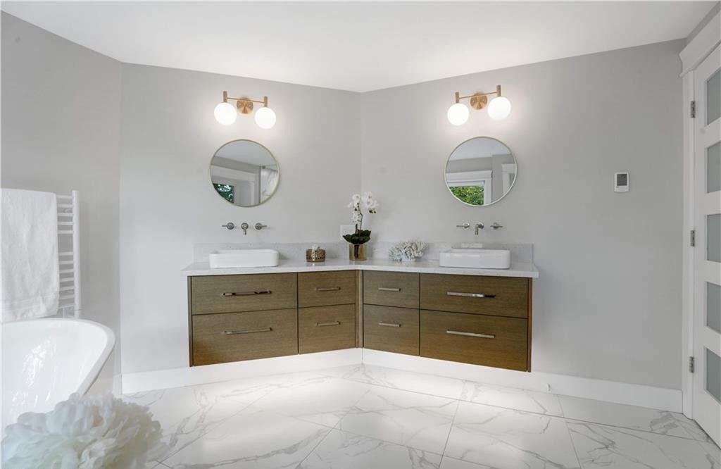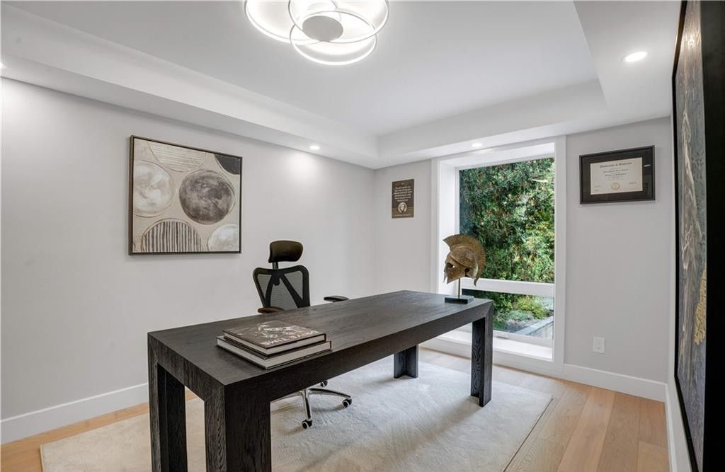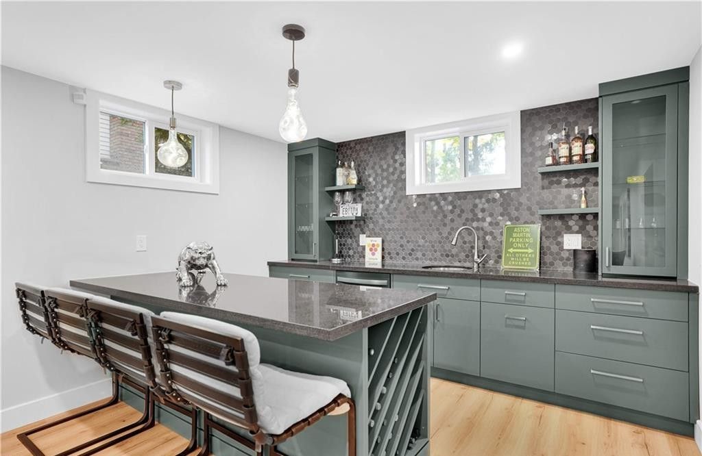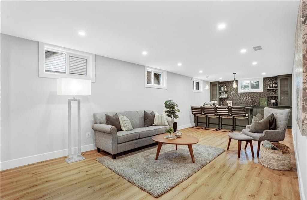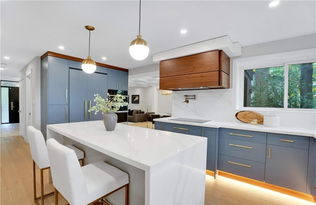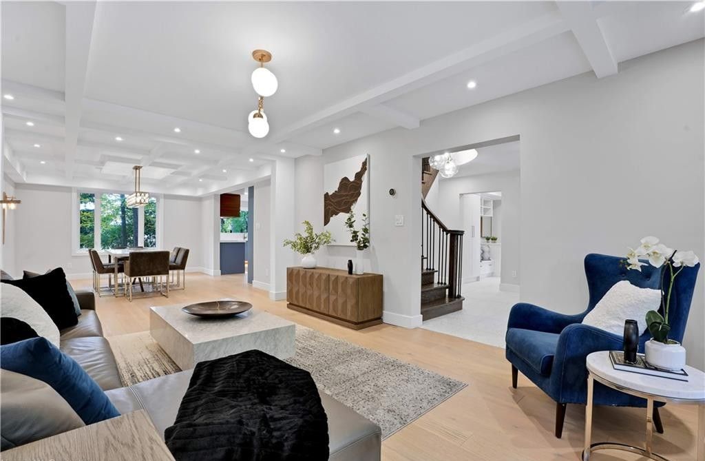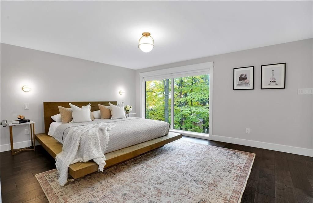 Welcome to a truly exceptional home on a quiet street in one of the area's most sought-after neighbourhoods. Extensively renovated, this residence offers a refined mix of modern design, quality finishes, and functional living space. From the striking exterior and landscaped approach to the dramatic curved staircase inside, every detail has been carefully considered. The main level is designed for both daily living and entertaining, featuring oversized windows, designer lighting, a formal living room, and a separate dining room. The chef's kitchen is a standout, with custom cabinetry, jennair appliances, a pot filler, waterfall island with seating, and integrated storage. The family room includes a floor-to-ceiling fireplace, while a dedicated home office, laundry room, and powder room complete the level. Upstairs, you'll find four spacious bedrooms with hardwood flooring, floor-to-ceiling windows, and large closets. The primary suite offers a custom walk-in closet and a spa-inspired ensuite with heated floors, glass shower, and freestanding soaker tub. A second ensuite and cheater bath add comfort and convenience for family and guests. The finished lower level adds excellent flexibility with a large rec room, bar, fifth bedroom, full bathroom, and separate entrance, making it ideal for guests, teens, or extended family. Outside, mature trees and well-planned outdoor living areas create a peaceful space to relax or entertain. This is a rare opportunity to own a turnkey luxury home in an established neighbourhood.