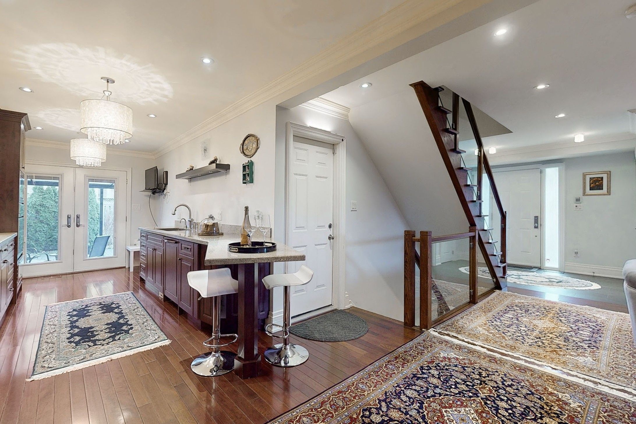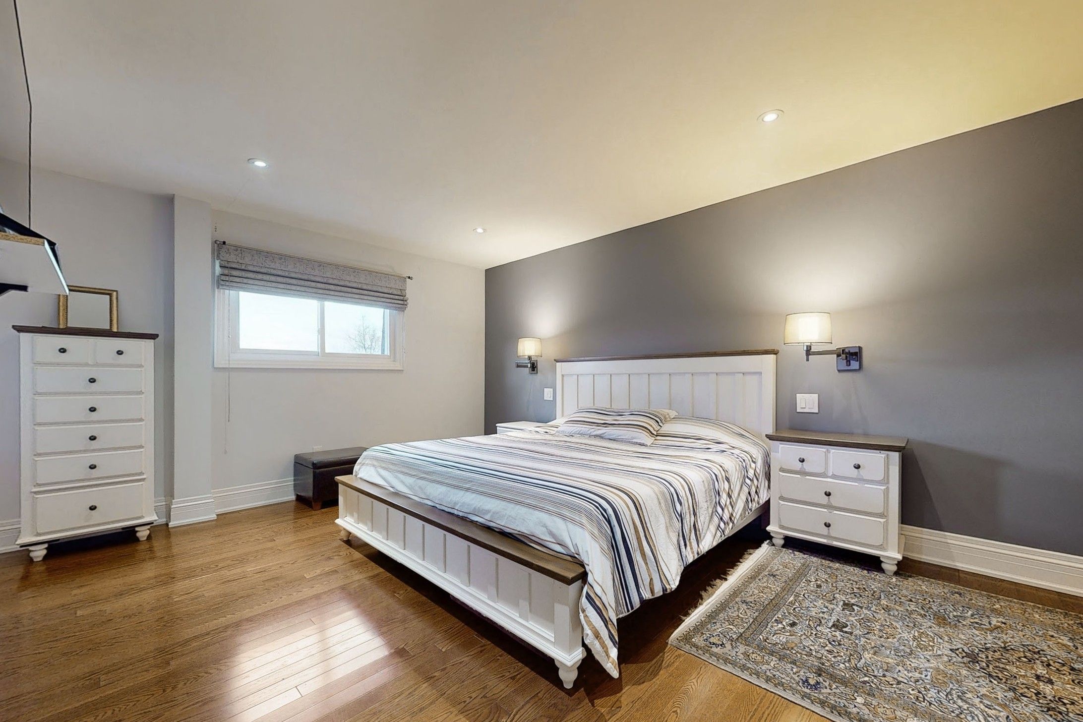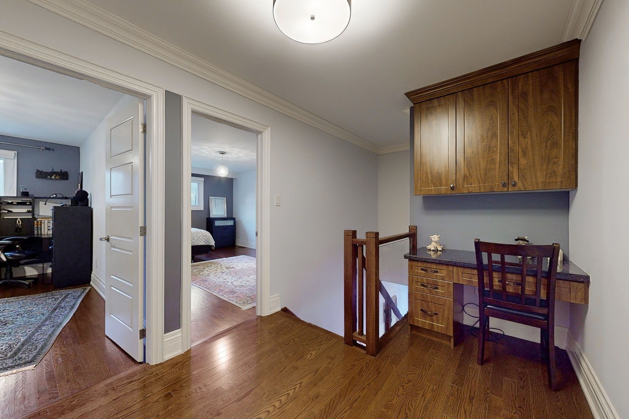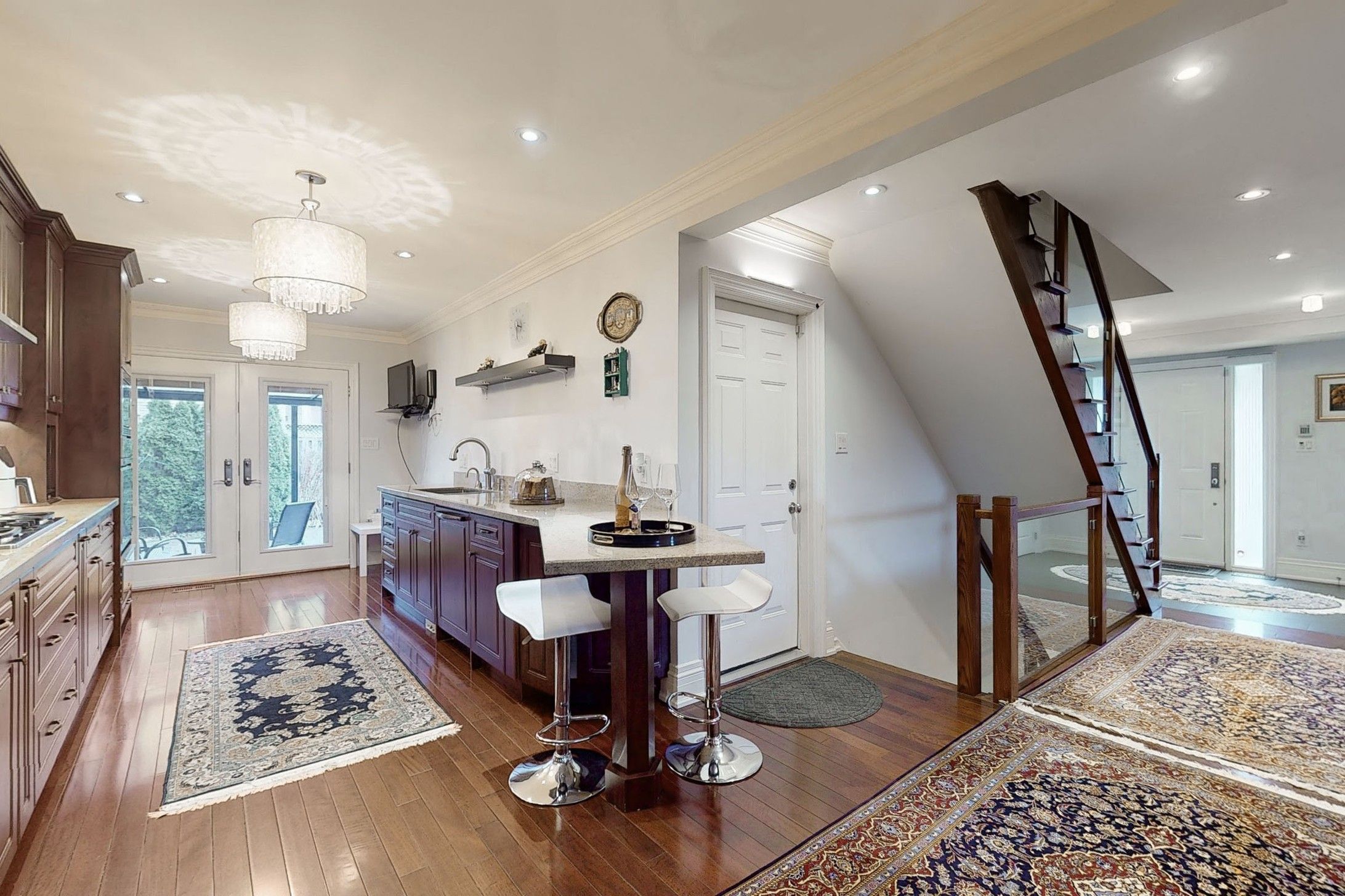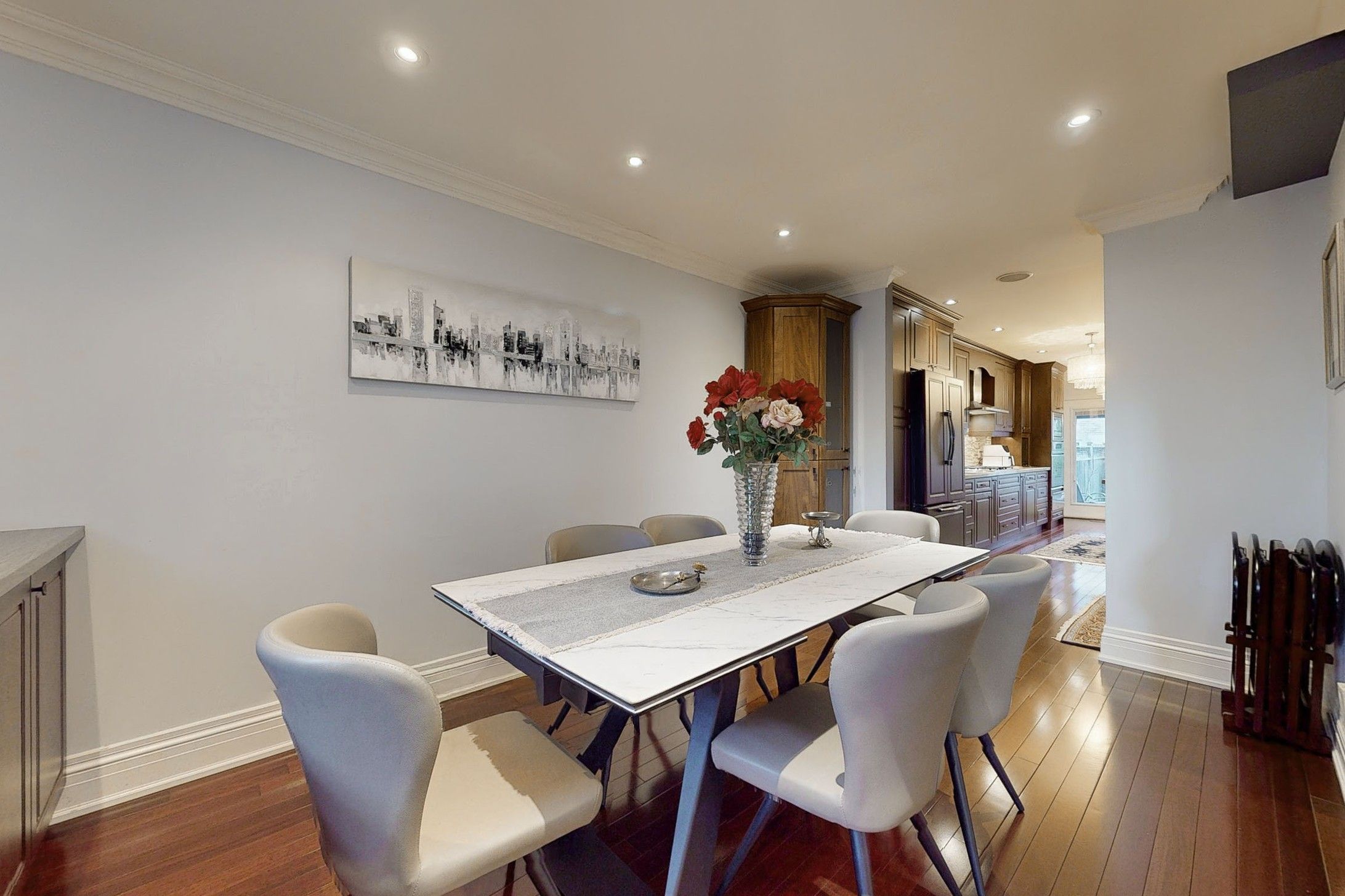 A great location! Child safe cul-de-sac. Over look beautiful lawn, enclosed fenced privatebackyard. Brazilian hardwood floors through-out. Very bright in 2nd floor, . Largest uniquemodel . Built in fridge (kitchen aid), gas stove, built in dishwasher, built in oven andwarmer , built in microwave, all electrical fixtures and window covering. 2nd floor primarybedroom with large custom dressing room large en-suite heated floor bath & laundry room, 2ndlarge primary bedroom with walking closet & en-suite bath. Fin bsmt with a half kitchencabinet installed and build in sink . Great school area for yonge ones , close to bus stopand transit . It's a must see!