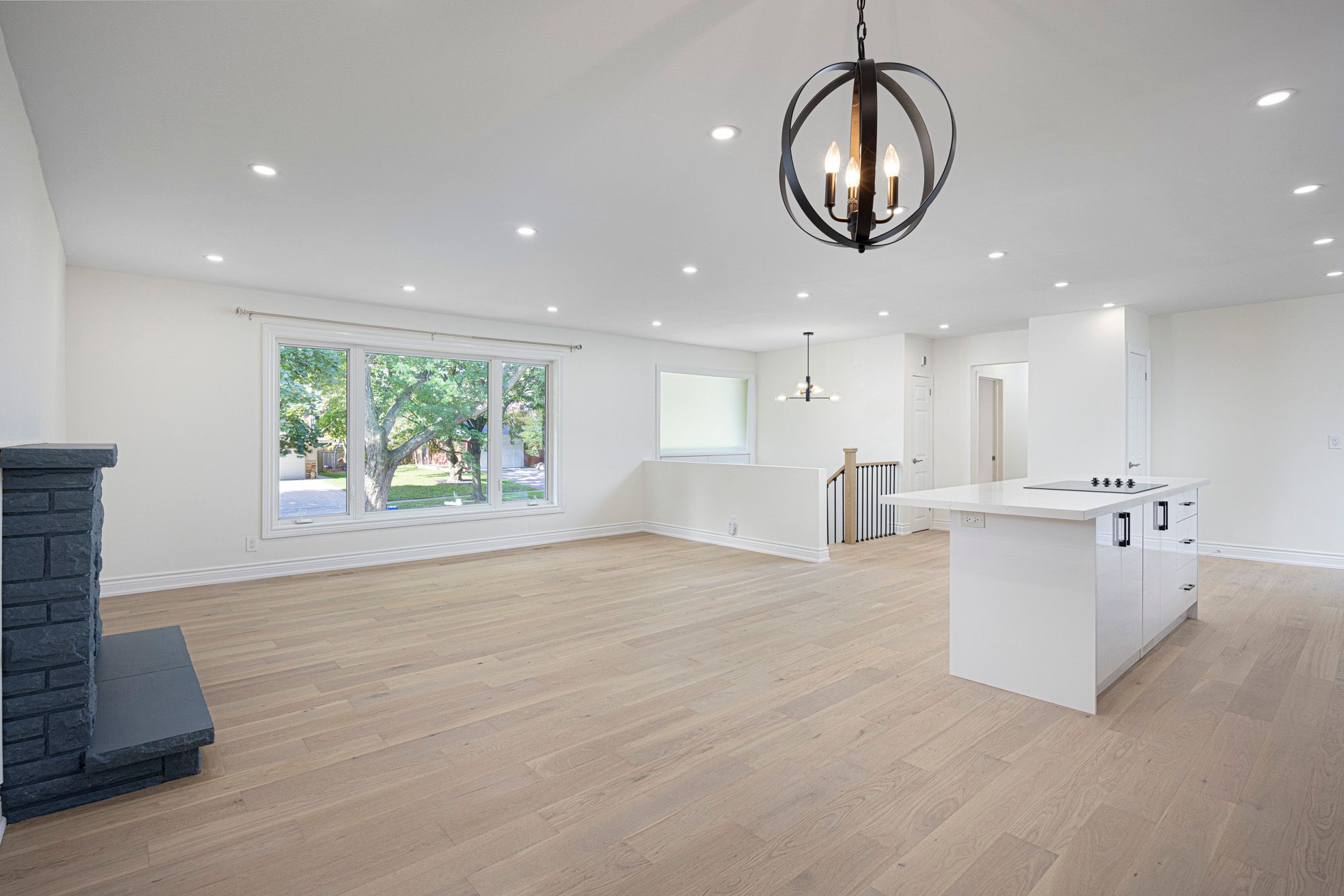 • Open-concept living space with engineered hardwood flooring and modern kitchen.