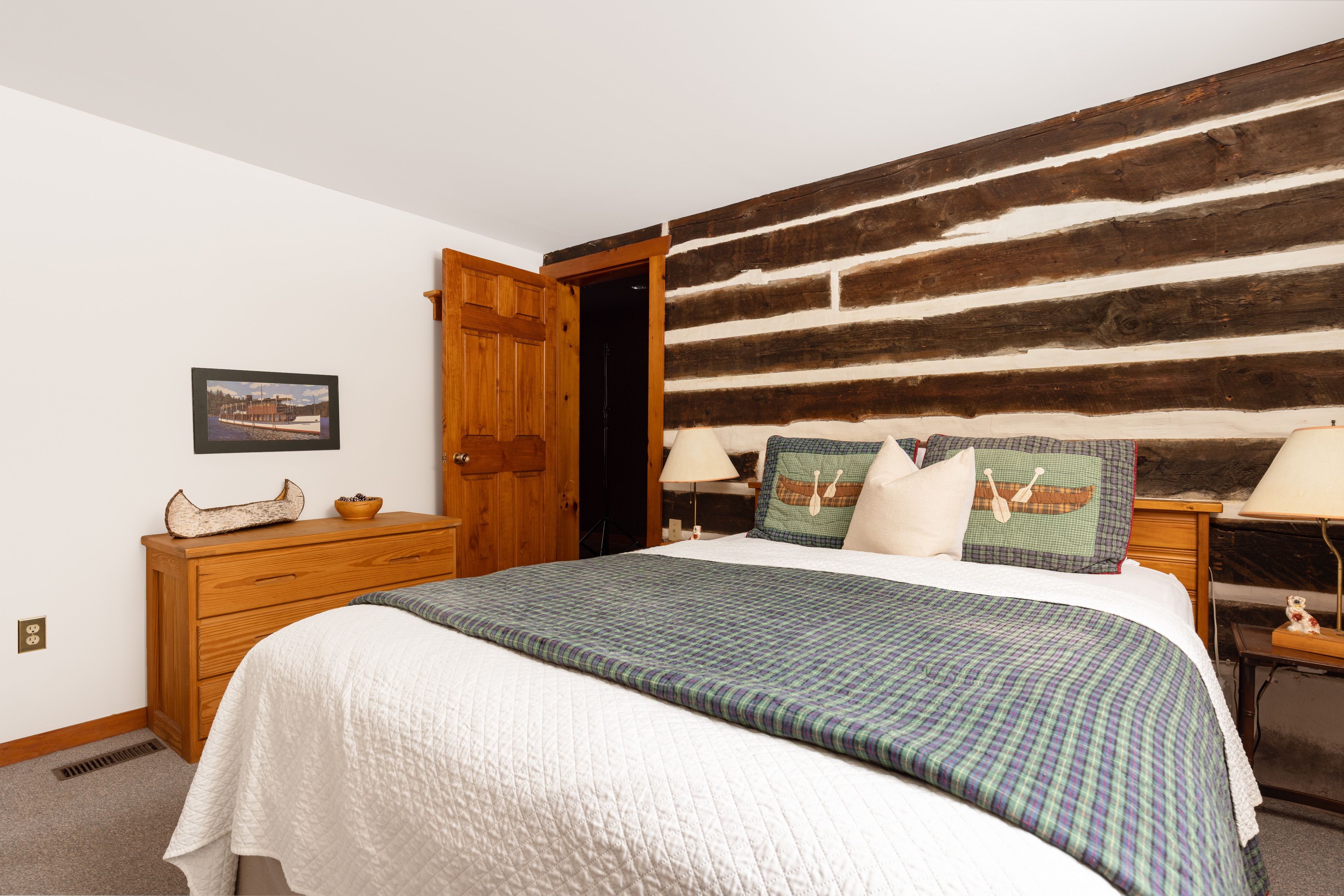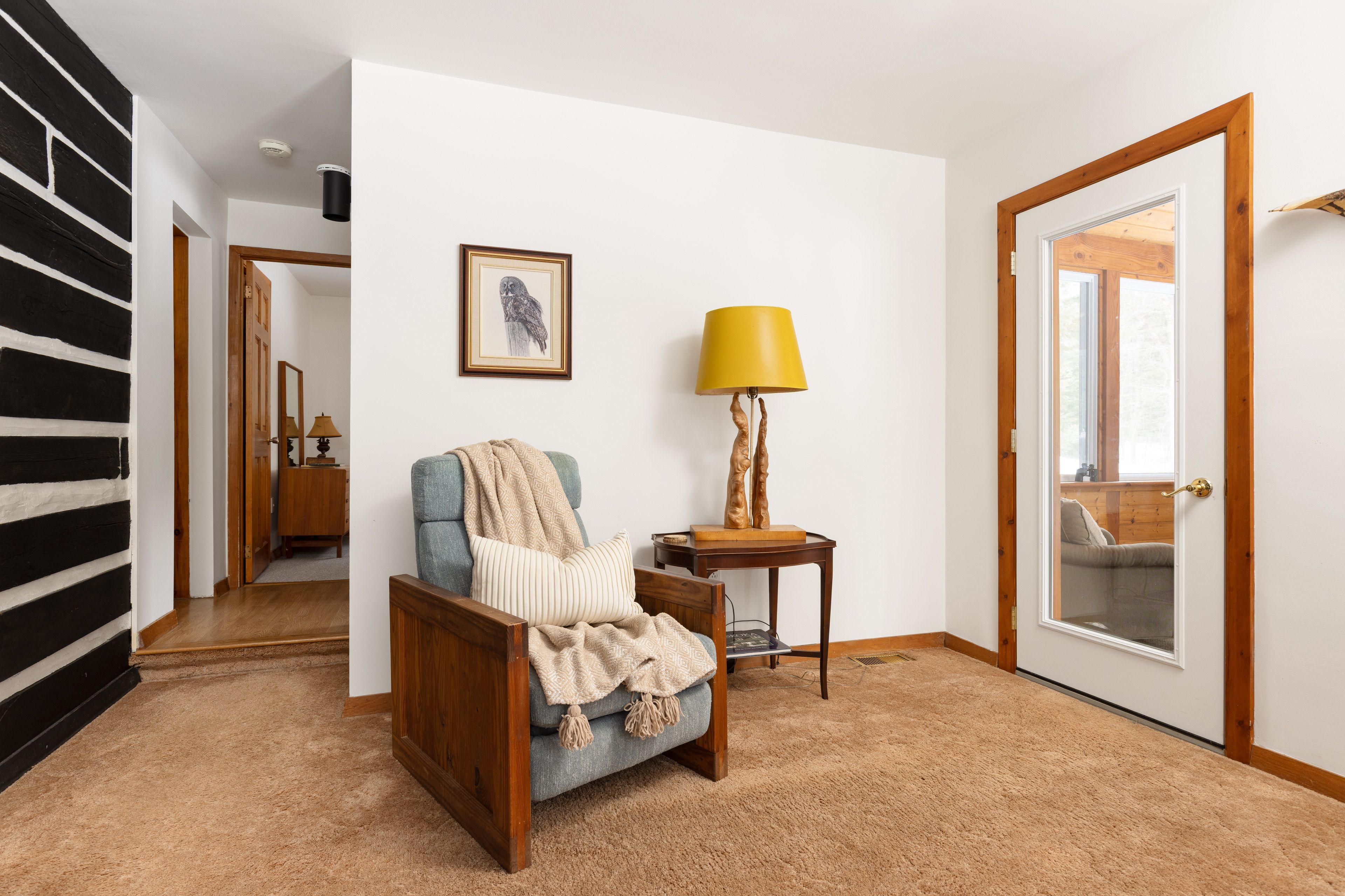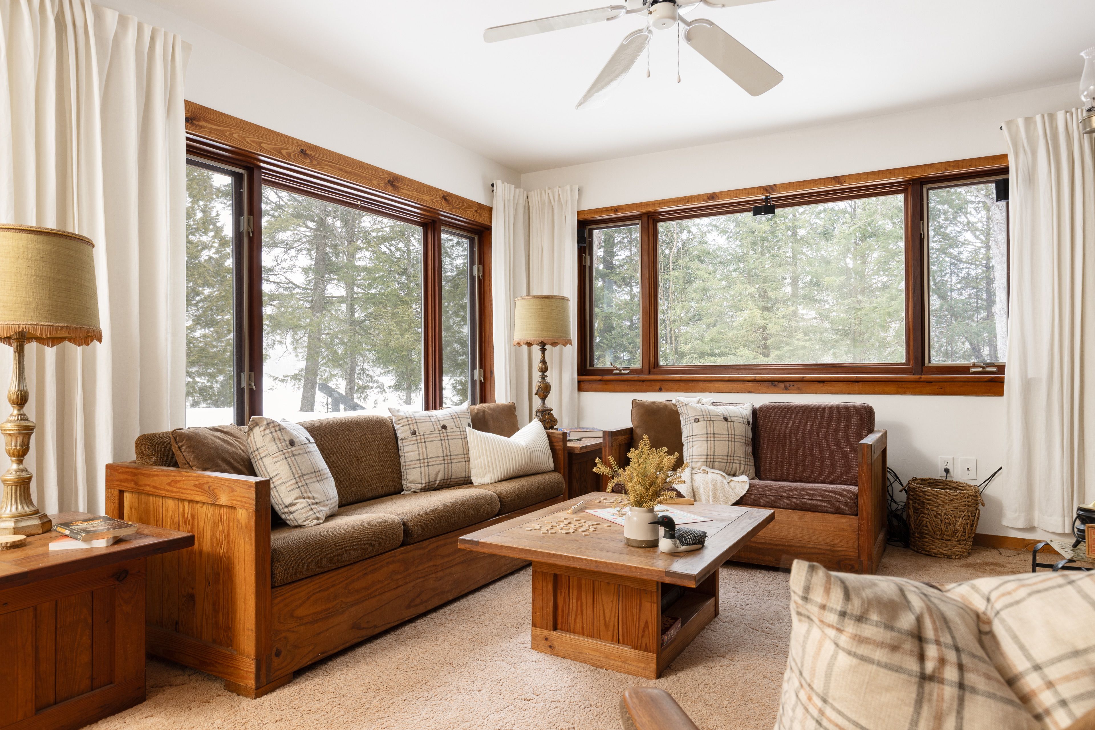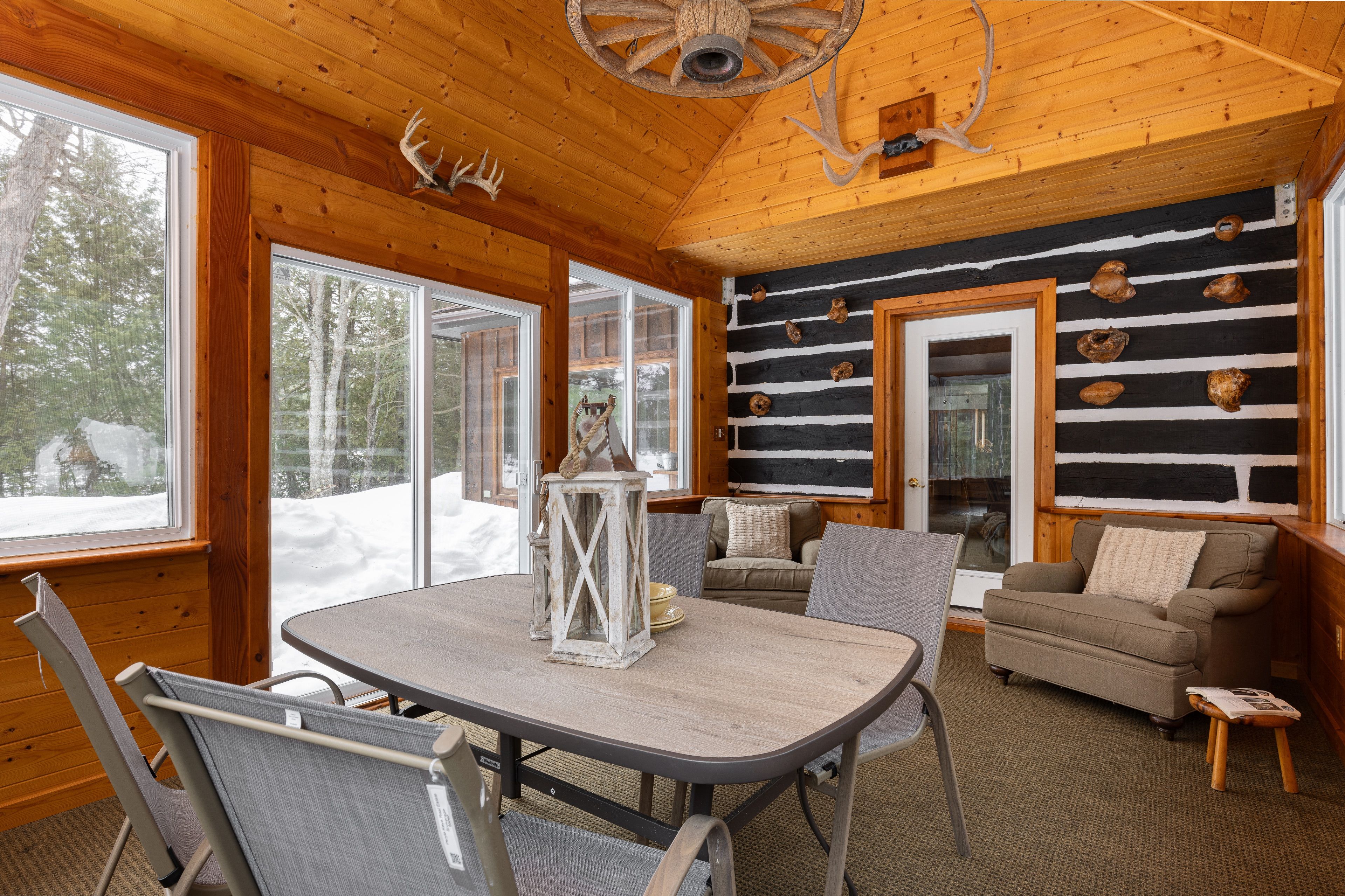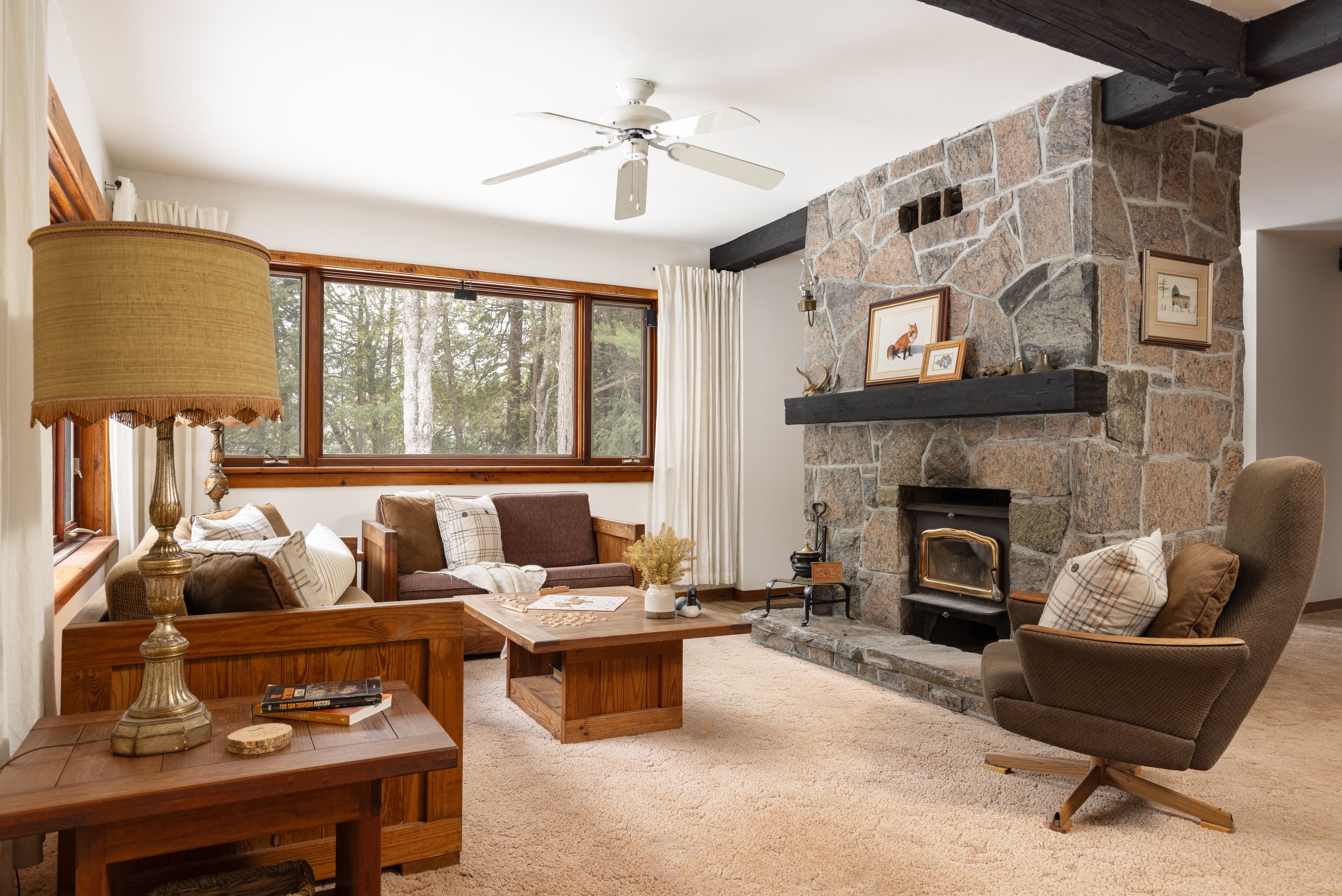 • Cozy living space with a stone fireplace and large windows.