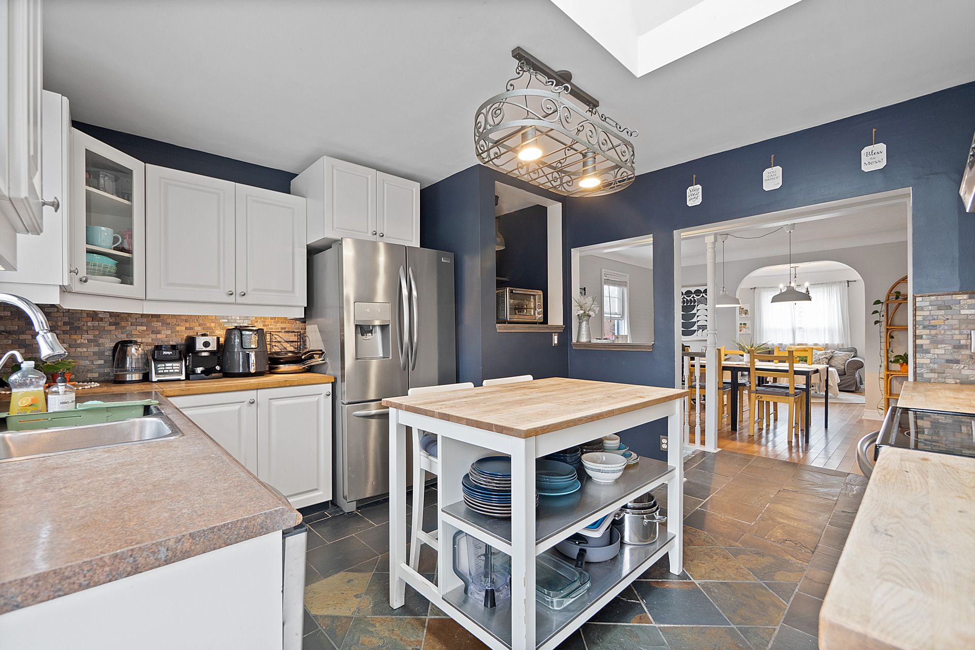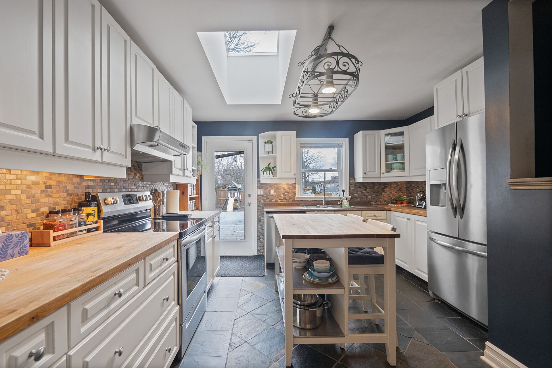 • Modern kitchen with stainless steel appliances and skylight.