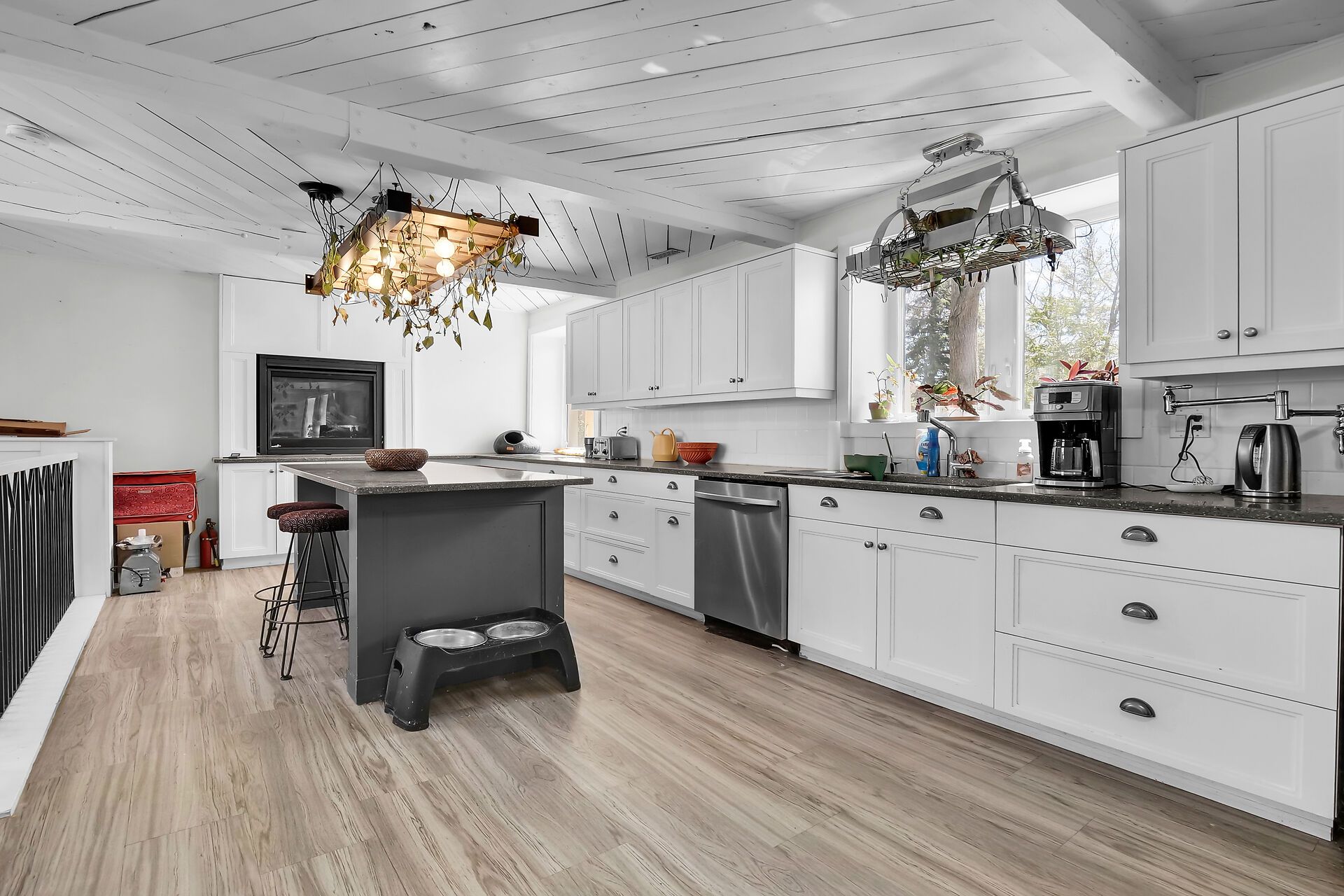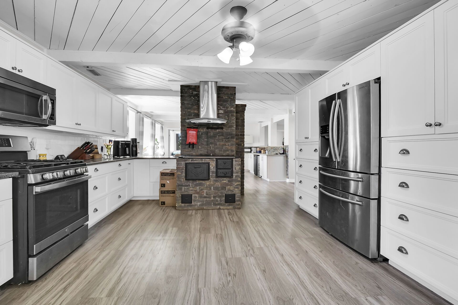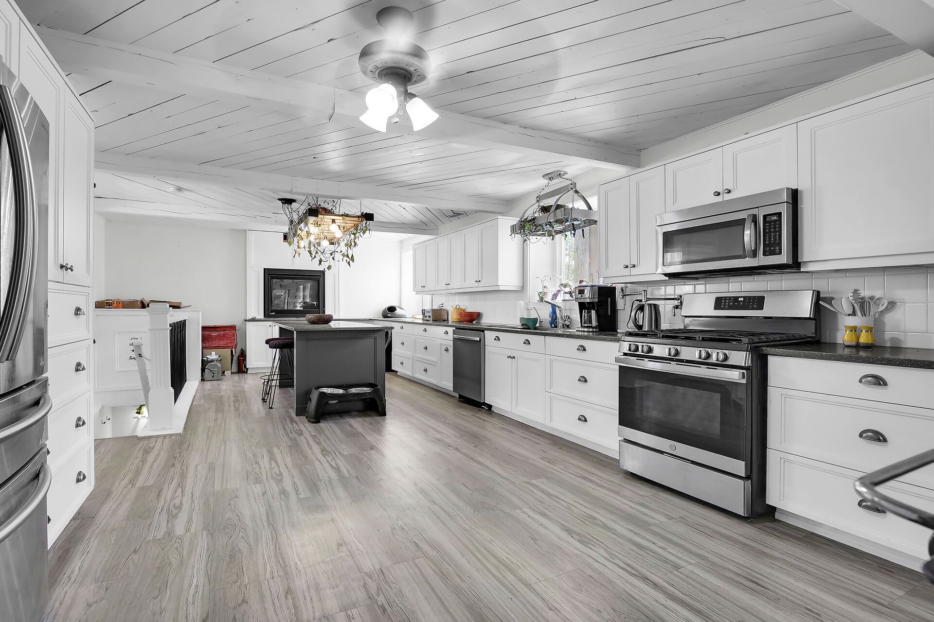 • Custom kitchen with oversized island and quartz countertops for easy meal prep.