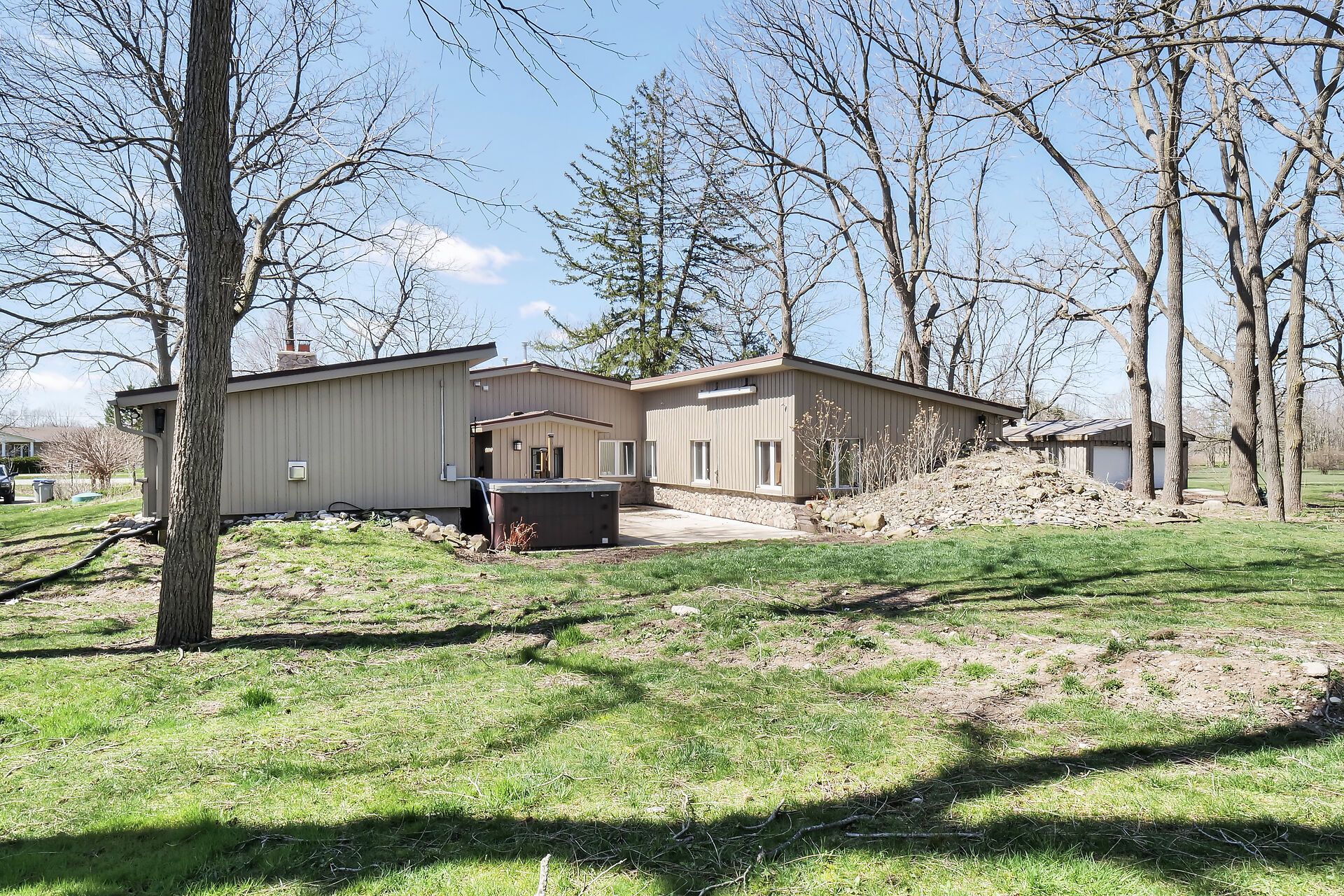 Beautiful 5. 8 acres corner lot with a 3. 071 sqft bungalow. 883 feet of frontage and 285 feet deep lot with 20x40 workshop. If your looking for a large private property outside the city then look no further then this perfect family lot, volleyball court, wave hot tube (swim spa), custom fire pit and outdoor shower. Custom kitchen, over sized island, quartz counter tops, lots of storage, multiple fireplaces, large custom primary bathroom with jetted bathtub, central vacuum, geothermal ground heating source and air conditioning. Just 15 minutes from london to this quiet large paradise.