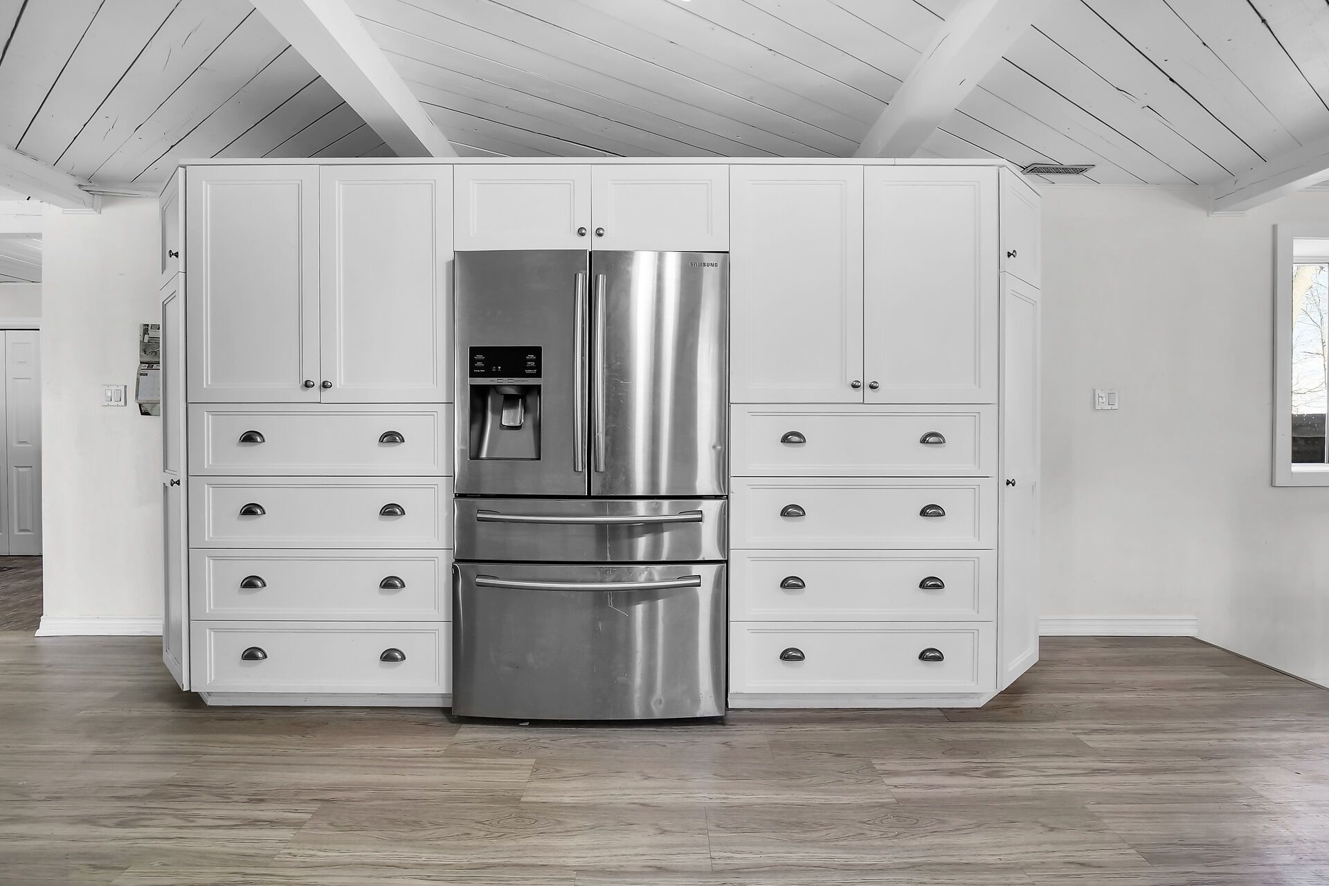 • Custom kitchen featuring quartz countertops and oversized island for cooking.