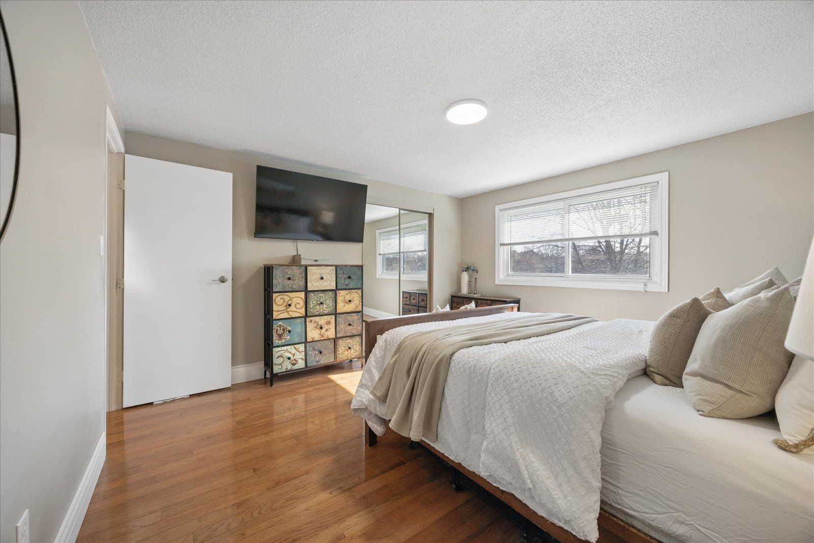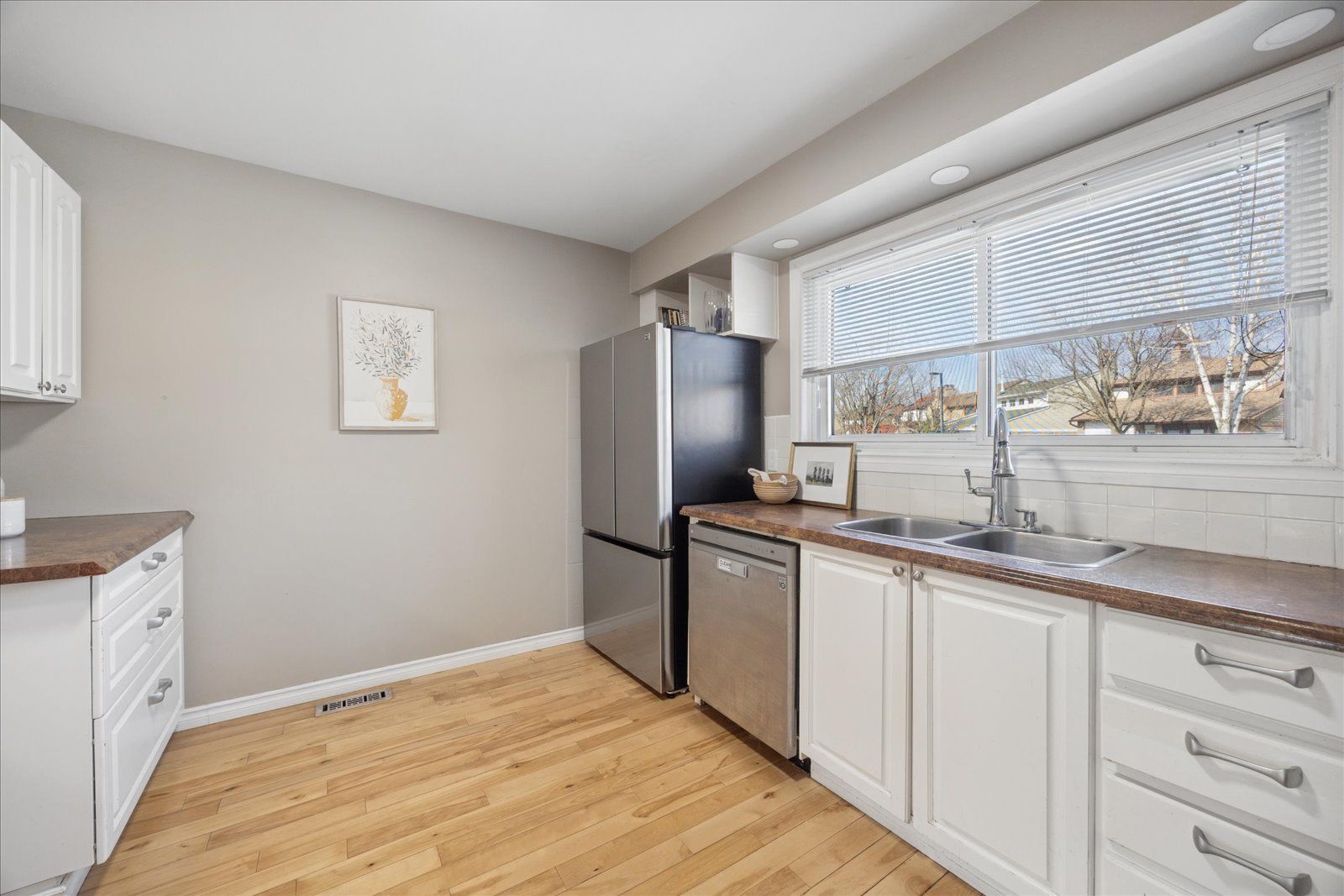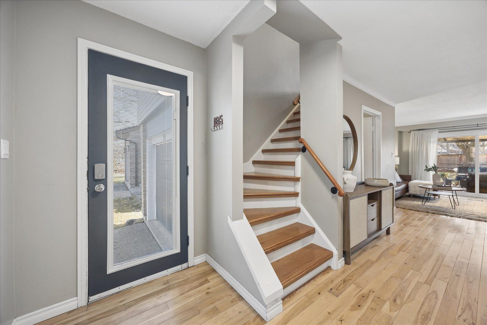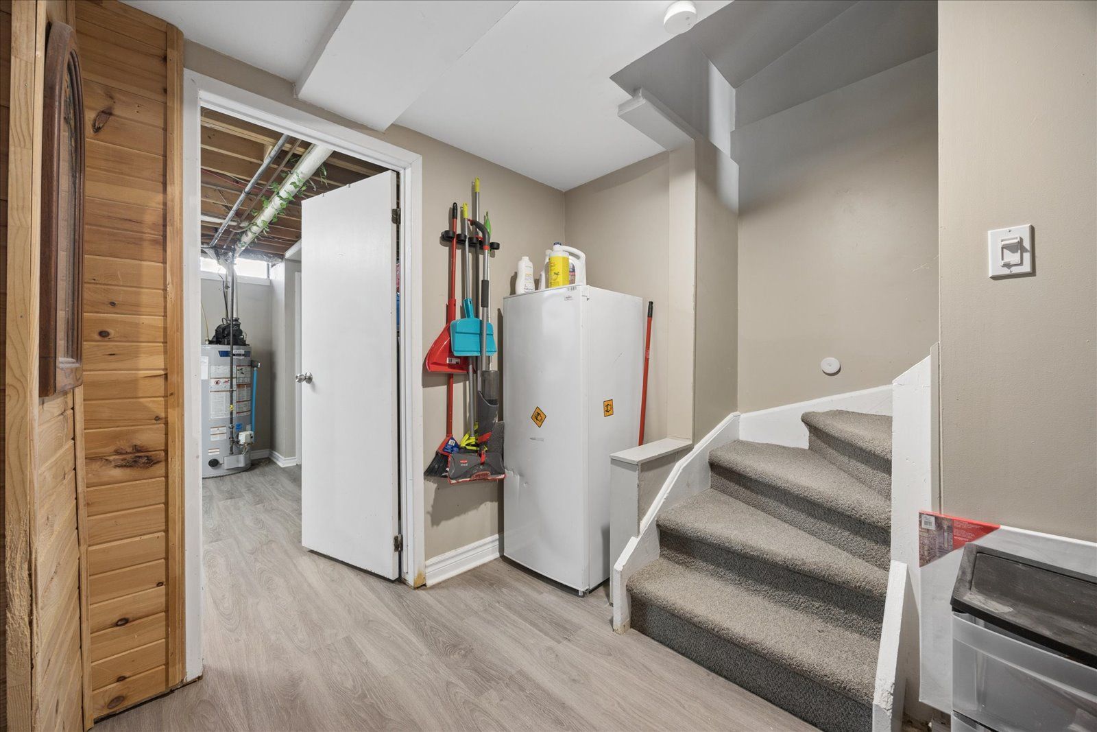 Welcome to this charming detached two-storey, three bedroom home, perfectly suited for families and first-time buyers. Located just a 5 minute walk from the lakefront and 7km of beautiful waterfront trails, you'll love having nature, parks, and outdoor adventures right at your doorstep. Inside, you'll find a comfortable and inviting layout with an open-concept main floor and hardwood floors throughout: easy to maintain and perfect for everyday living. The bright kitchen features new stainless steel appliances, making meal prep simple and enjoyable. Step outside to your private backyard through the extra large sliding door (2022) to the deck and large sun shelter, ideal for summer bbqs, kids' playtime, or relaxing evenings with friends and family. The finished basement offers a cozy rec room, giving you extra space for movie nights, a playroom, or a home office. With a single-car garage and a 3-car driveway, there's plenty of room for parking. Recent updates including: new kitchen appliances; shingles (2019); furnace (2020); central air (2020); and owned hot water tank (2019) make for a move-in-ready home with peace of mind for years to come. A wonderful opportunity to get into a family-friendly neighbourhood close to the lake-this is a place you'll be eager to call home.