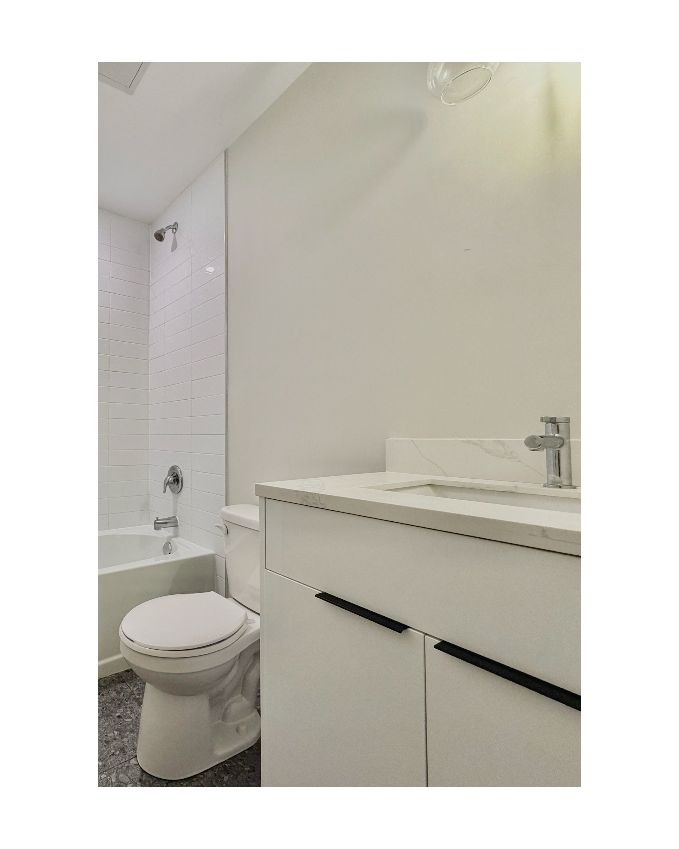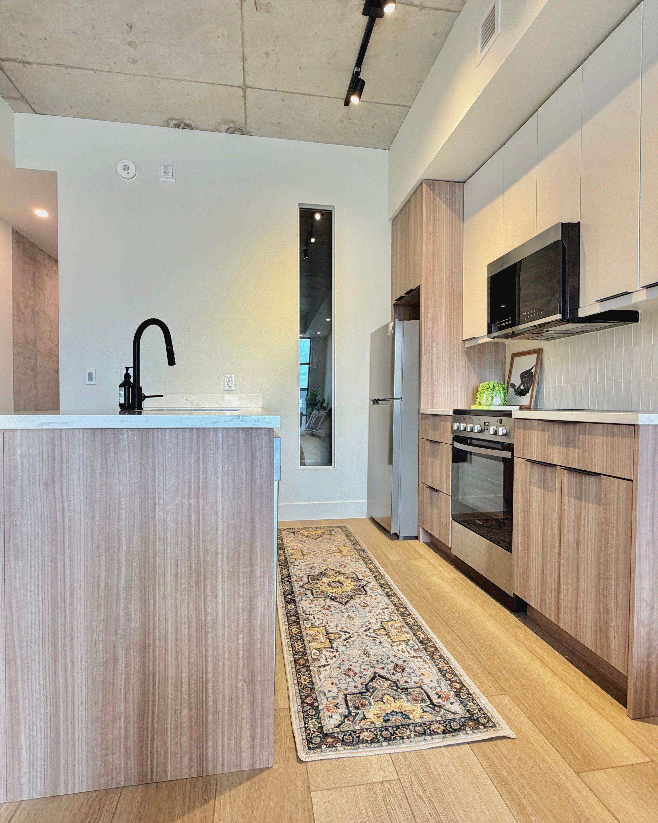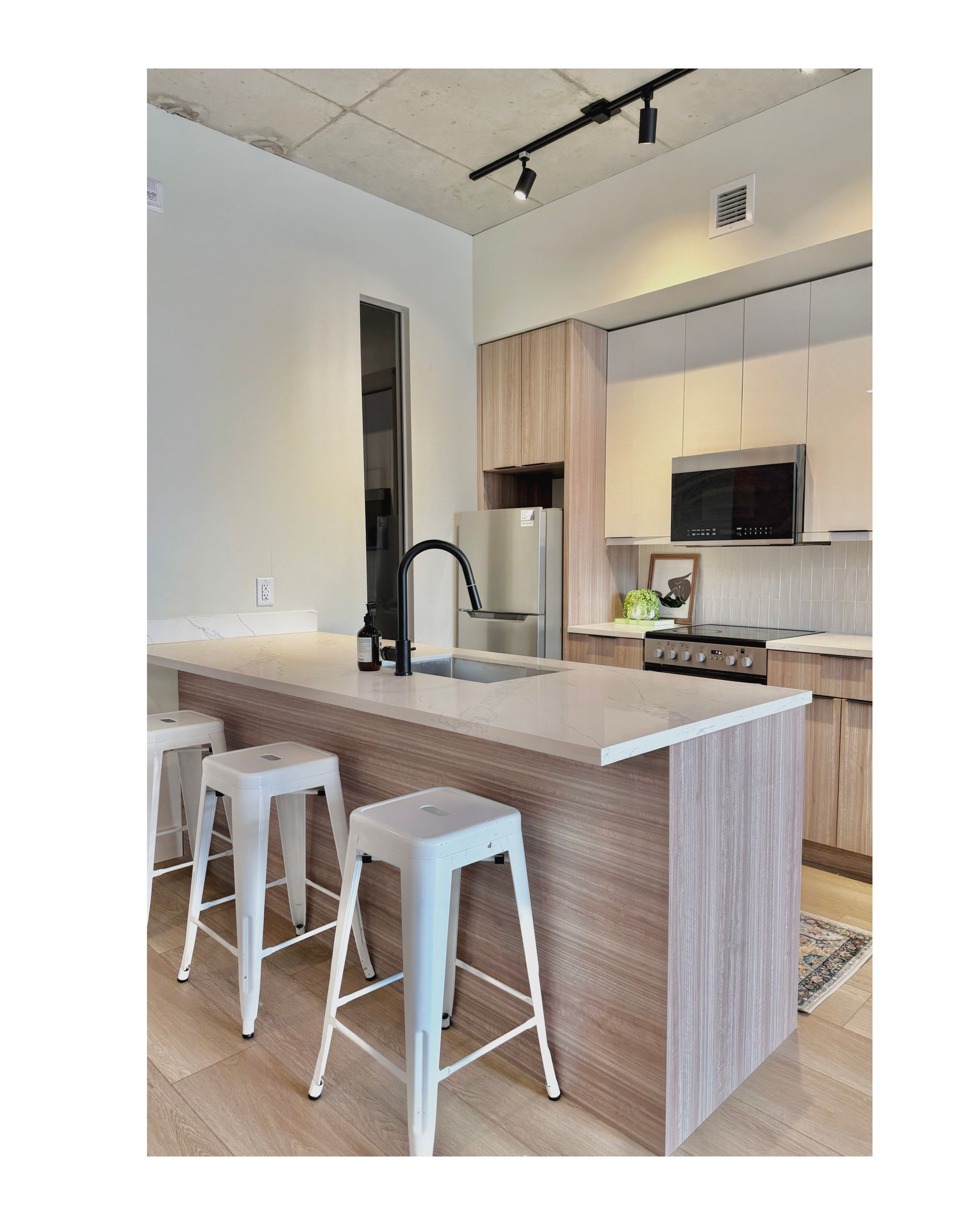 • Stylish kitchen with quartz countertops and stainless steel appliances.
