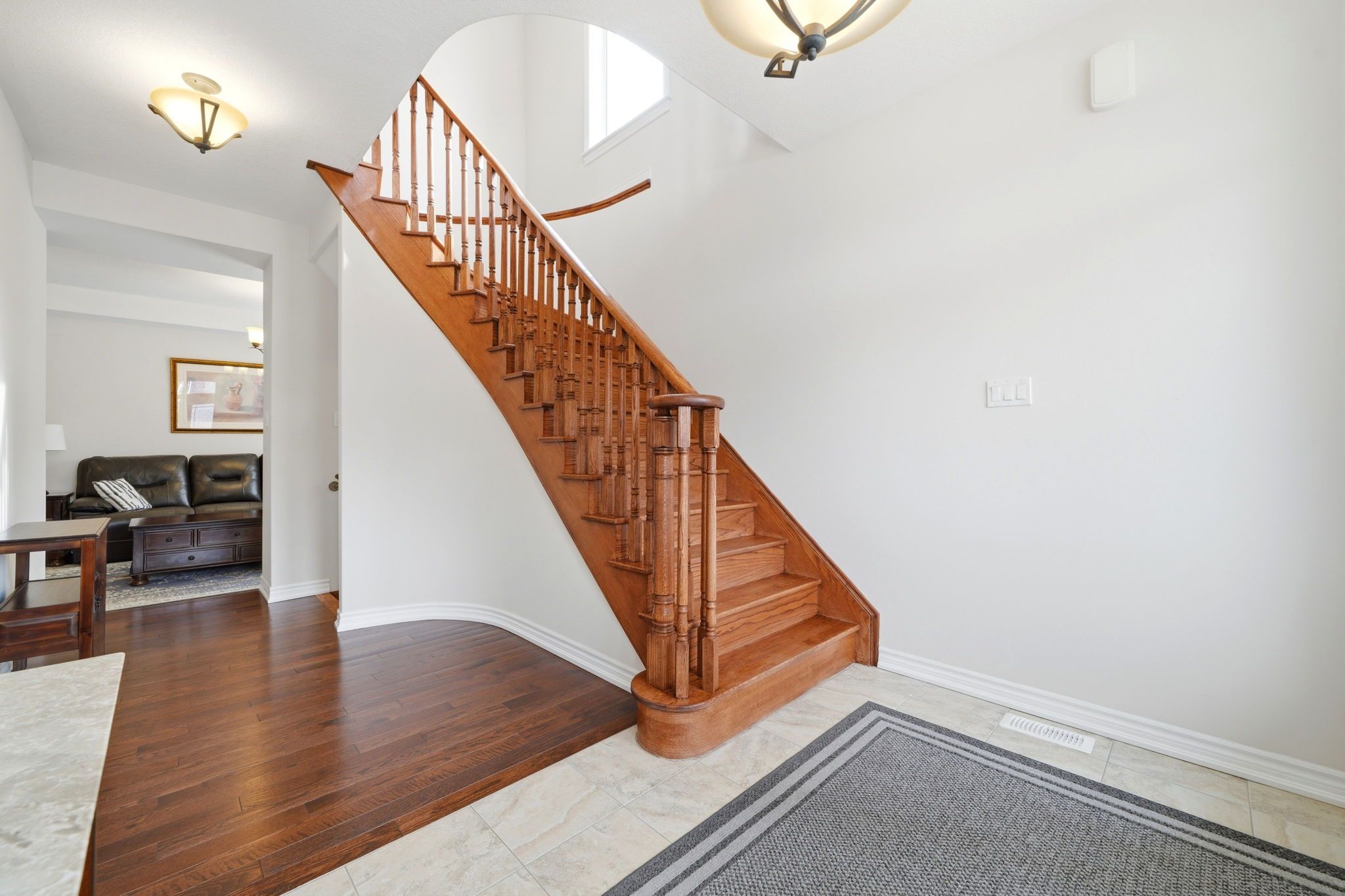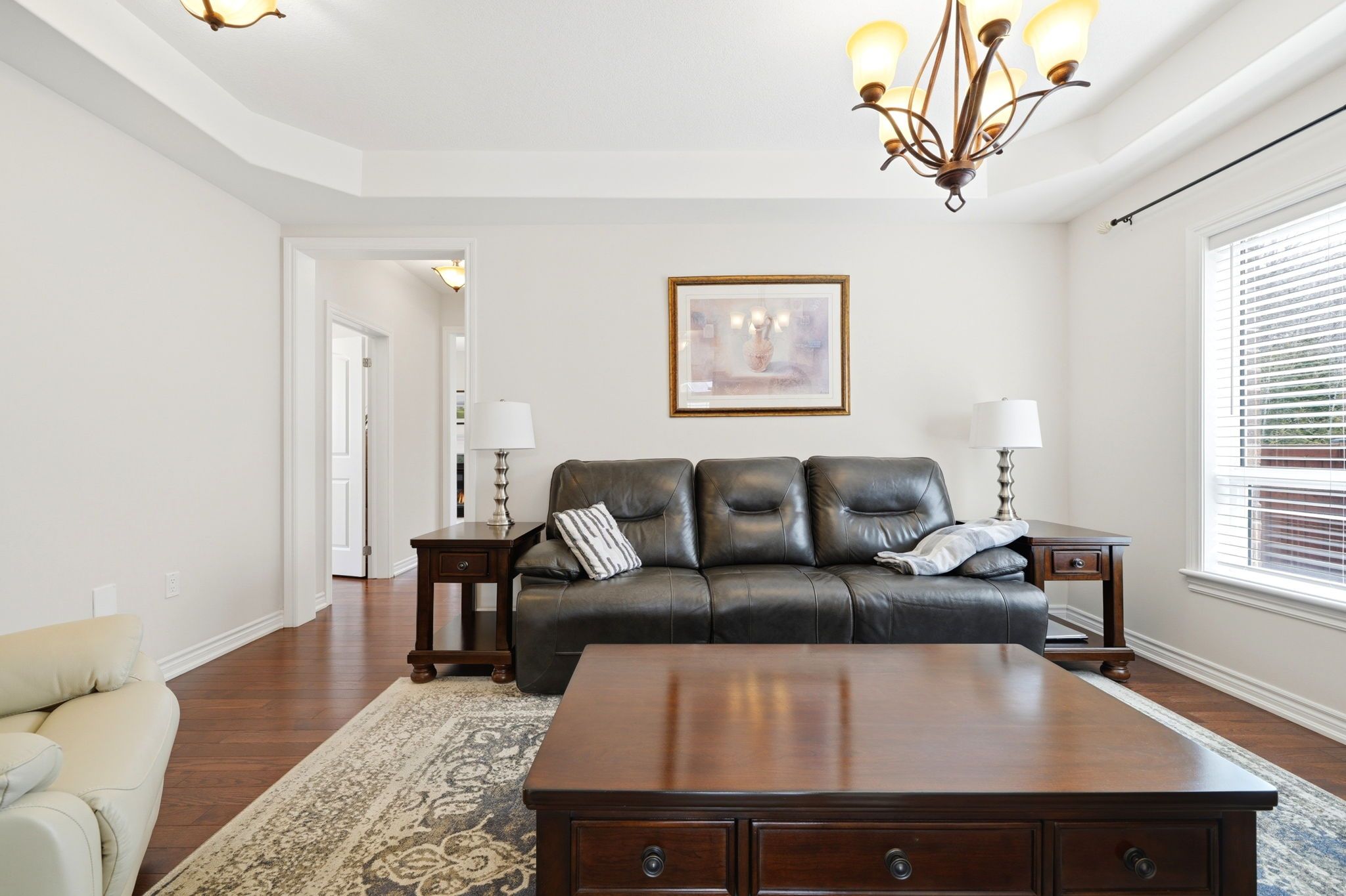• Bright layout with hardwood flooring and an elegant fireplace.