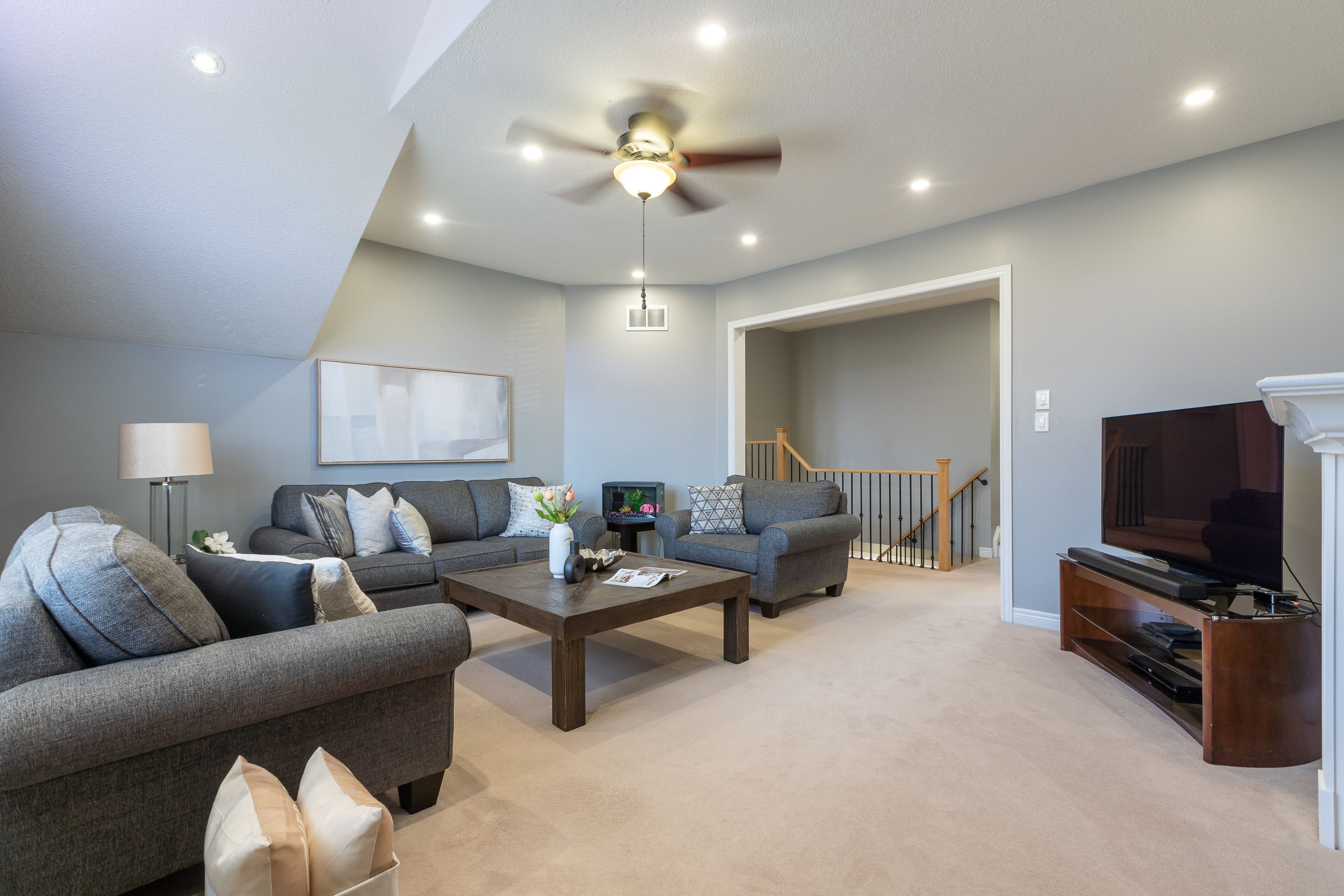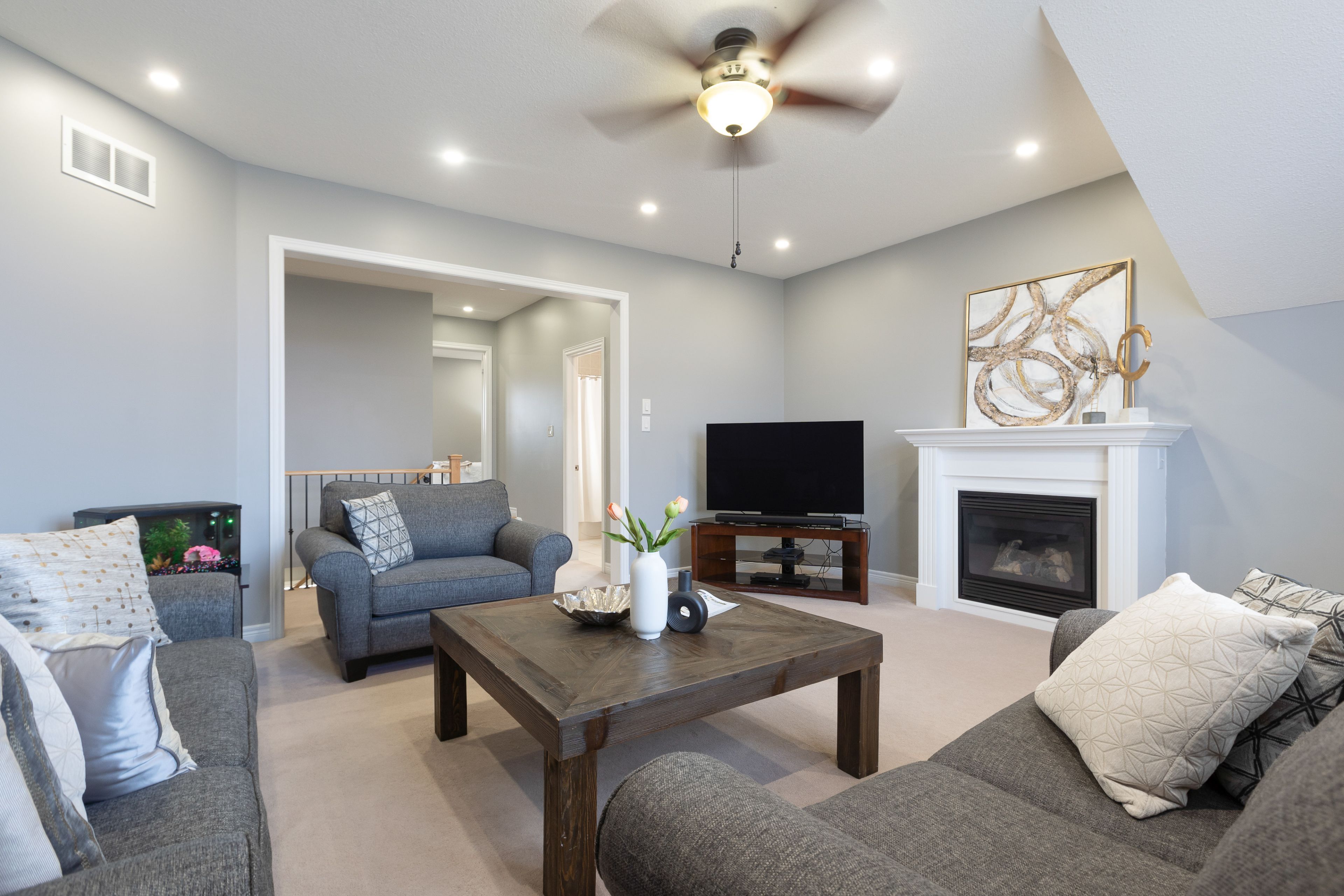 • Inviting family room with gas fireplace and large windows for natural light.