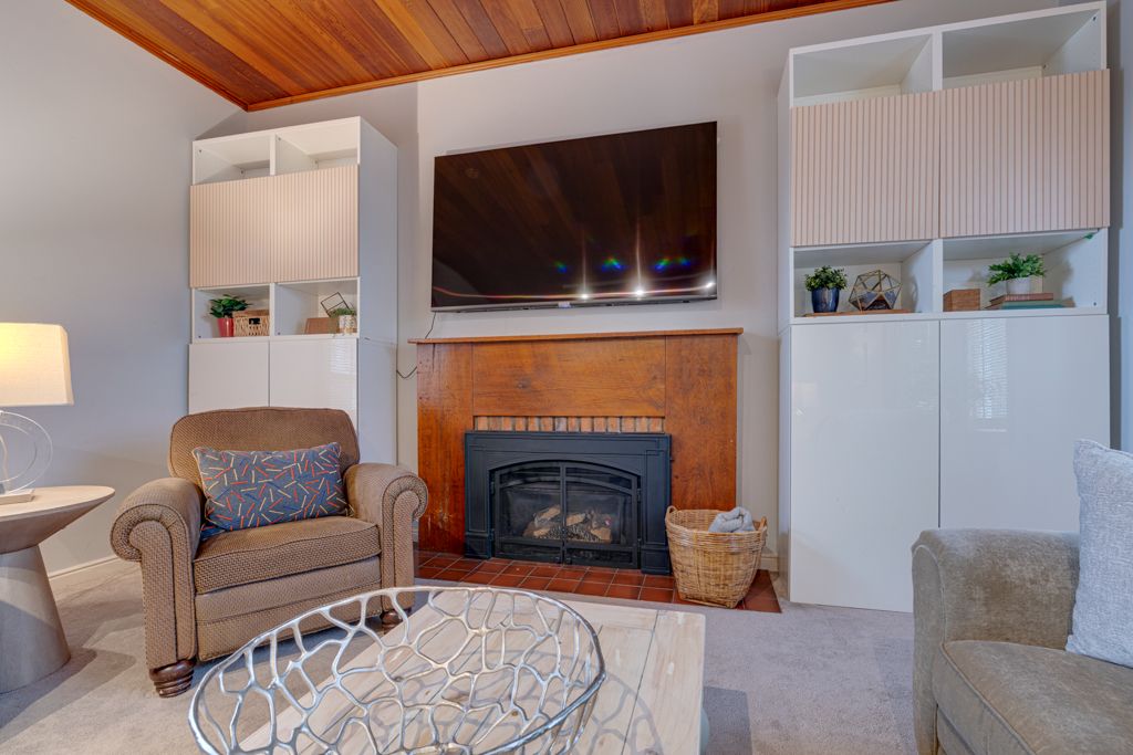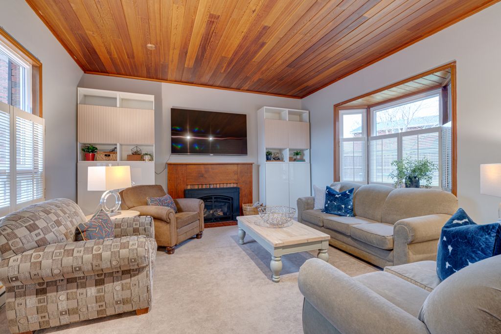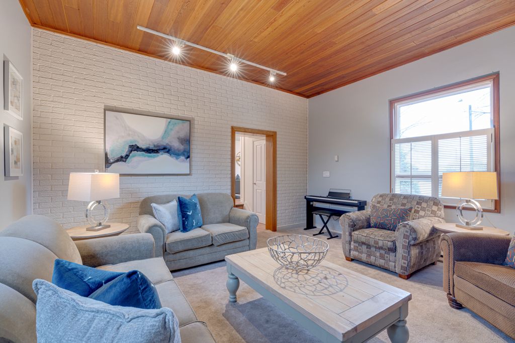 • Cozy family room features gas fireplace and exposed brick wall.